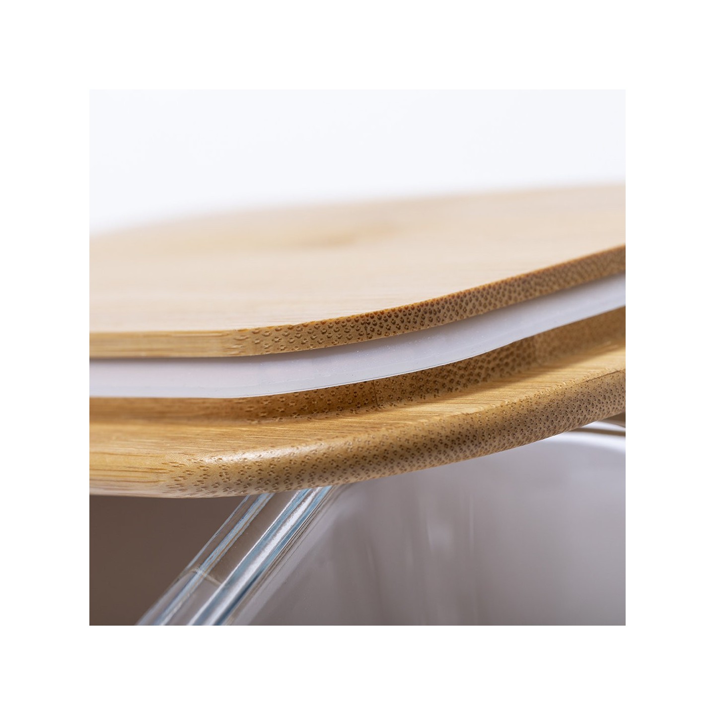 La fiambrera cuenta con una tapa hermética de bambú pulido, que no solo garantiza la conservación de los alimentos, sino que también agrega un toque natural y sofisticado al diseño. Además, la tapa viene equipada con una banda de goma que evita derrames y permite utilizar la fiambrera como bandeja, brindando comodidad y versatilidad en cada uso.