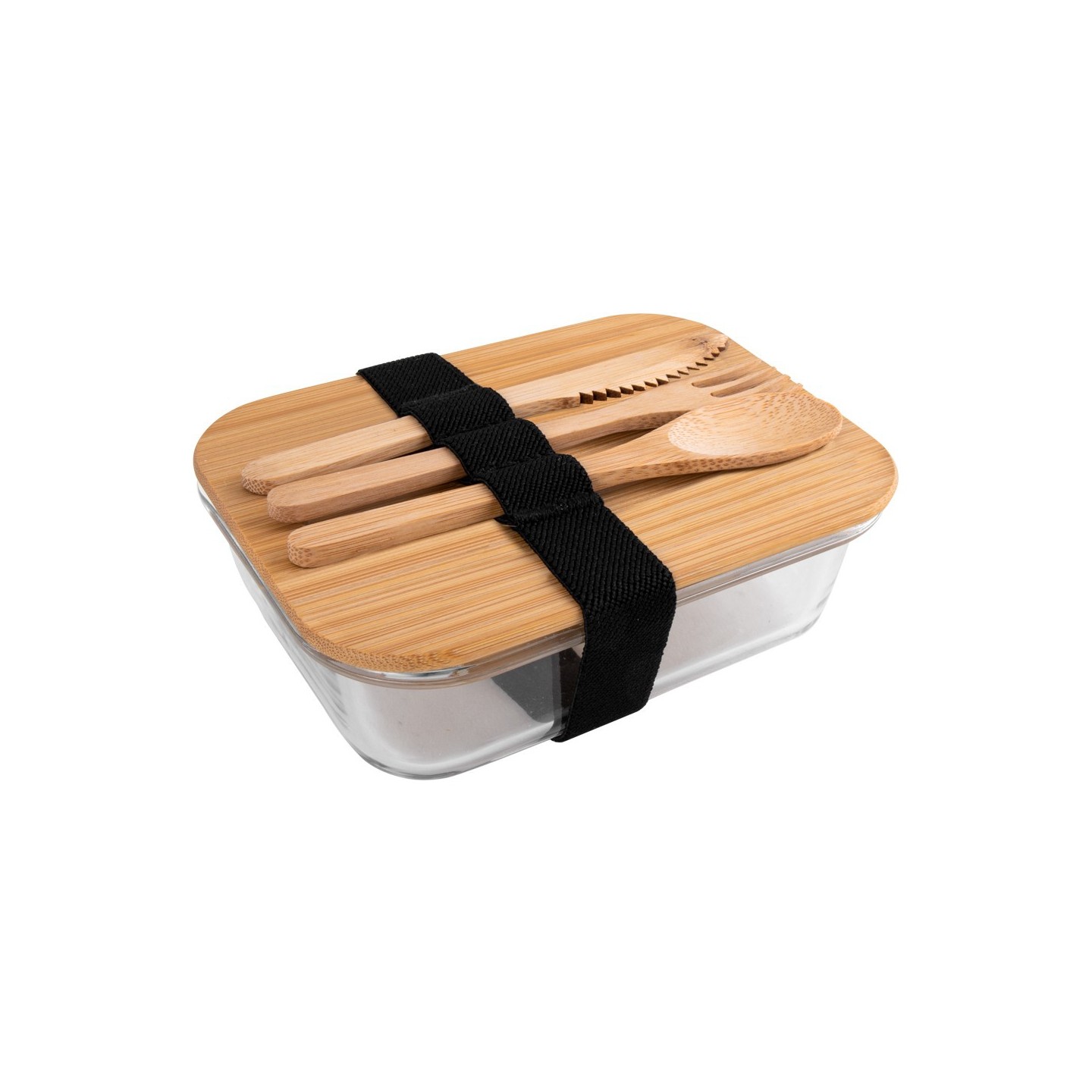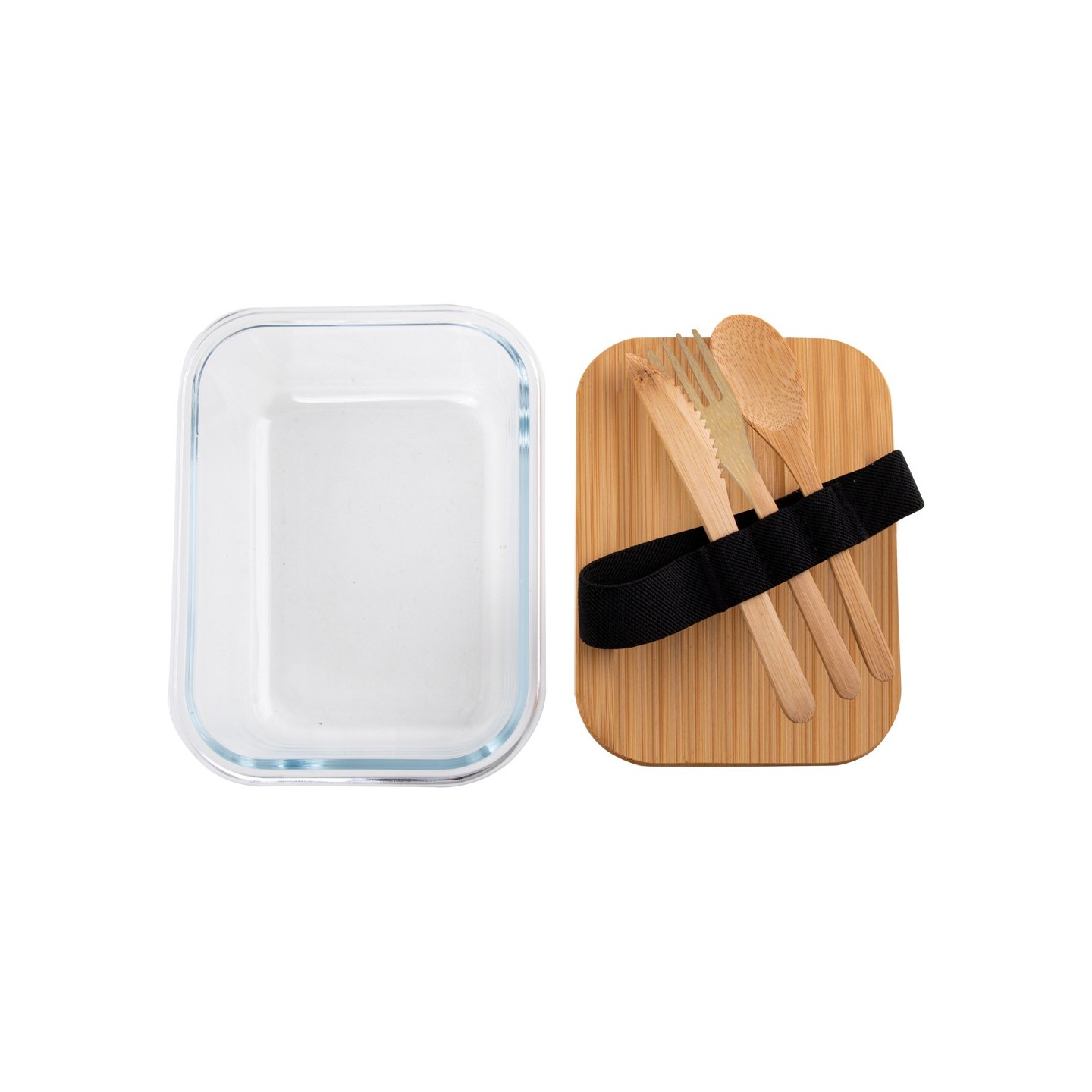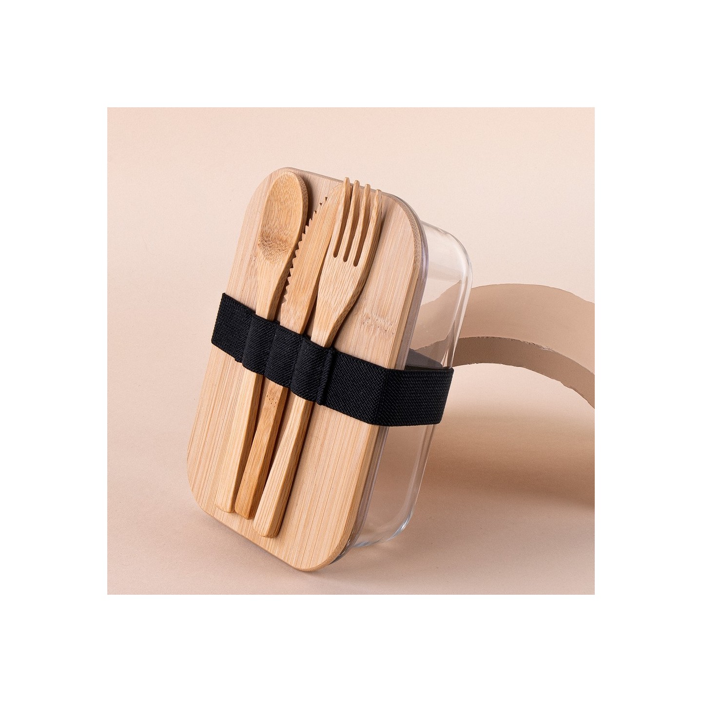 La tapa y los cubiertos de bambú natural se integran de manera armoniosa, sujetos por una banda elástica que no solo añade un toque decorativo sino que también asegura la practicidad y el orden en tus comidas. Este detalle funcional se convierte en un símbolo de diseño innovador y organización en tu día a día.
