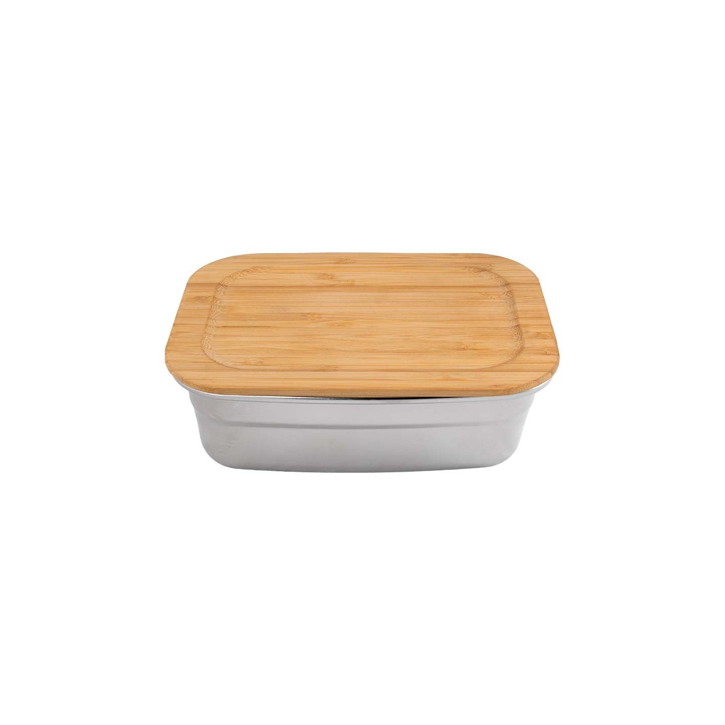 La Fiambrera Peach es de acero inoxidable 304, tapa y cubiertos de bambú. Cierre con cinta elástica, 600 ml. Elegancia y sostenibilidad para tus comidas diarias.