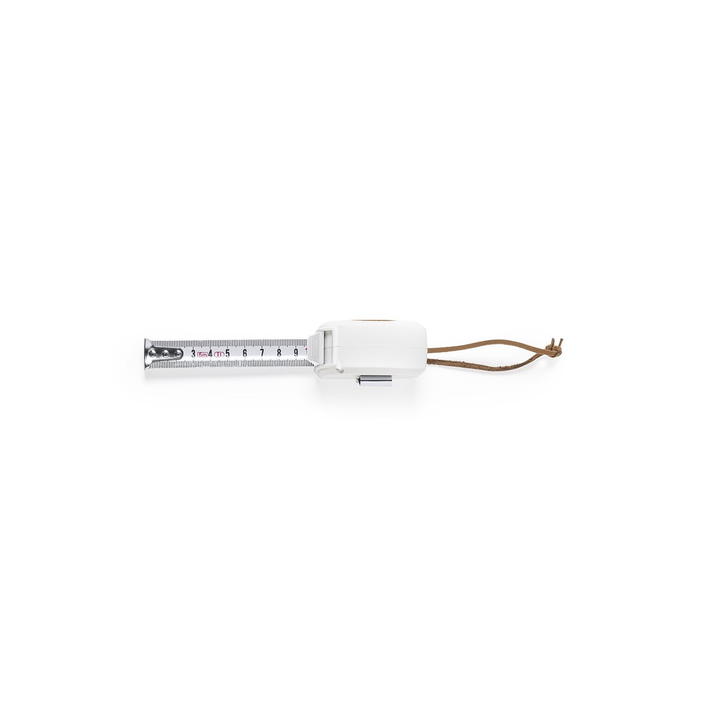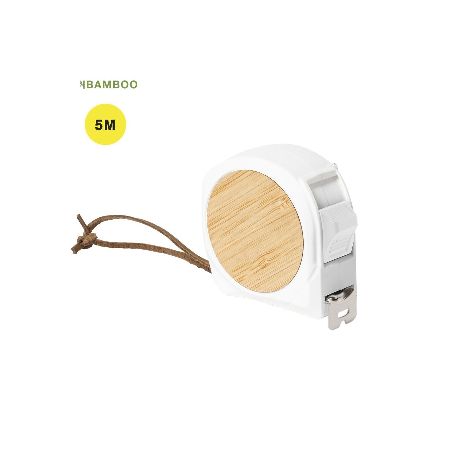 El Flexómetro Hermy 5m lleva línea nature de bambú y ABS, hoja metálica con freno, clip metálico, cinta de transporte en PU. Personalizable y en caja eco.