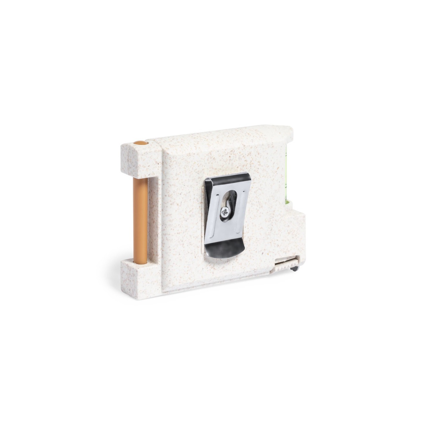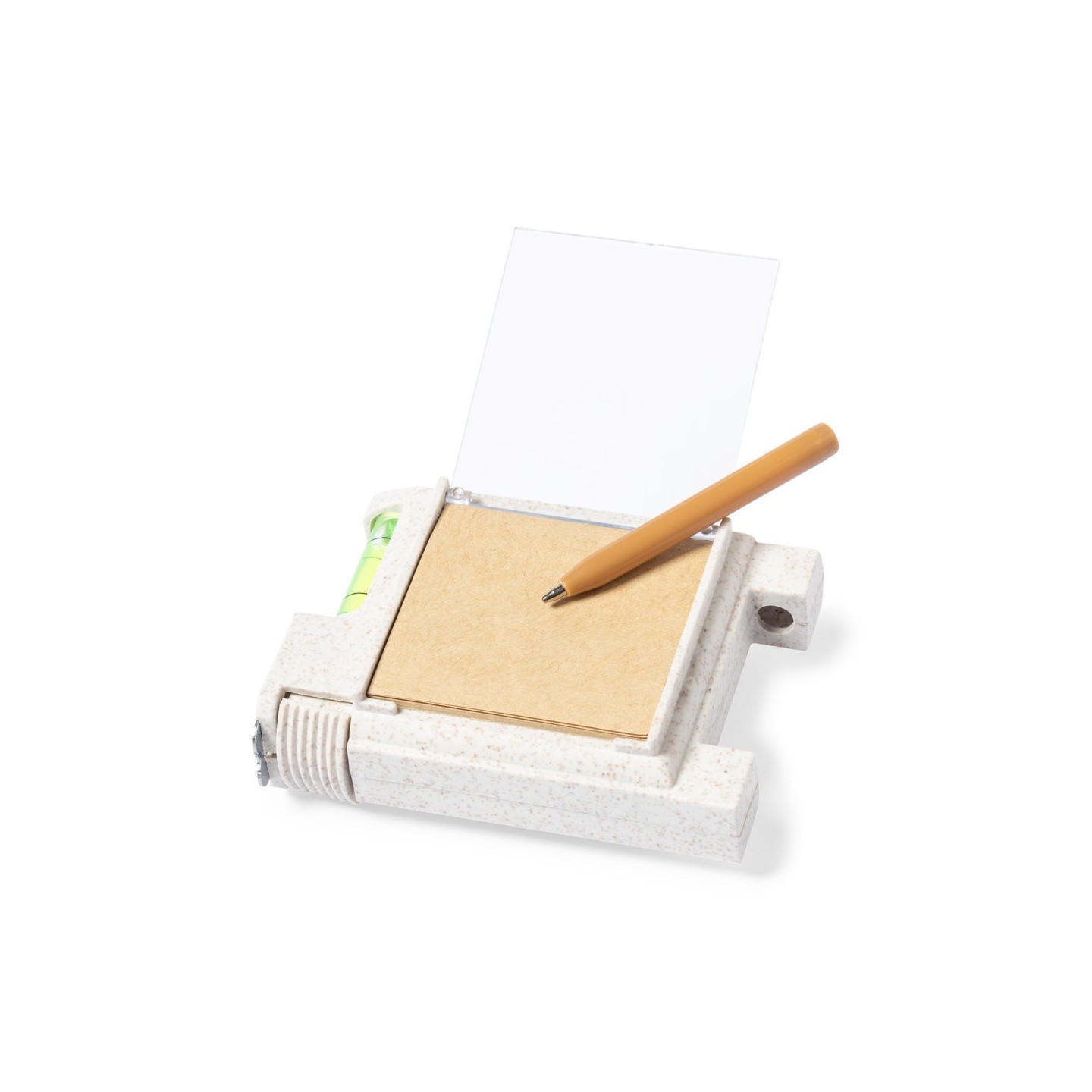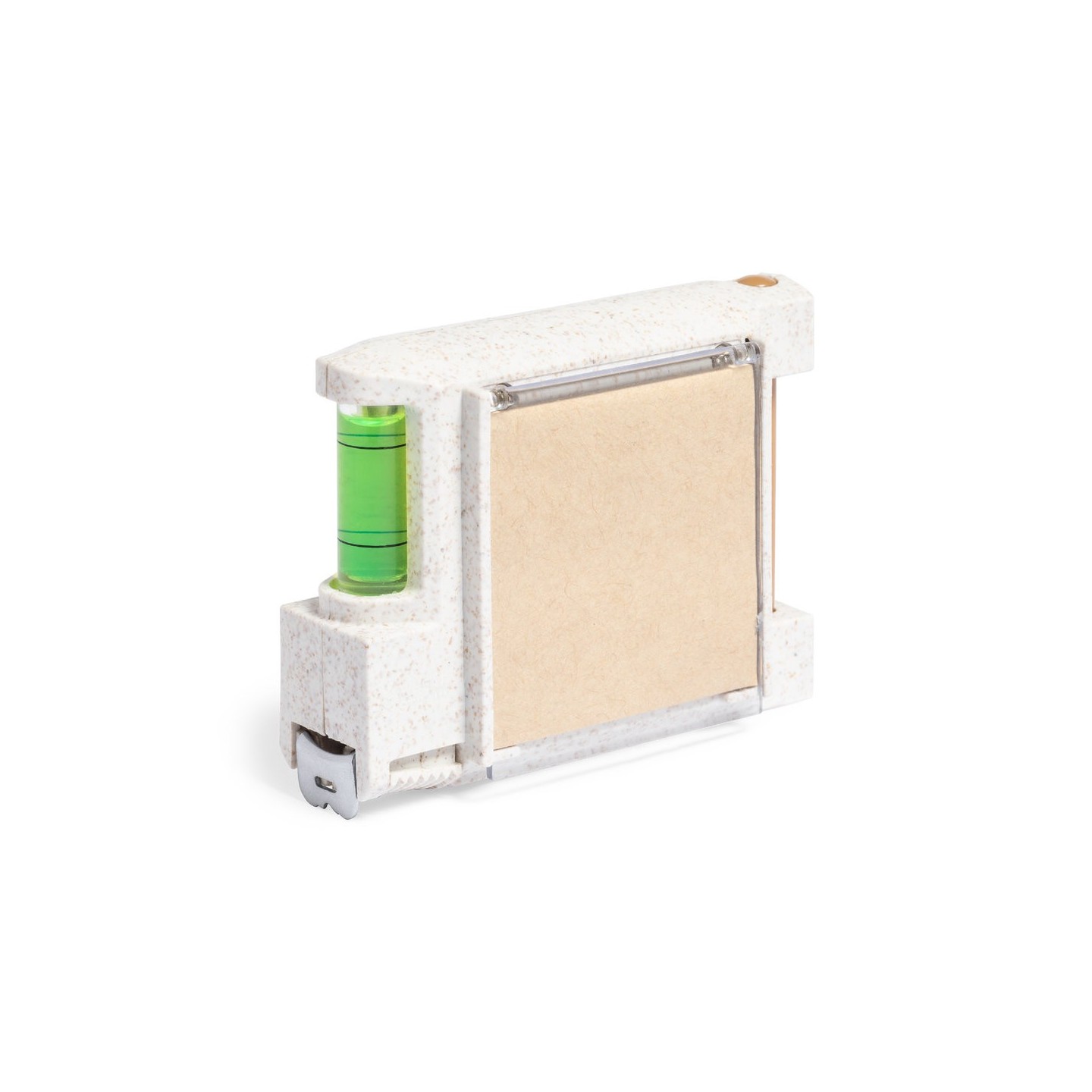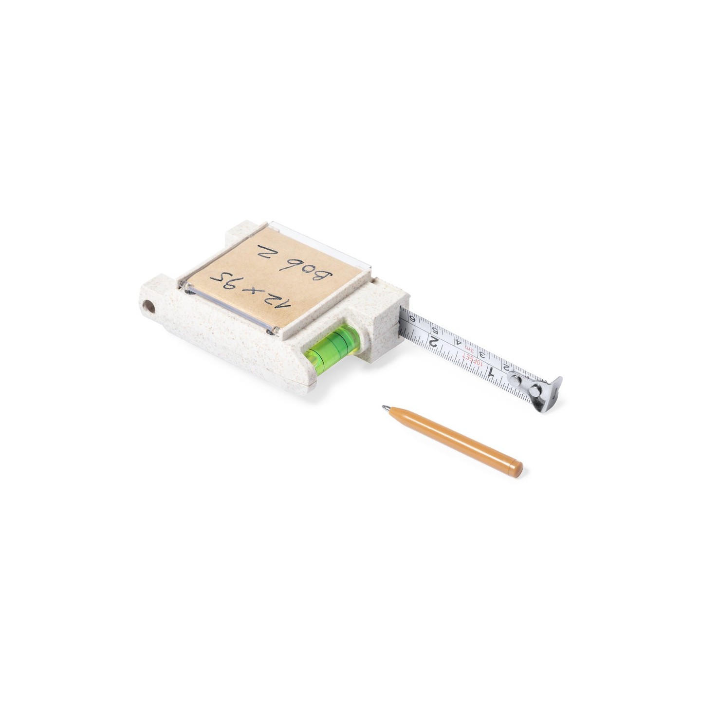 EL Flexómetro Multifunción Sanwel 3m tiene una carcasa de caña de trigo, nivel, soporte bolígrafo y notas adhesivas. Funcionalidad sostenible en un diseño compacto.