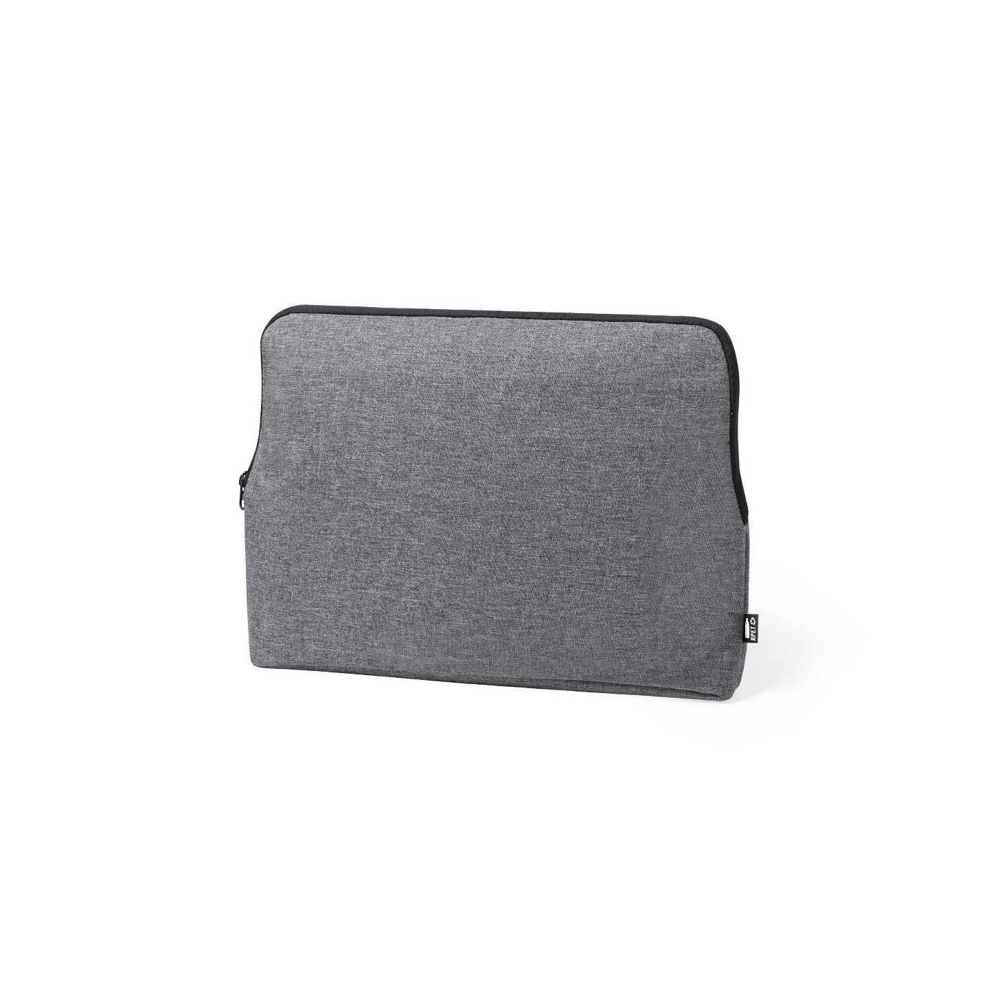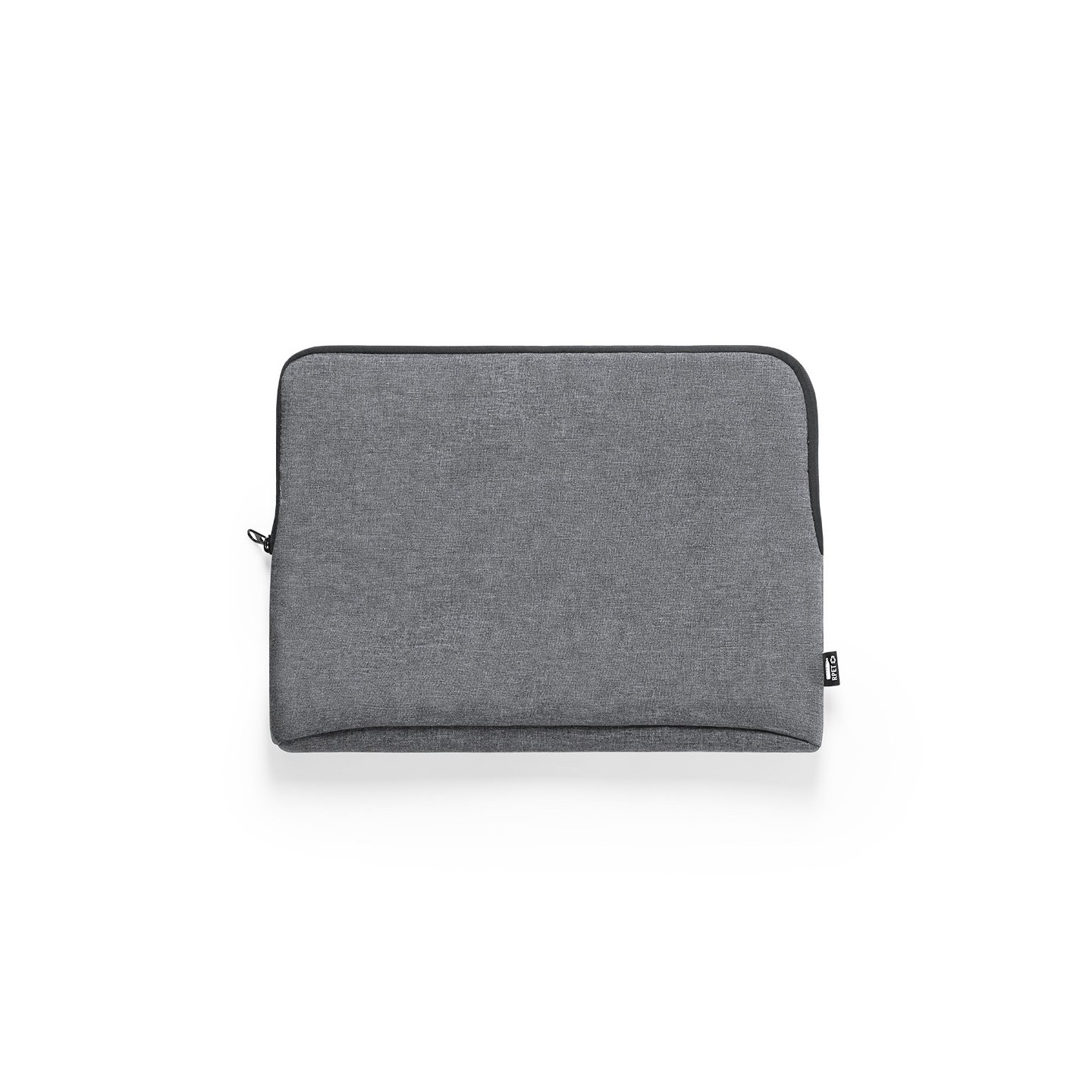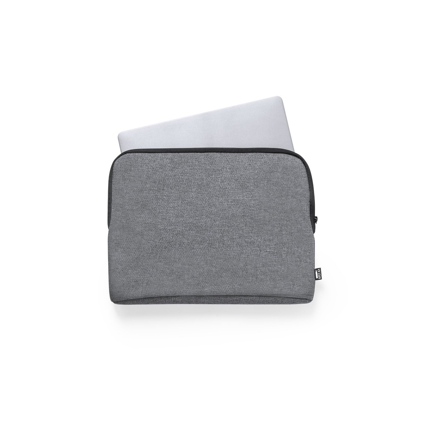 Funda de ordenador portátil Hops, elaborada en resistente 600D RPET efecto melange. Interior totalmente acolchado y forrado. Detalles en negro y cierre de cremallera.