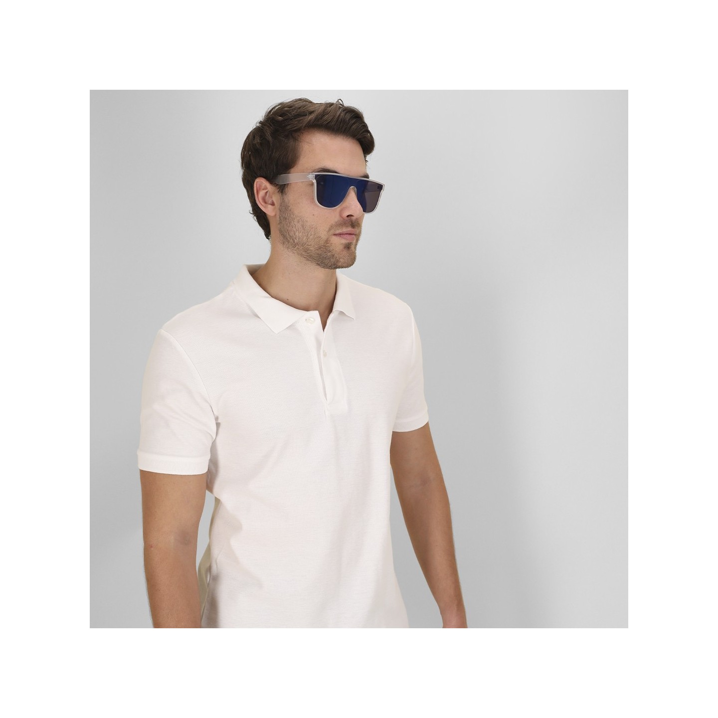 Gafas de sol CHICK con lentes azul espejo y protección UV400. Montura translúcida moderna, ligeras y personalizables con tu logotipo. Estilo y protección en un solo producto.