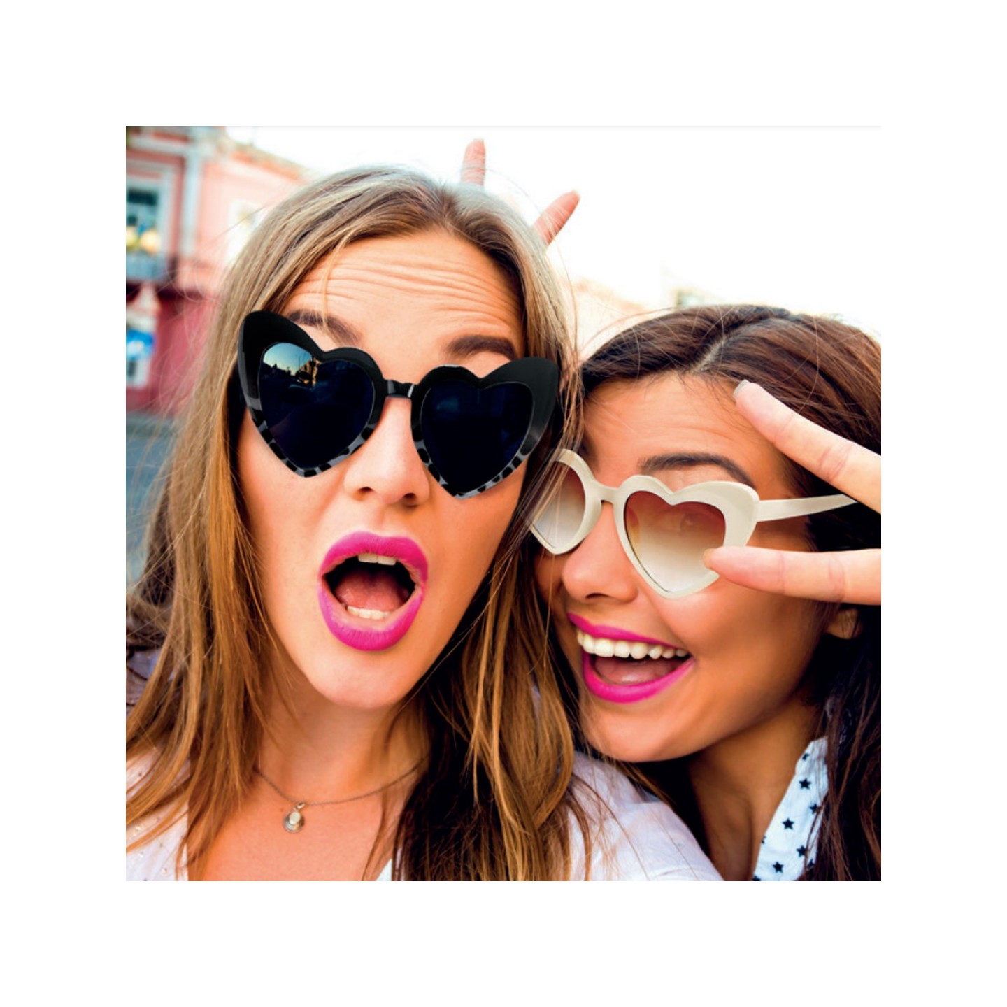 Gafas de sol originales en forma de corazón, disponibles en dos modelos: Alana (blanco-marrón) y Regina (negro-negro). Personalizables con tu logotipo