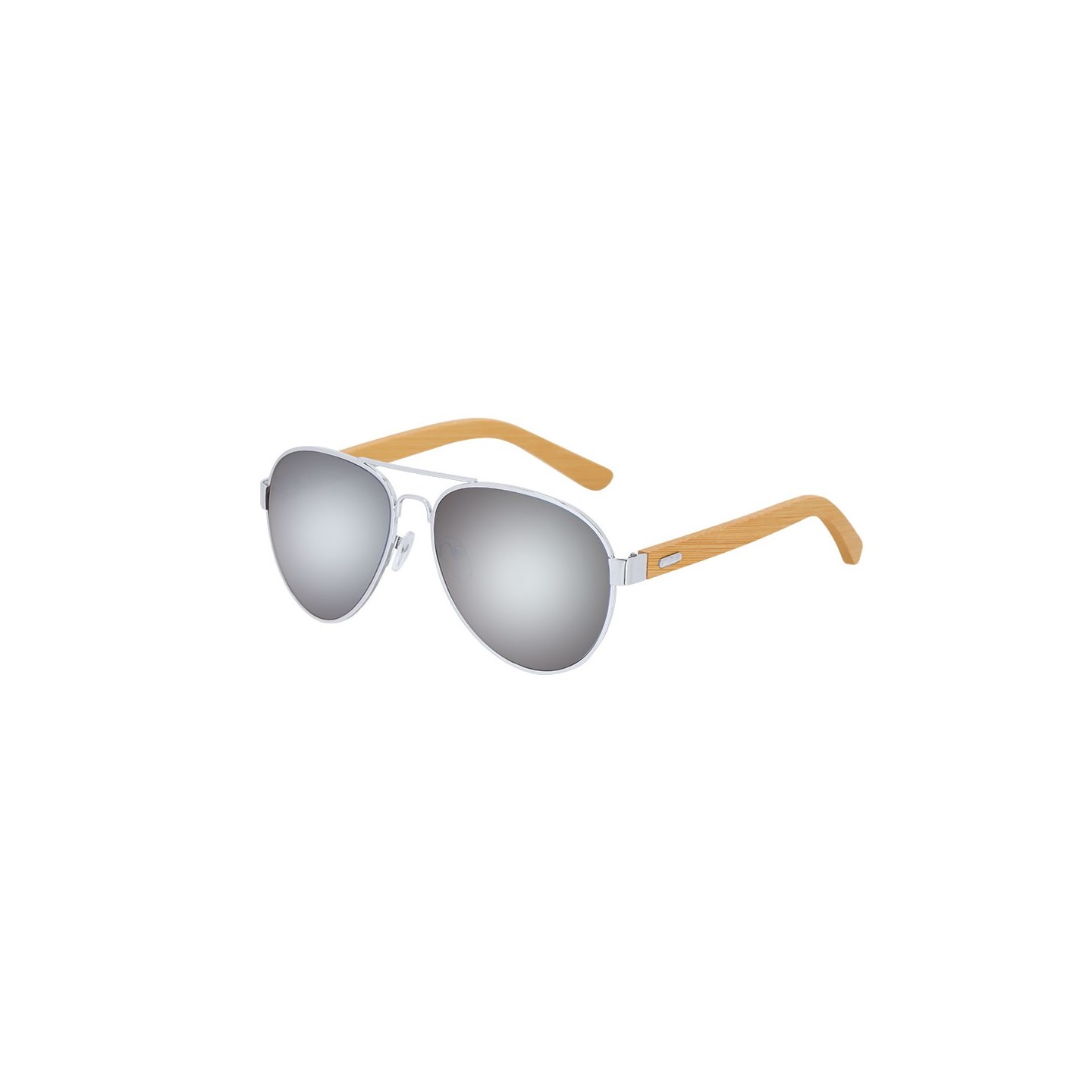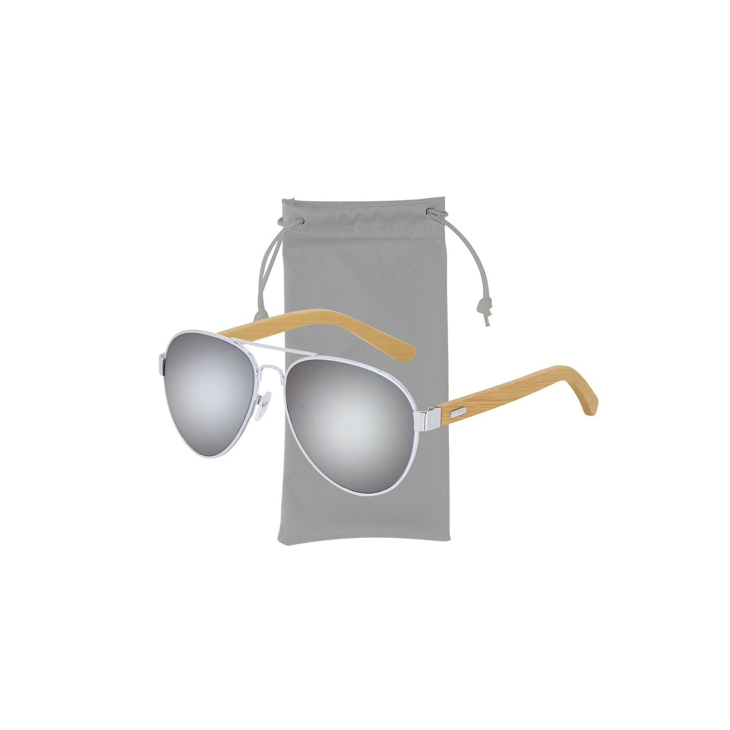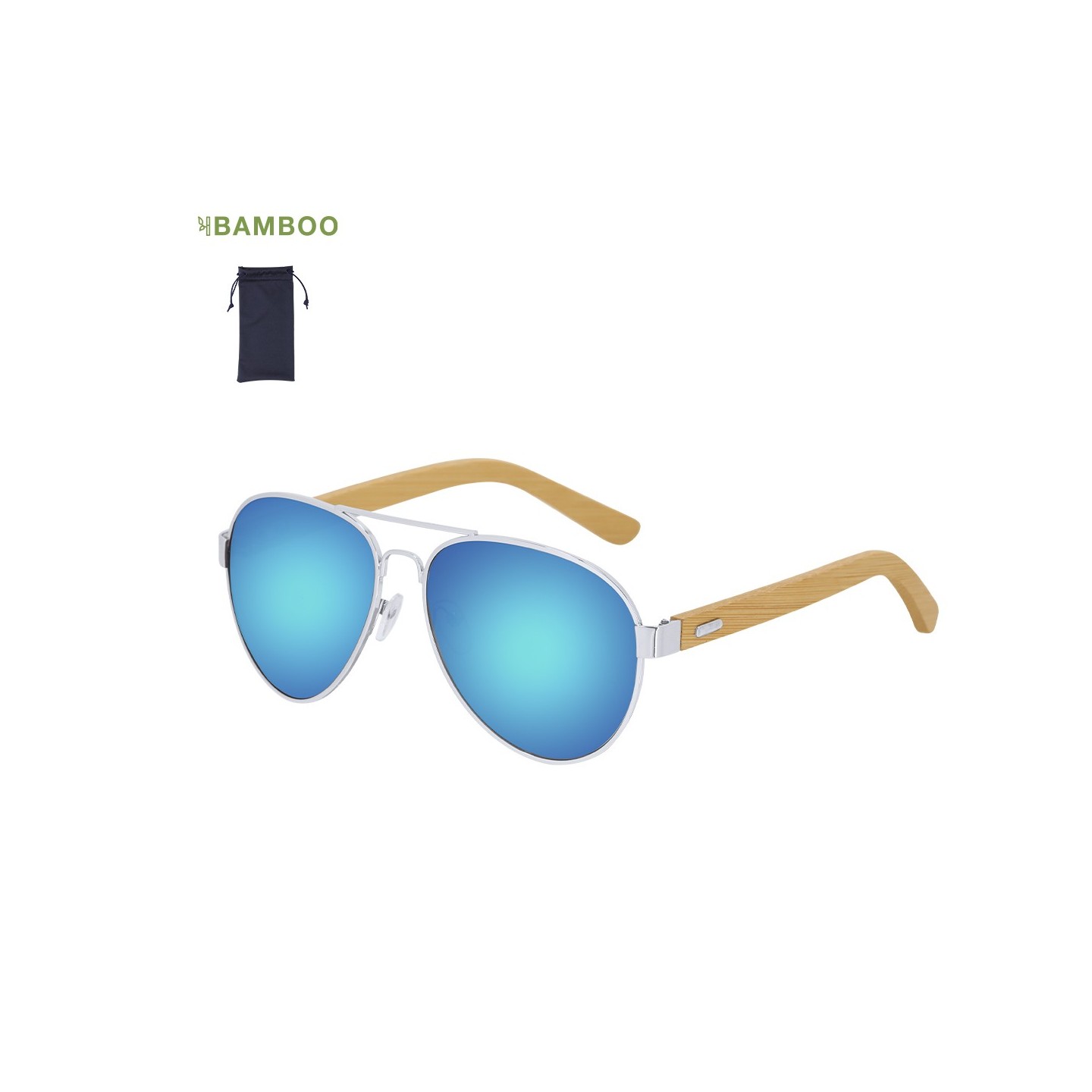 Gafas de sol GUNOK con lentes espejo y protección UV400. Varillas de bambú natural y montura metálica, personalizables. Elegantes y sostenibles.
