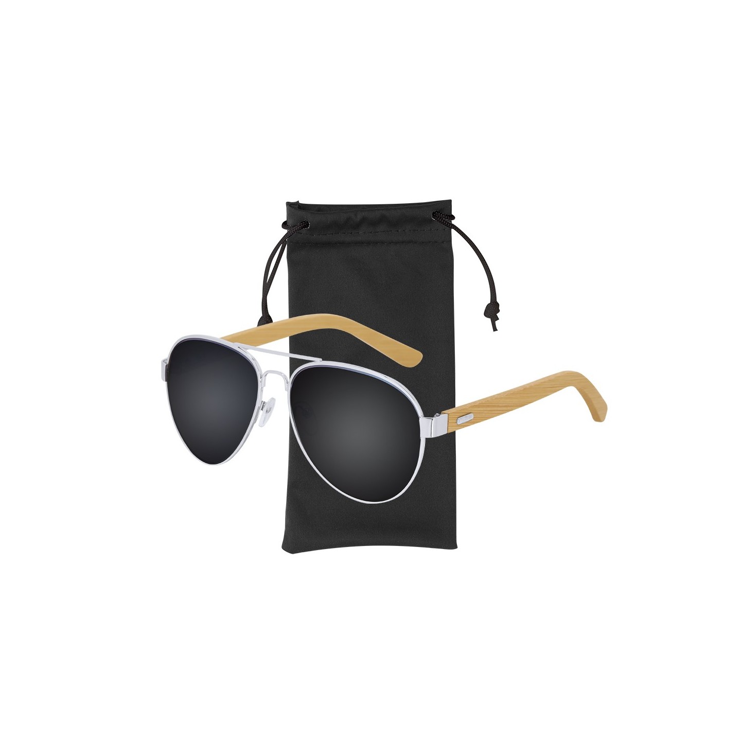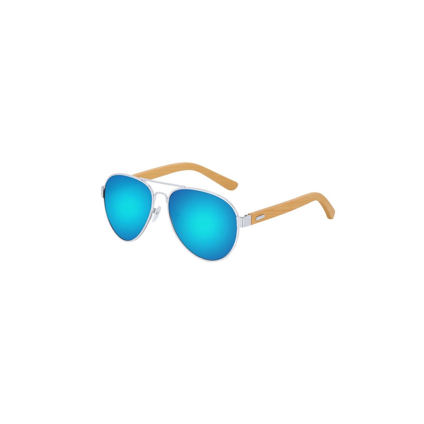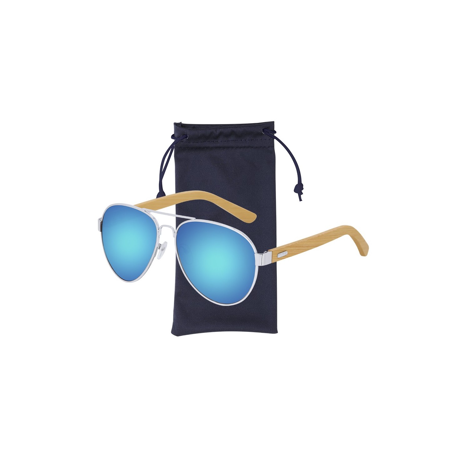 Gafas de sol GUNOK con lentes espejo y protección UV400. Varillas de bambú natural y montura metálica, personalizables. Elegantes y sostenibles.