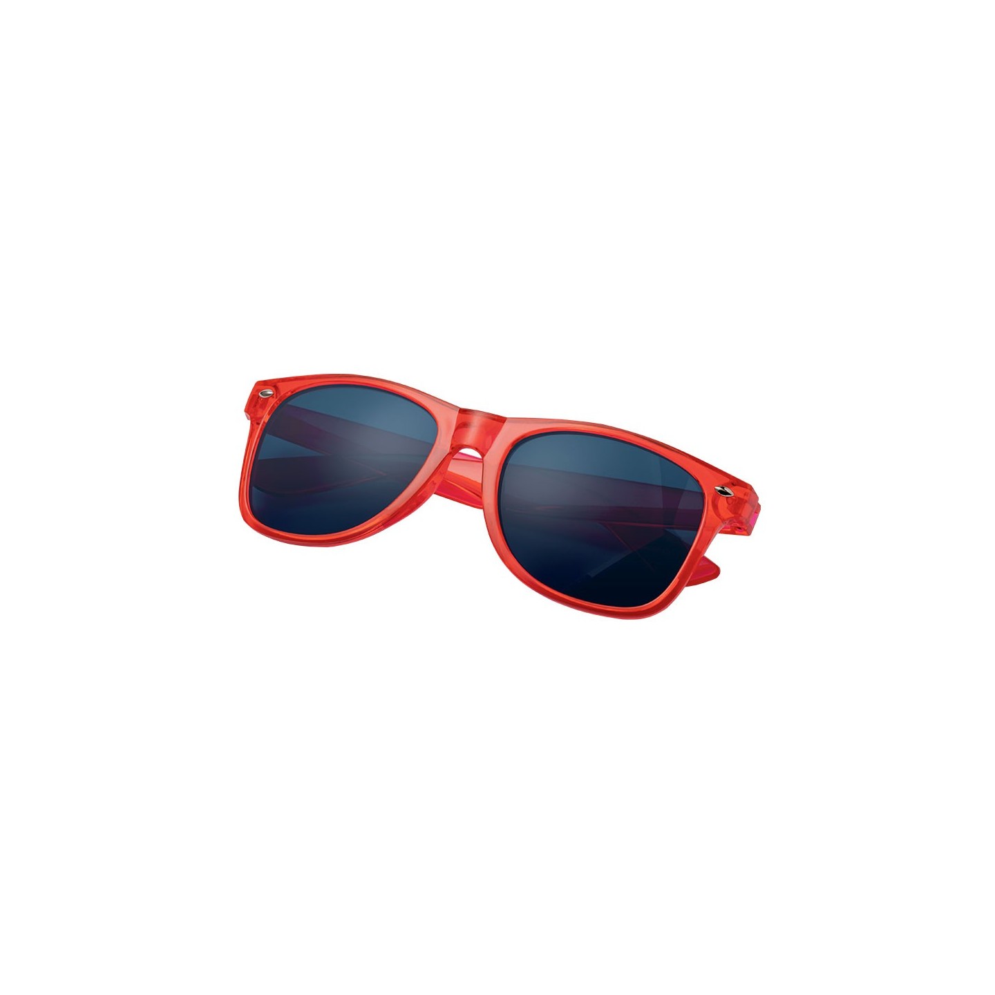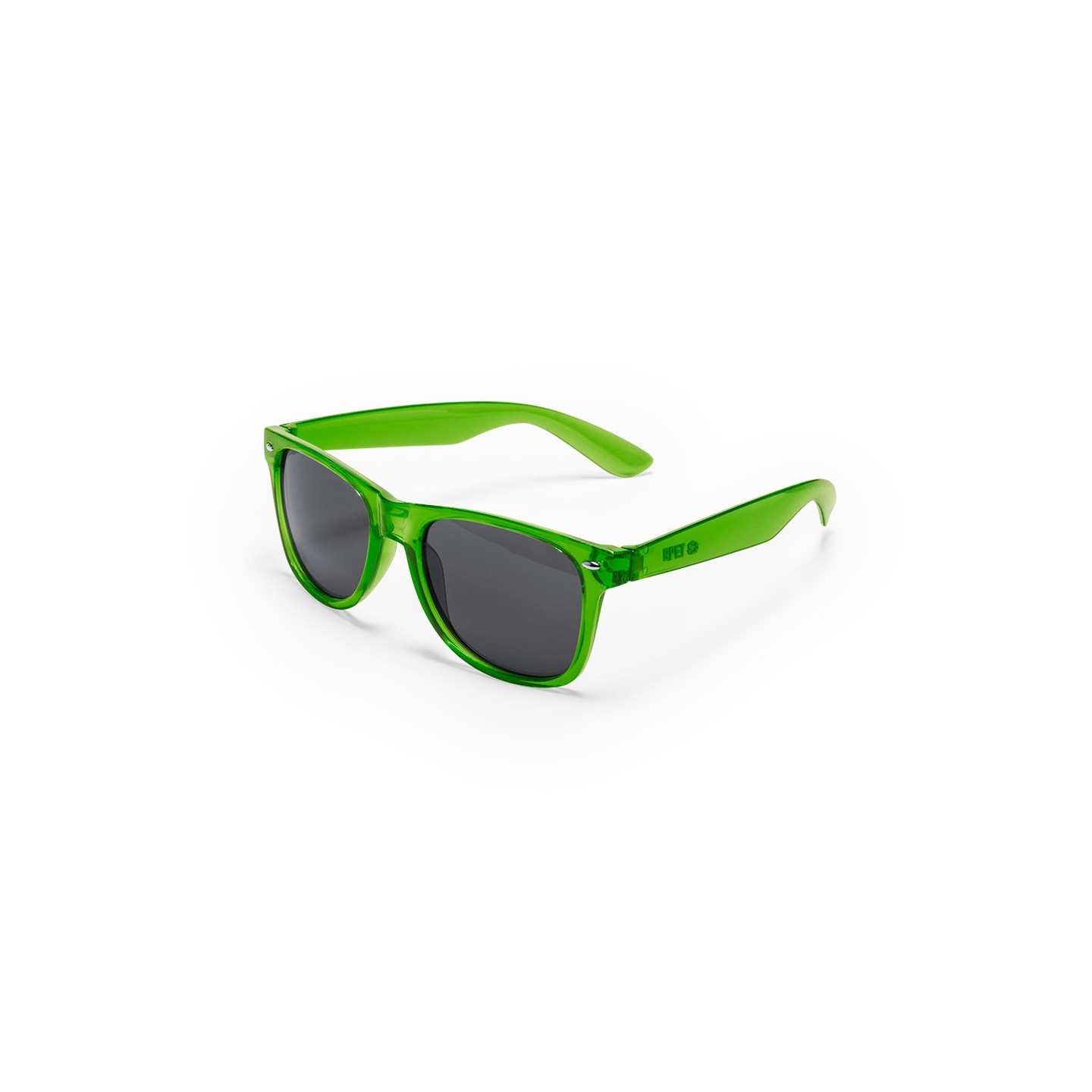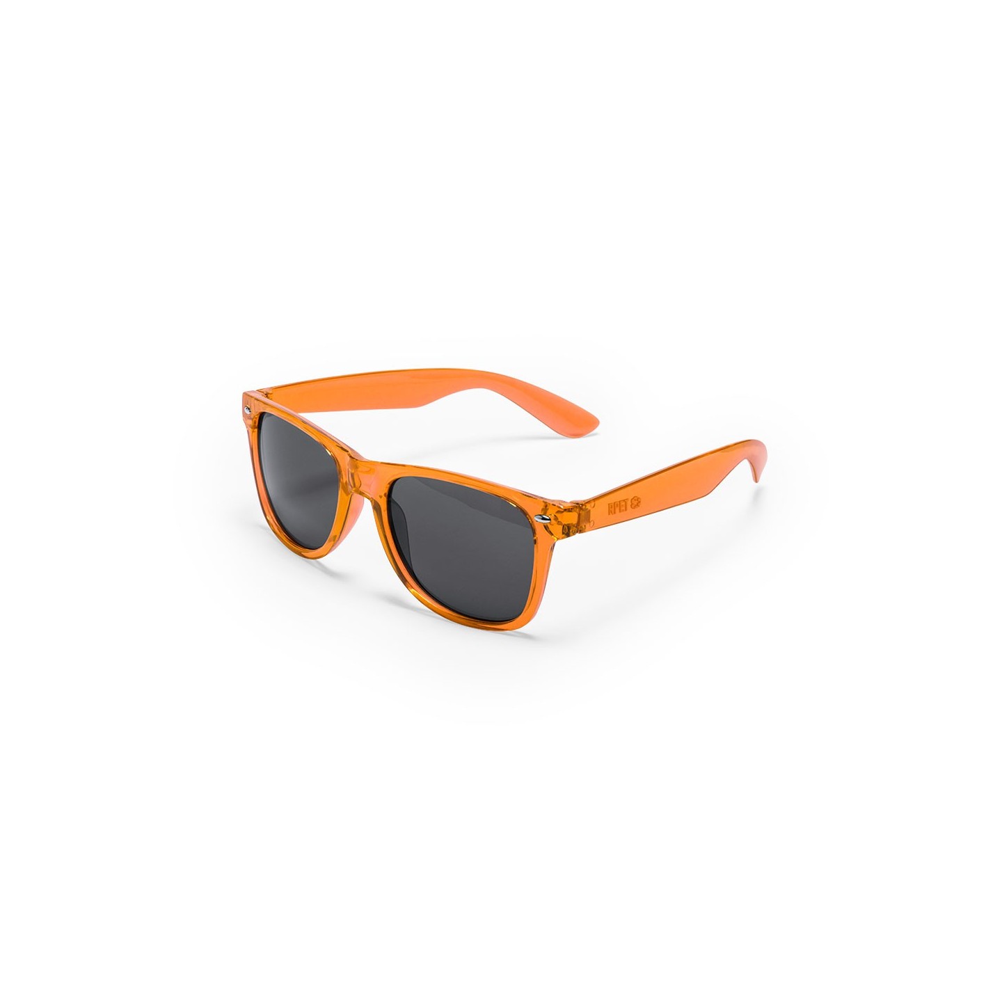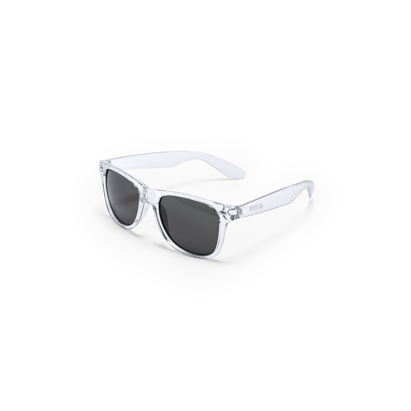 Gafas de sol SKUBIC fabricadas en RPET, con montura translúcida y lentes negras. Protección UV400 y personalizables con tu logotipo. Elegantes y sostenibles.