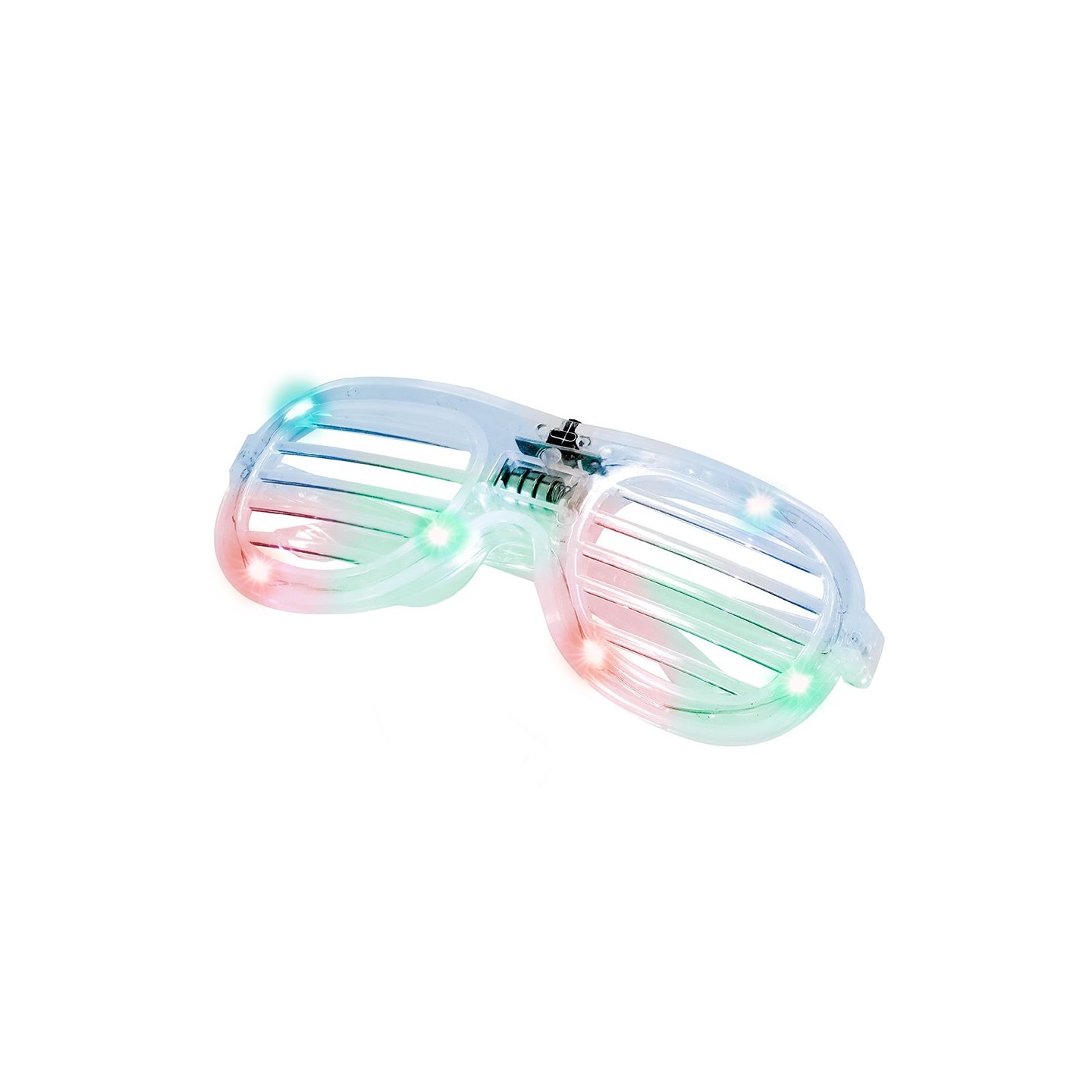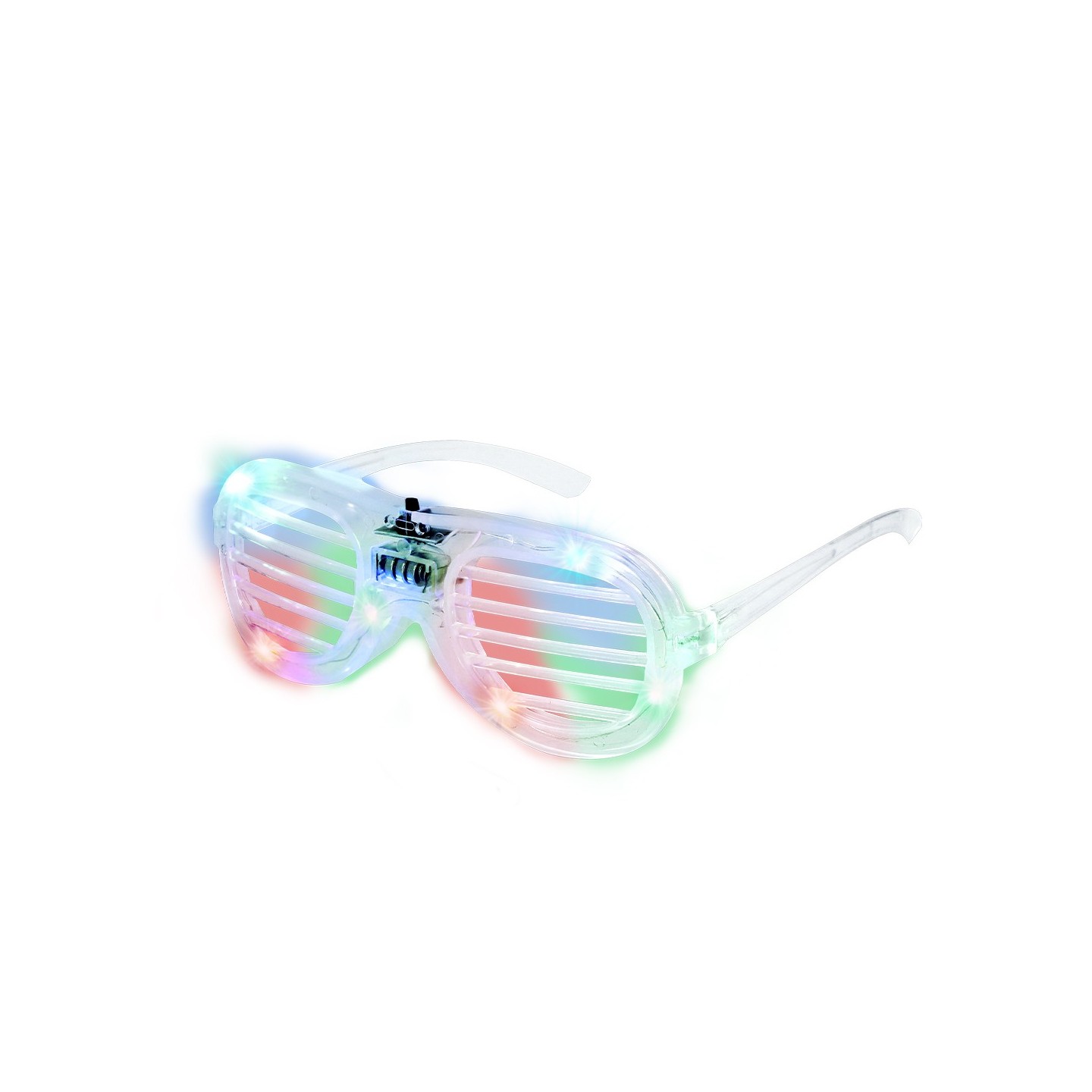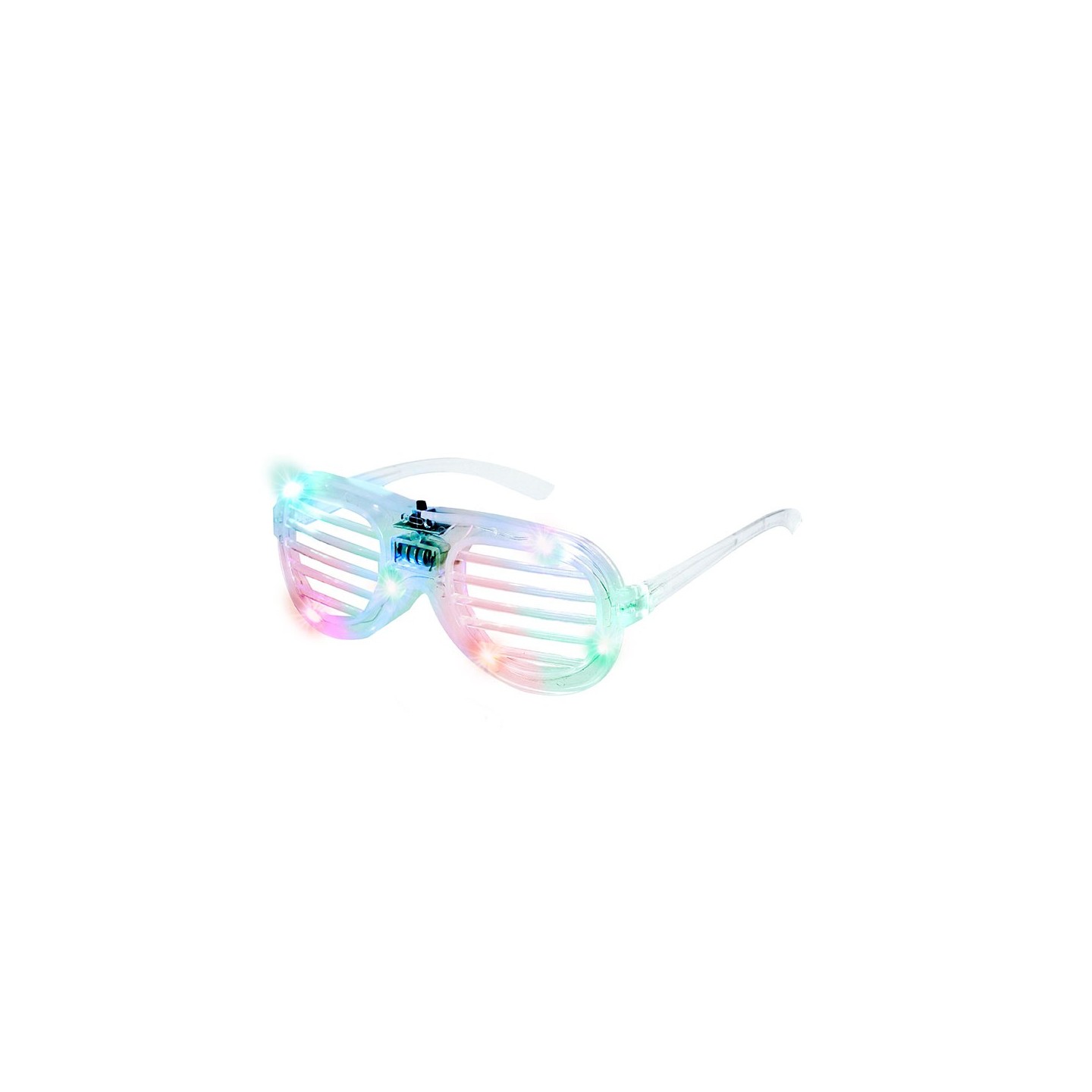 Gafas luminosas con LEDs multicolor, montura transparente y lentes de rejilla. Modo fijo o parpadeo. Personalizables con tu logotipo. ¡Ideal para fiestas y eventos!