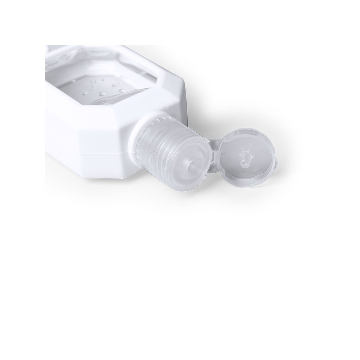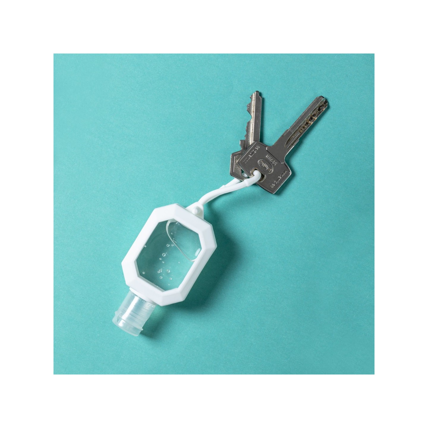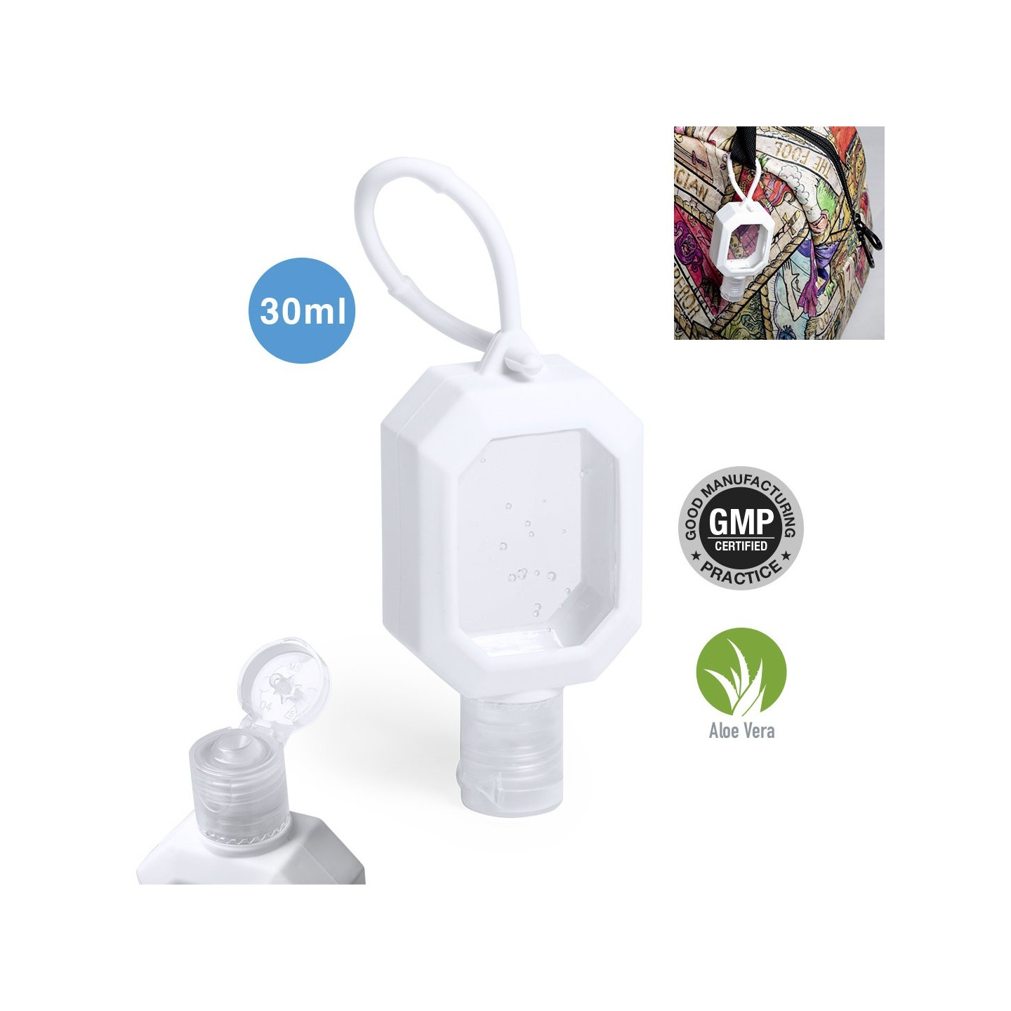 Gel hidroalcohólico de 30 ml con extracto de Aloe Vera. Cuerpo en silicona blanca con dosificador, tapón de seguridad y cordón para transporte. Certificado GMP y cumple normativa 94/62/EC.