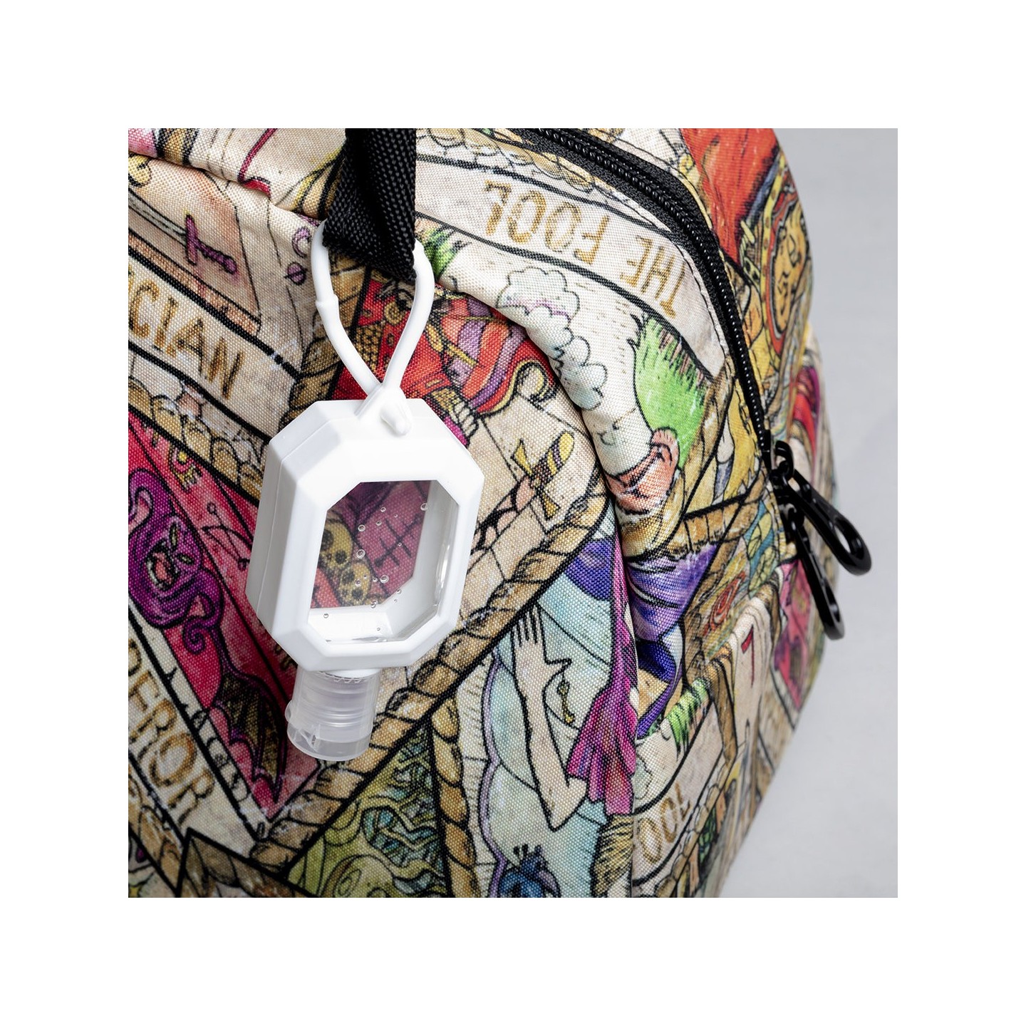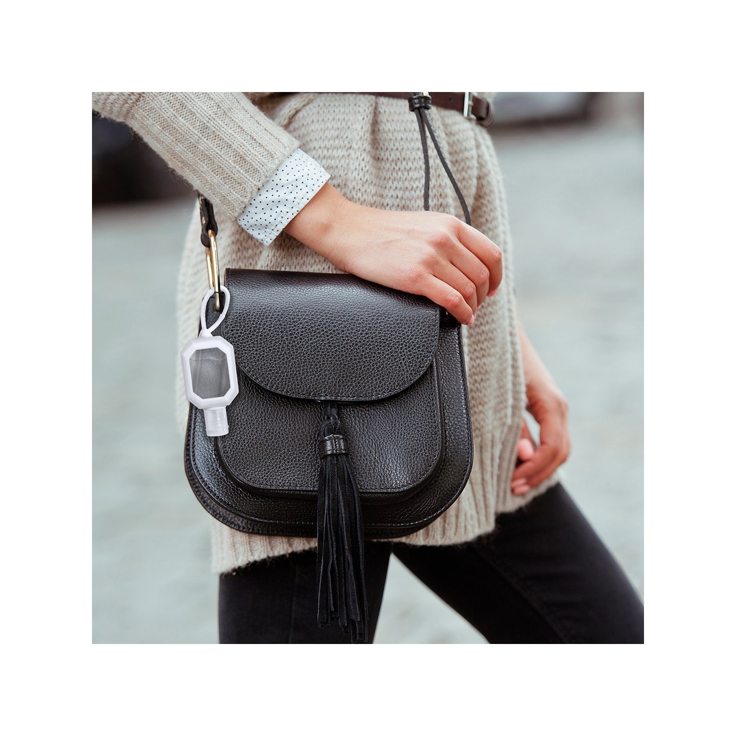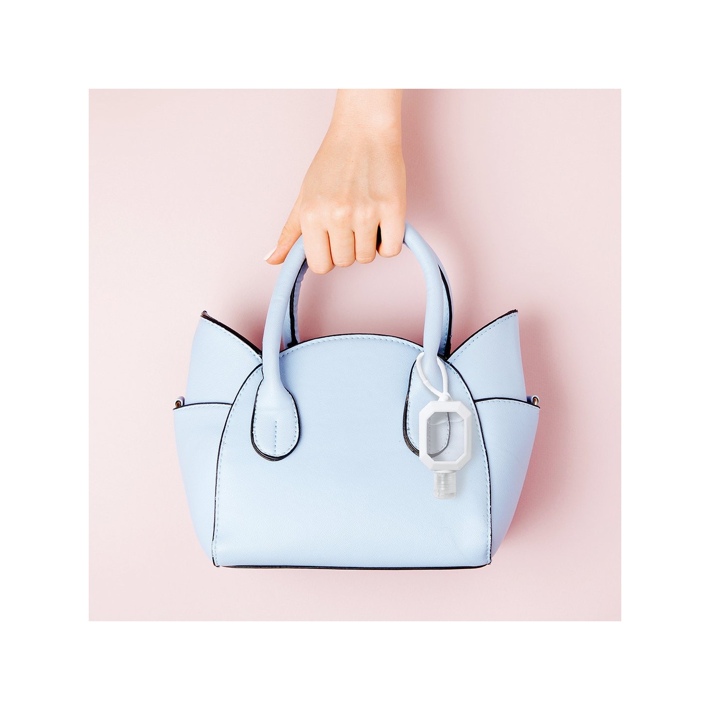 Gel hidroalcohólico de 30 ml con extracto de Aloe Vera. Cuerpo en silicona blanca con dosificador, tapón de seguridad y cordón para transporte. Certificado GMP y cumple normativa 94/62/EC.