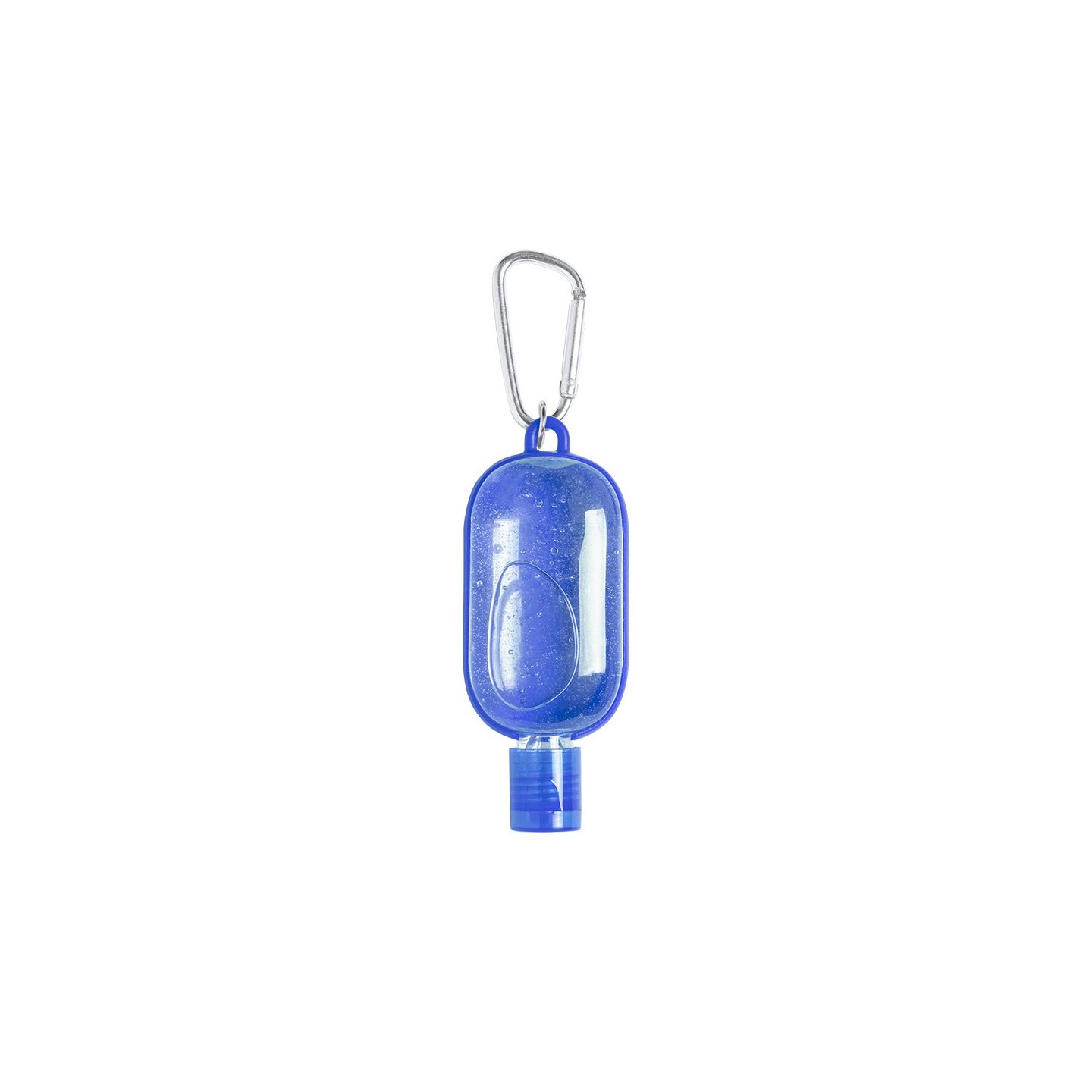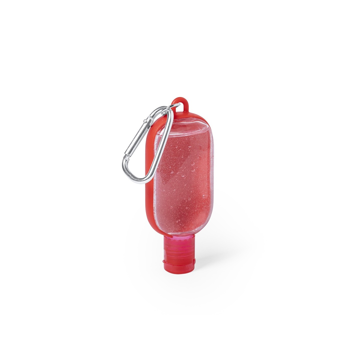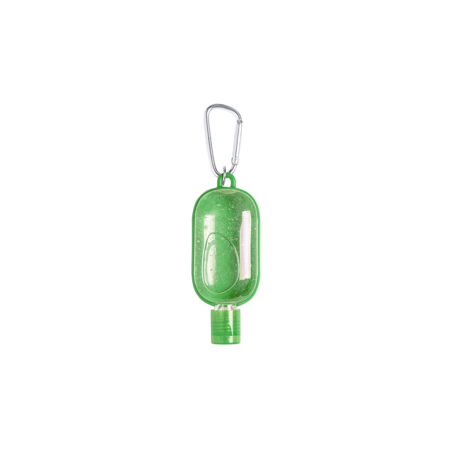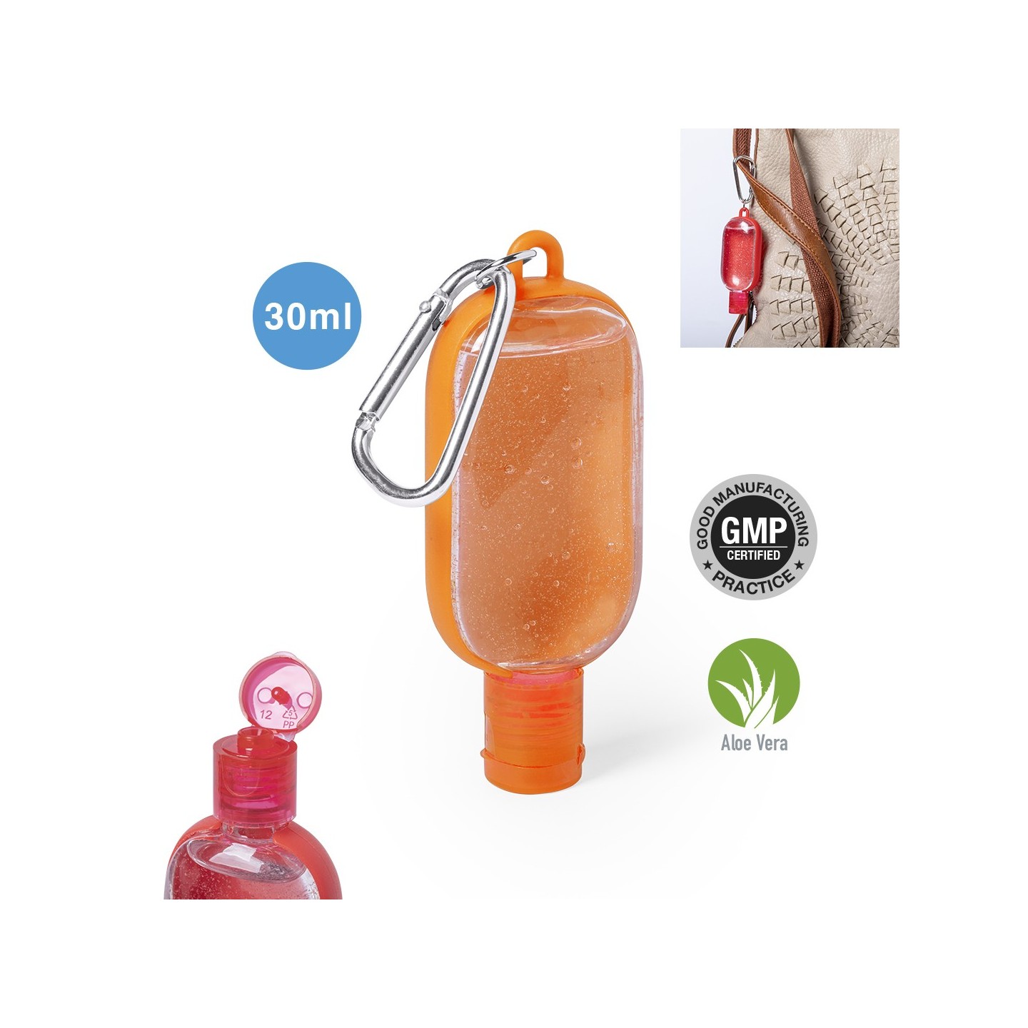 Gel hidroalcohólico con extracto balsámico de Aloe Vera en bote rellenable de 30 ml. Con mosquetón para transporte/fijación. Certificación GMP y 94/62/EC.