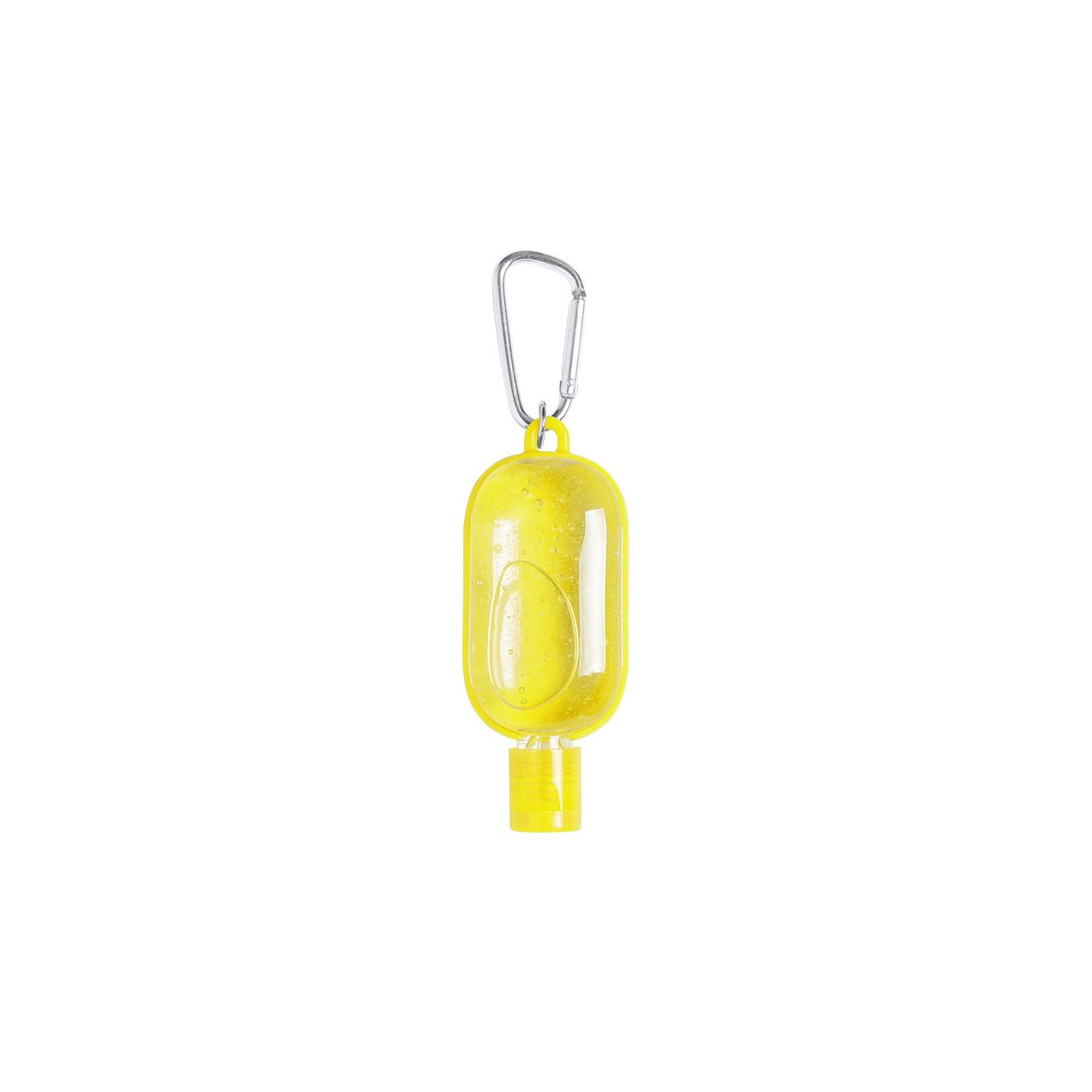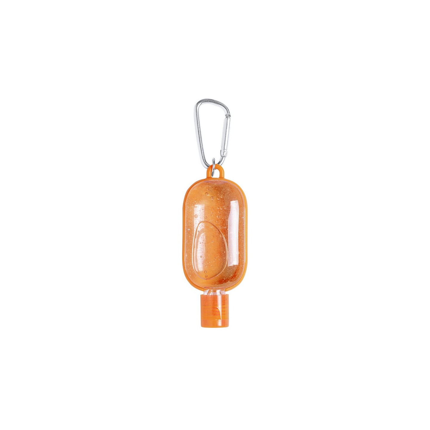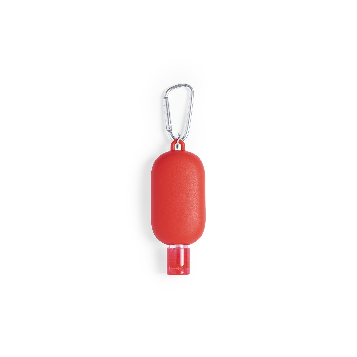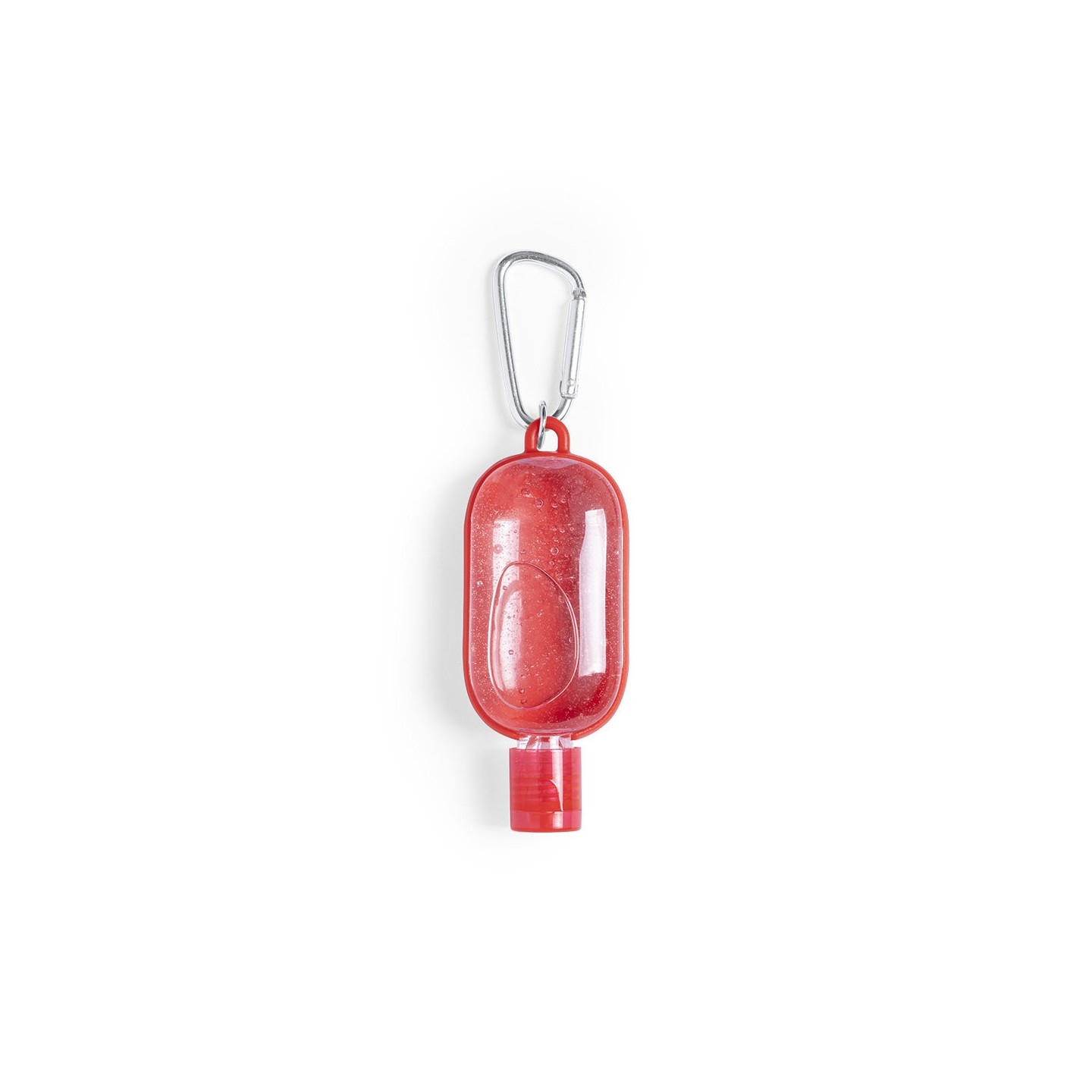 Gel hidroalcohólico con extracto balsámico de Aloe Vera en bote rellenable de 30 ml. Con mosquetón para transporte/fijación. Certificación GMP y 94/62/EC.