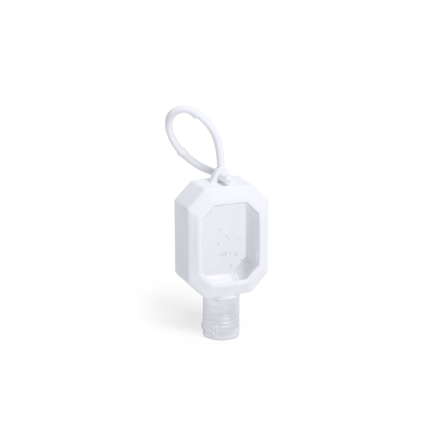 Gel hidroalcohólico de 30 ml con extracto de Aloe Vera. Cuerpo en silicona blanca con dosificador, tapón de seguridad y cordón para transporte. Certificado GMP y cumple normativa 94/62/EC.