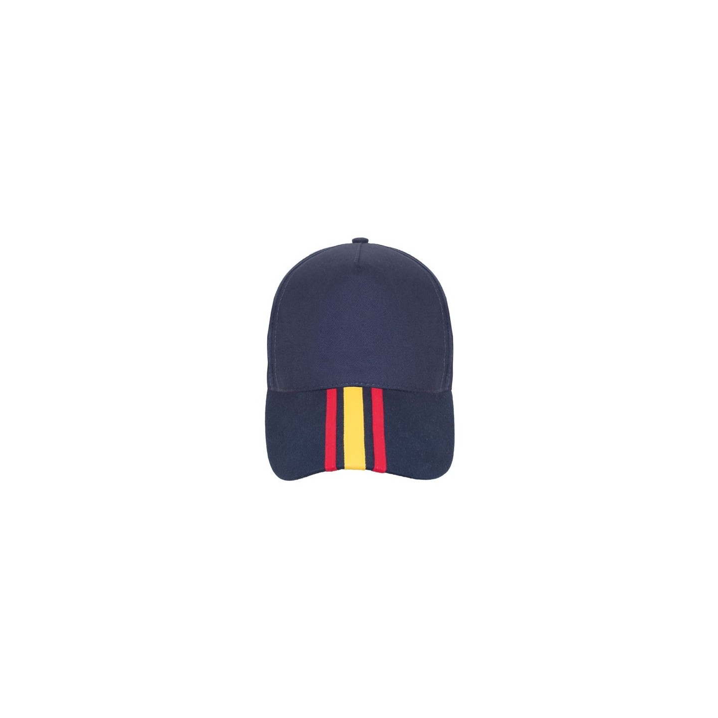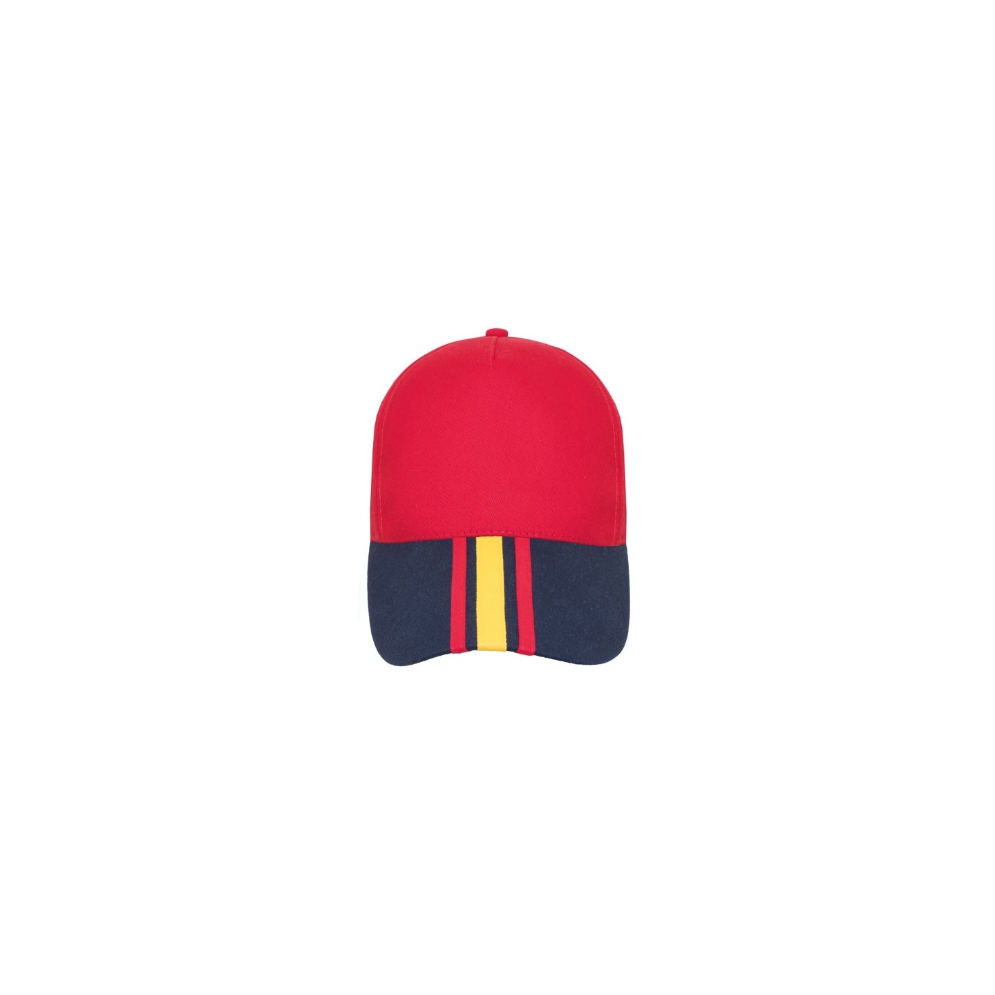Gorra clásica con la bandera de España en la visera, hecha de 100% algodón peinado. Diseño de 5 paneles con cierre ajustable, ideal para personalizar y merchandising