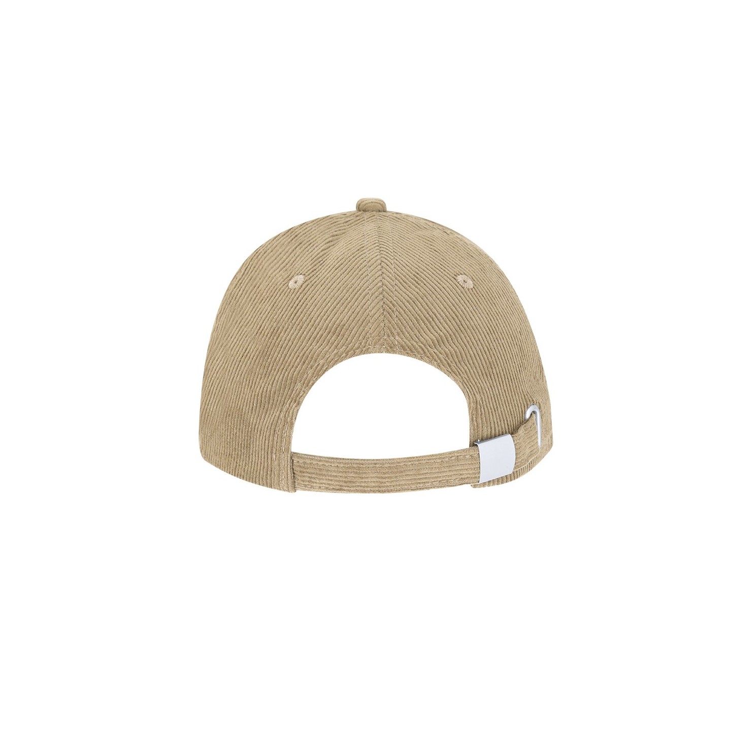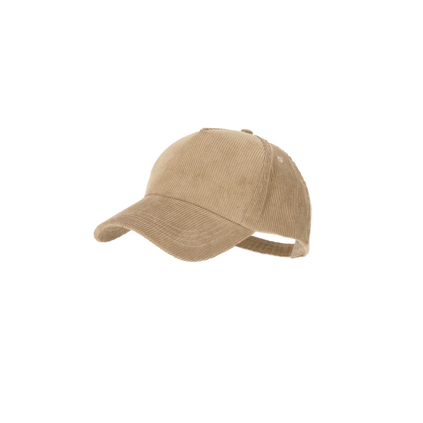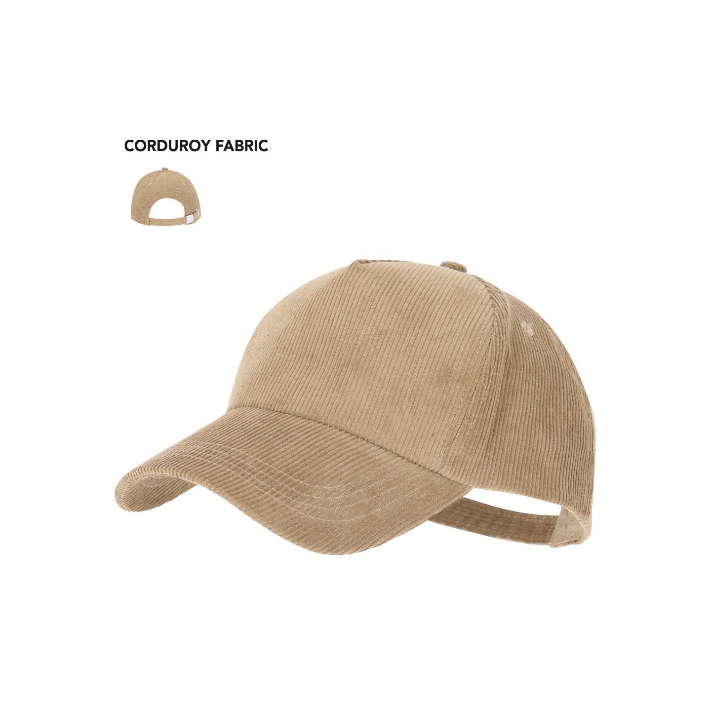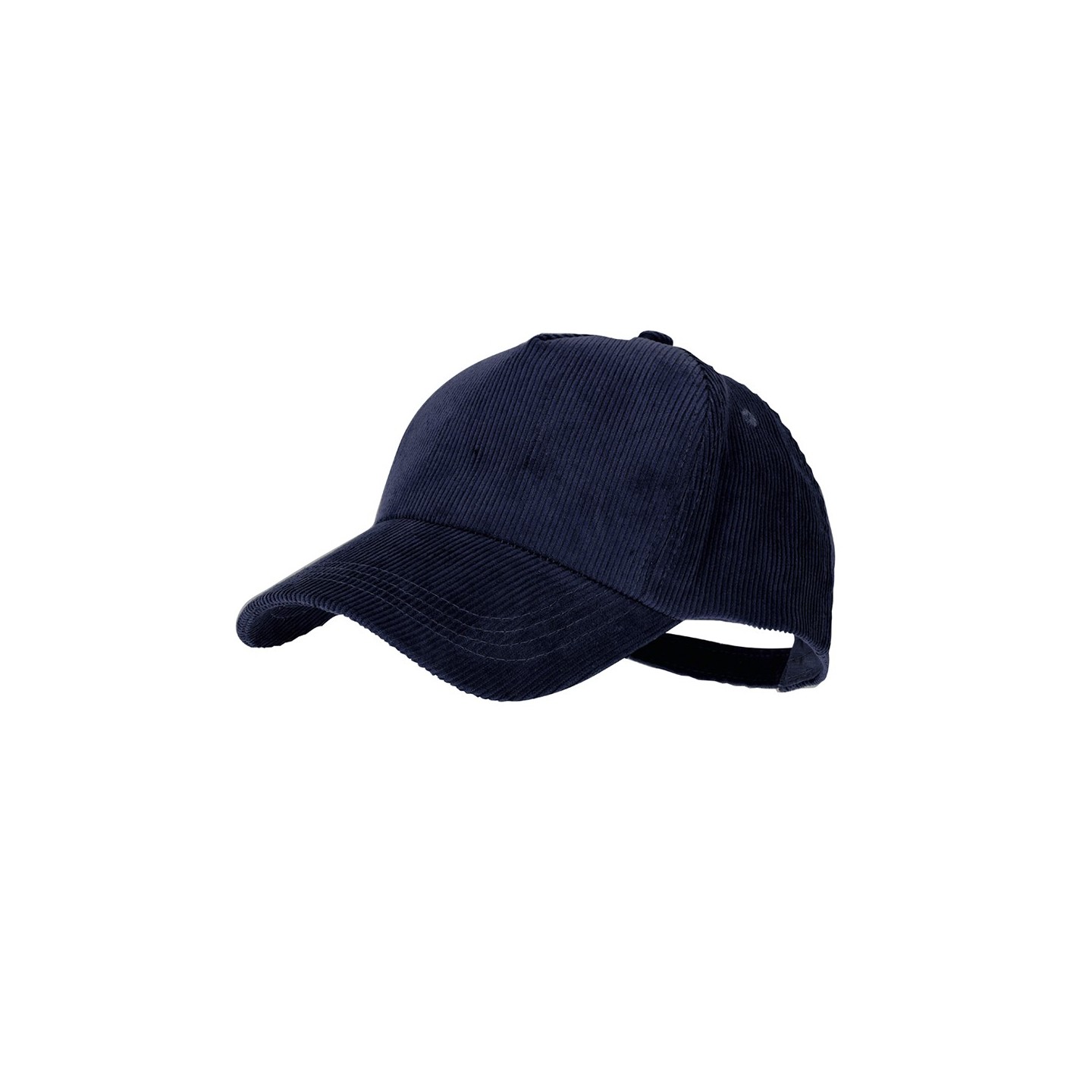Gorra de 5 paneles en poliéster efecto pana, con orificios de ventilación y cierre ajustable con hebilla metálica. Disponible en varios colores y personalizable con logotipo.