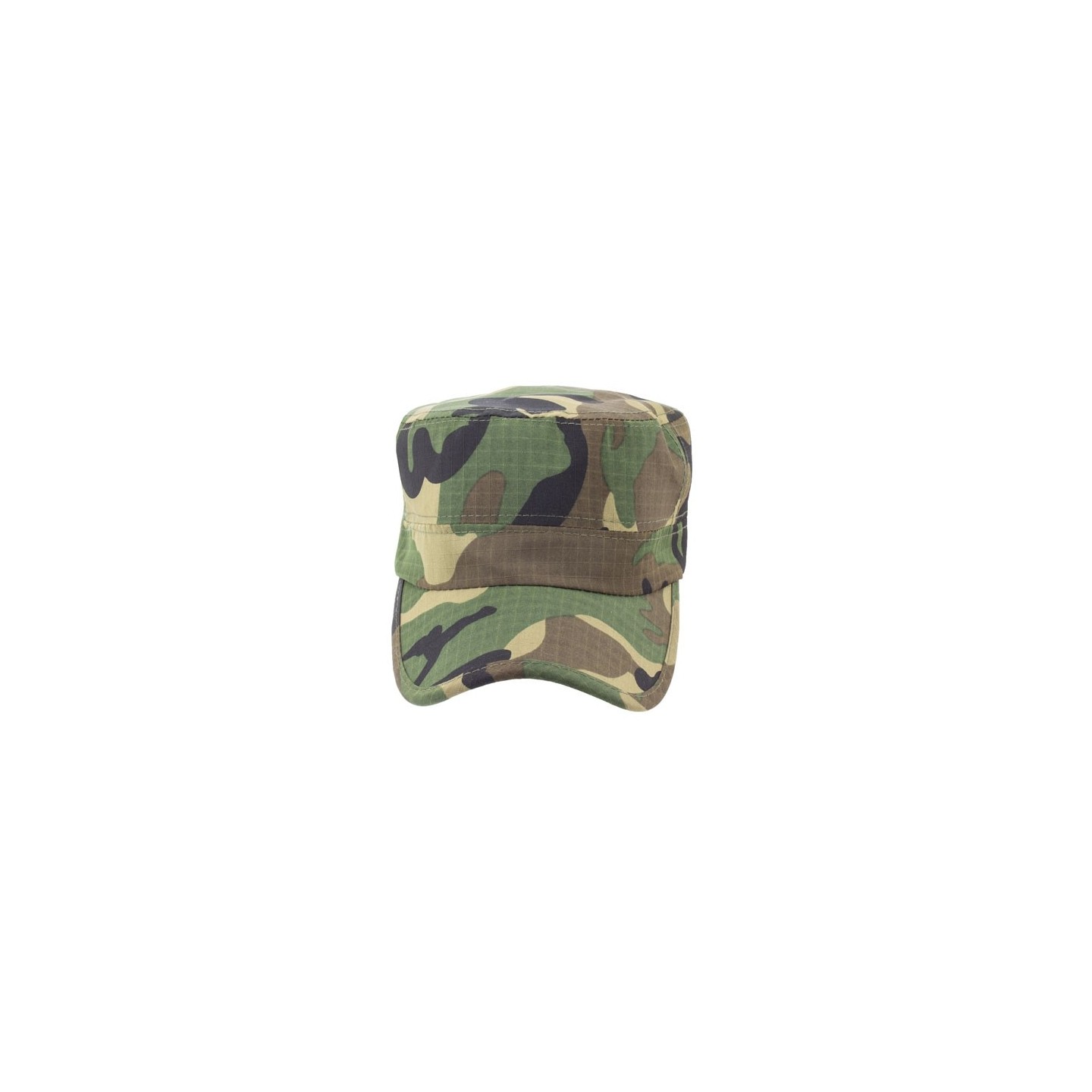 Gorra de camuflaje militar en tonos verdes, marrones y negros, fabricada en poliéster técnico transpirable. Visera curva y cierre ajustable, perfecta para actividades al aire libre.