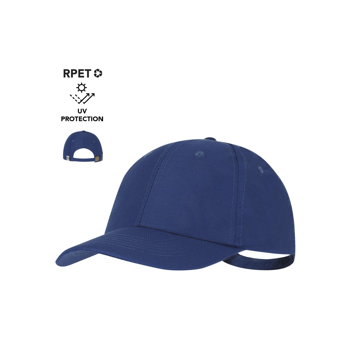 Gorra deportiva de 5 paneles en poliéster RPET con protección UV50. Ajustable y transpirable, ideal para personalizar con tu logotipo. Un regalo ecológico y funcional.