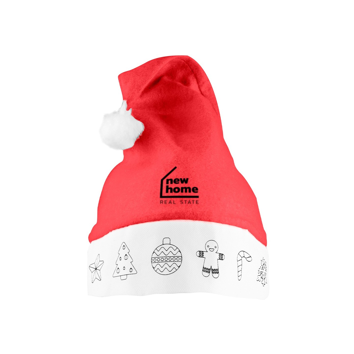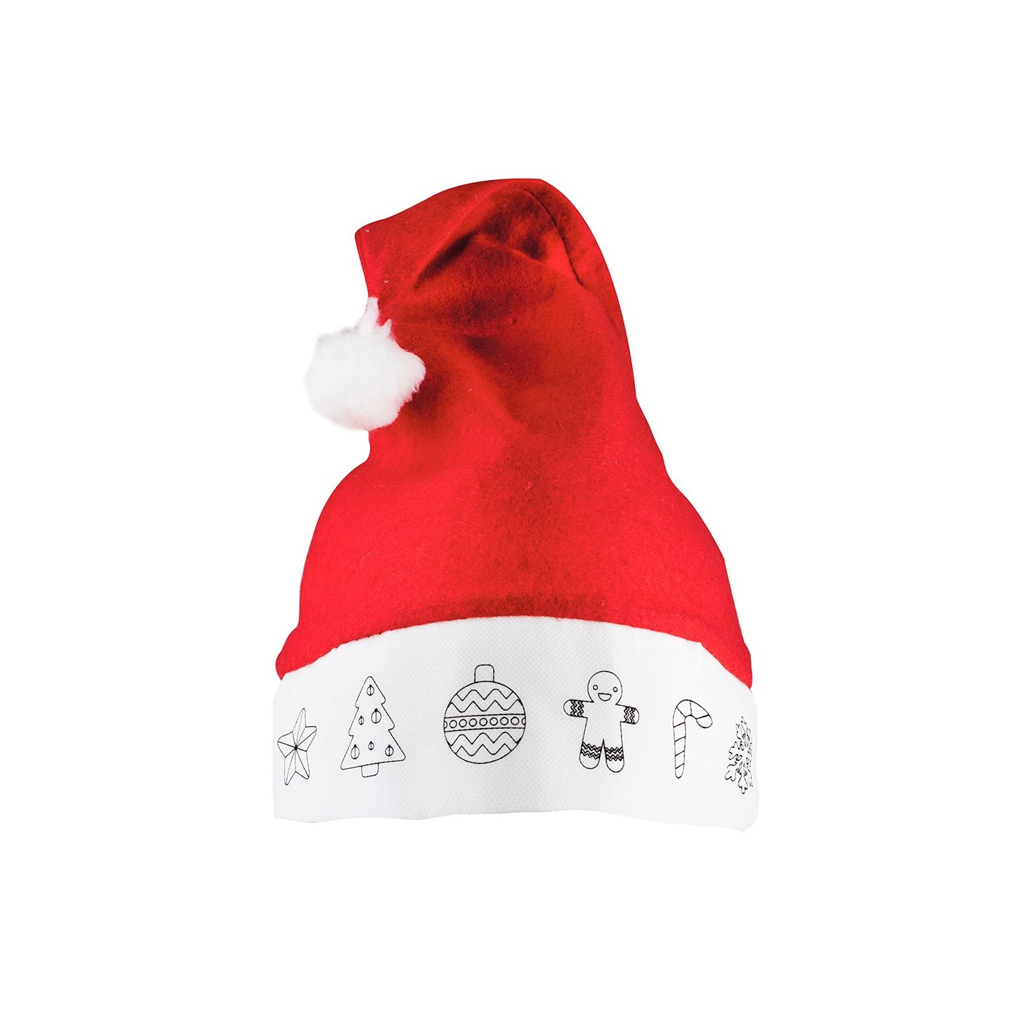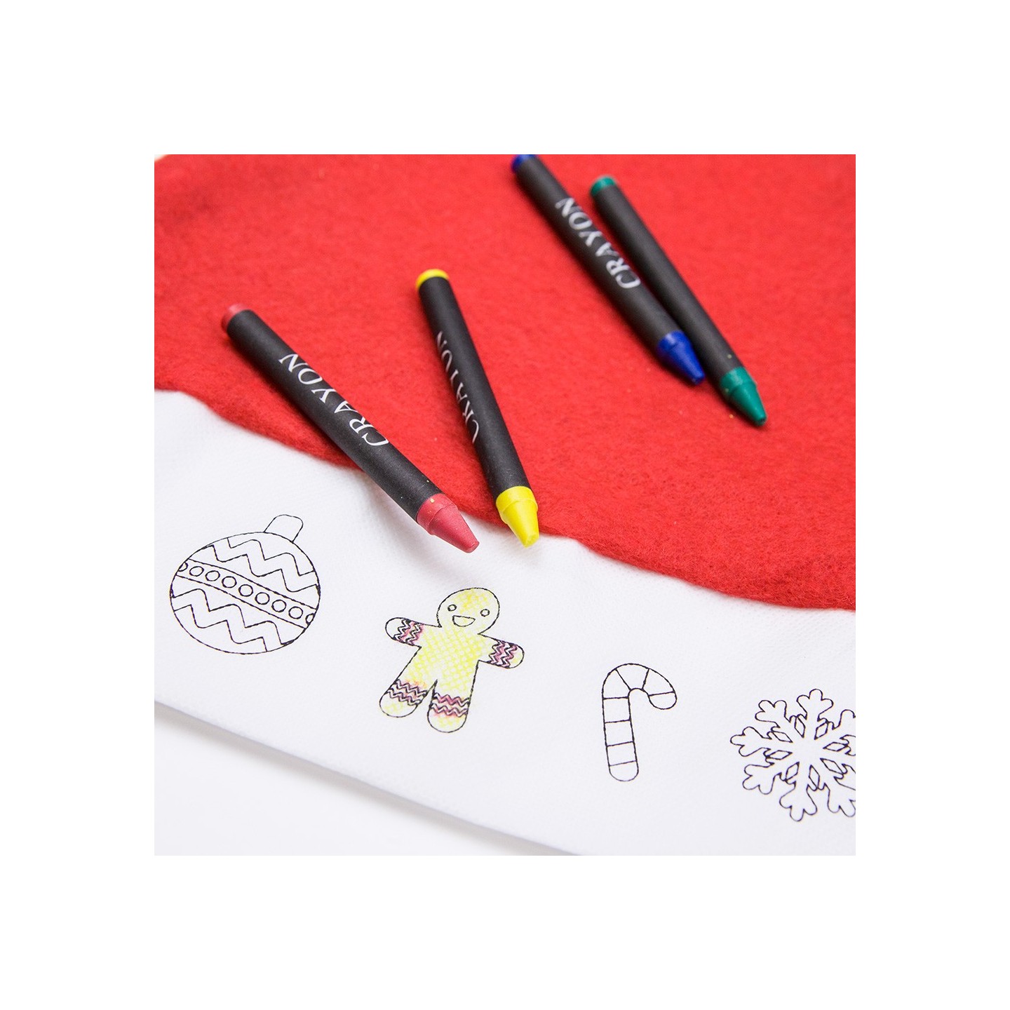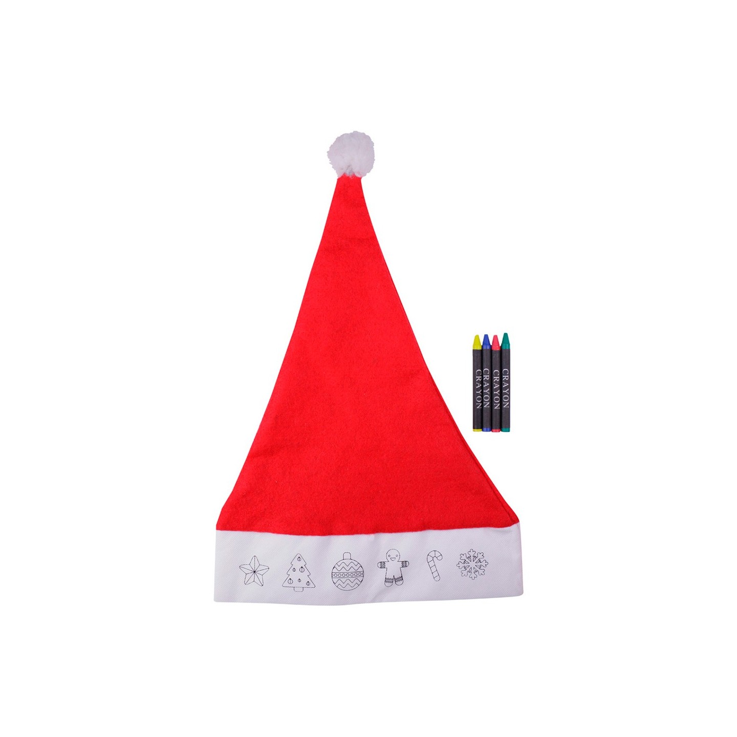 Gorro de Papá Noel personalizable para pintar, incluye 4 ceras. Seguro para niños, con certificación CE y EN 71. Presentación en bolsa individual.