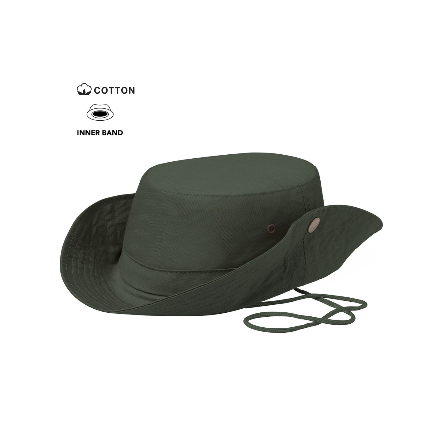 Gorro Safari: estilo, comodidad y funcionalidad en un accesorio de aventura. Material 100% algodón, ventilación lateral, ala ajustable y cordón de transporte.