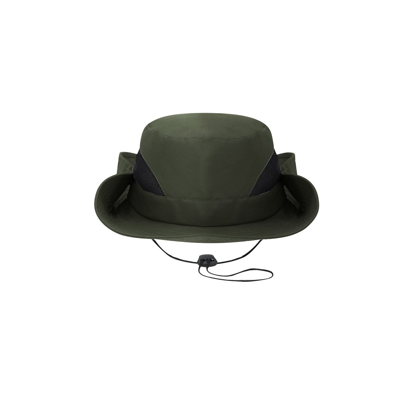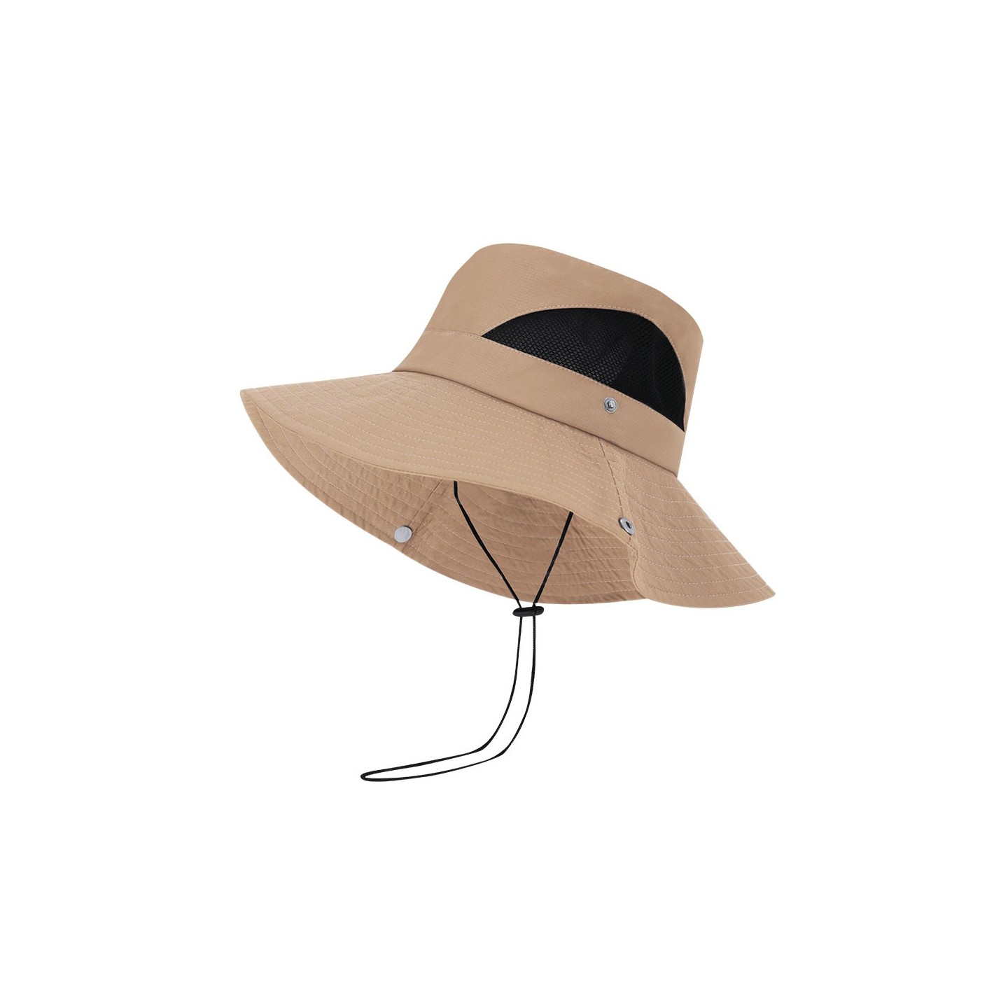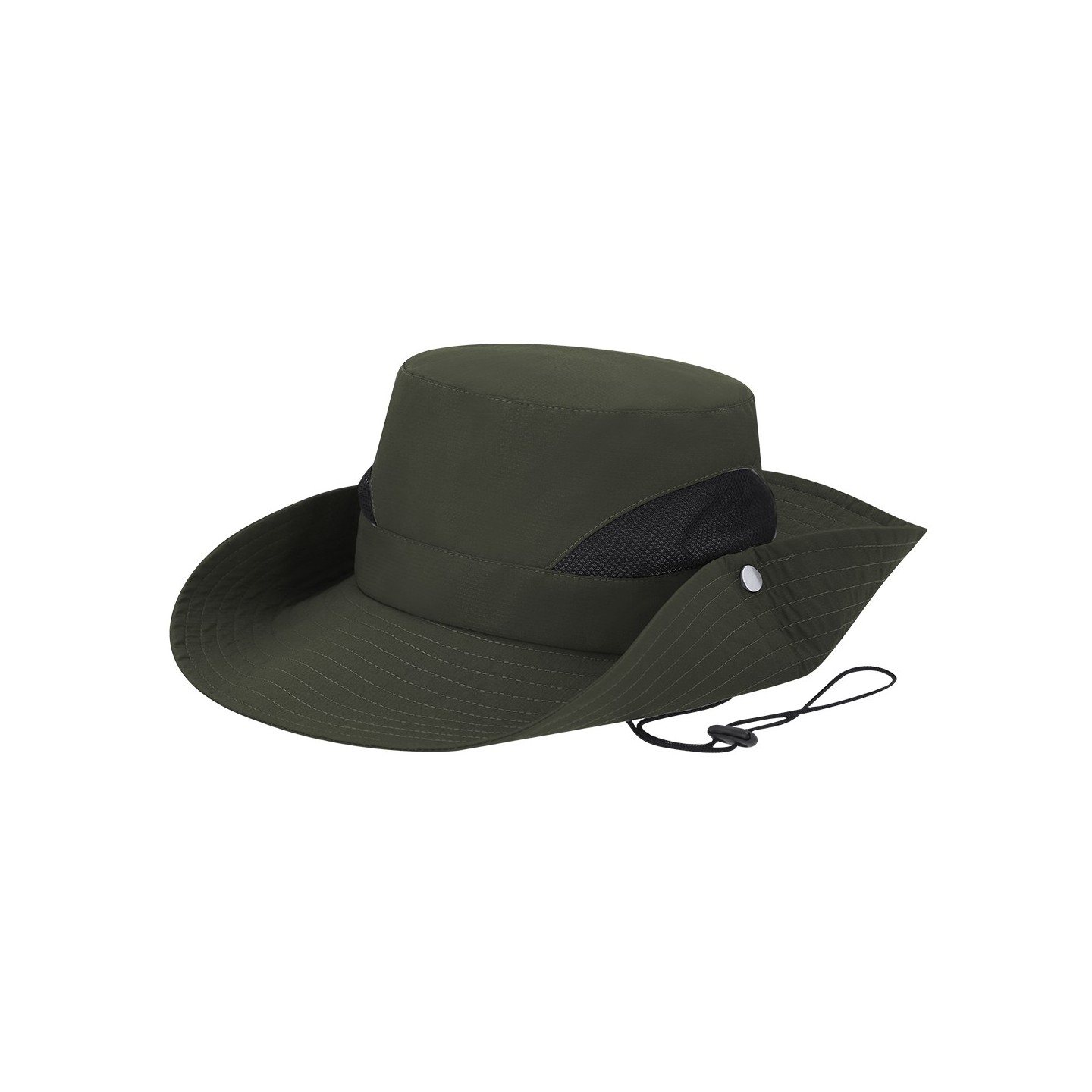 Gorro safari en poliéster resistente con rejillas transpirables, alas ajustables y cordón de transporte. Ideal para actividades al aire libre. Personalizable con tu logotipo.
