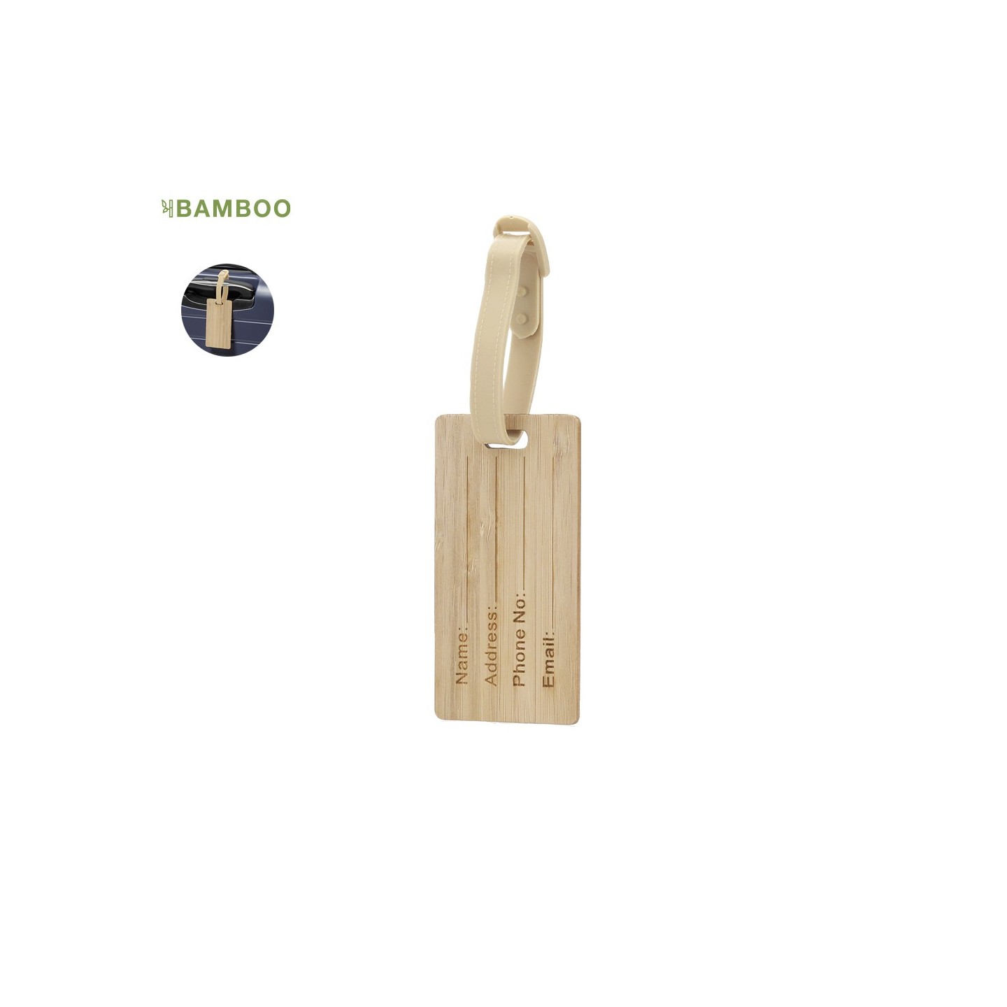 Identificador para maletas Elwes, fabricado en bambú con cinta de acople y cierre de hebilla. Incluye datos de identificación en inglés y superficie lisa para marcaje.