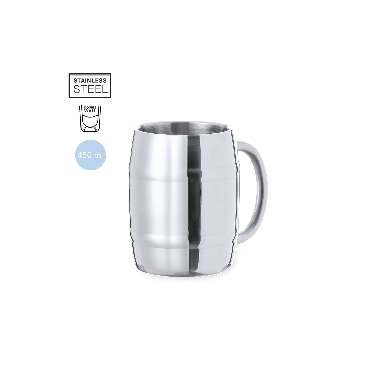 La Jarra Solara es elegante, de acero inoxidable y diseño en forma de barril, ideal para los amantes de la cerveza. ¡Personalizable para regalos únicos!