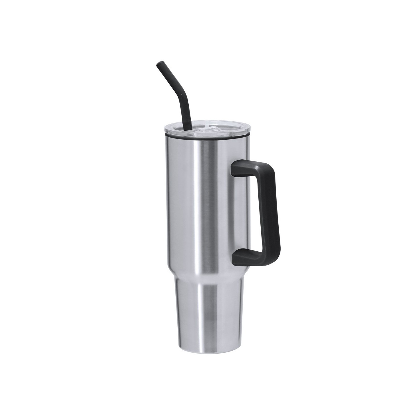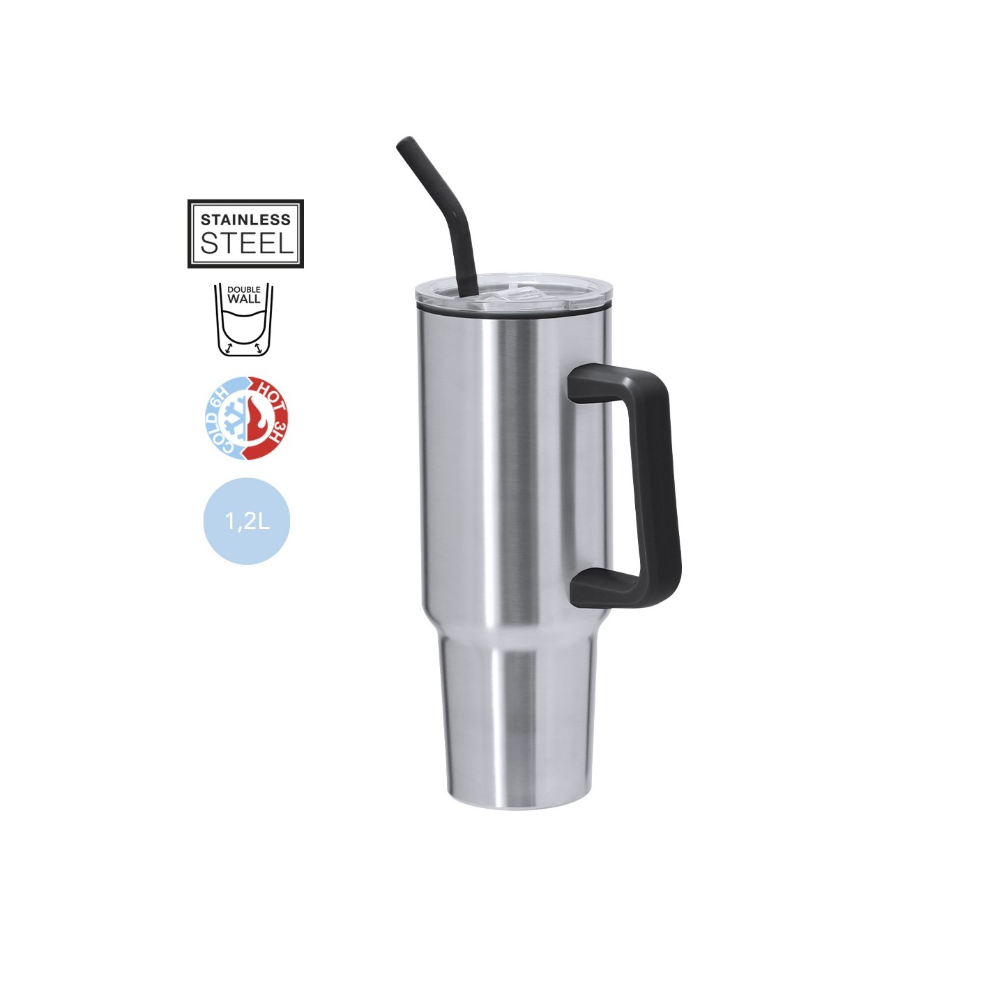 La Jarra Térmica Lansin de 1,2 L en acero inoxidable es personalizable. Con tapadera a presión, dosificador y pajita, es perfecta para disfrutar tus bebidas favoritas.