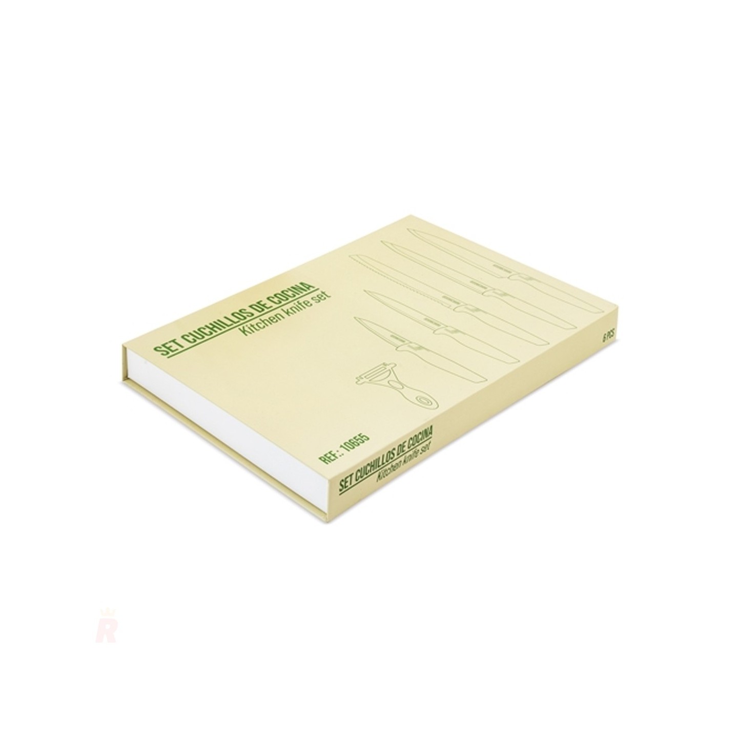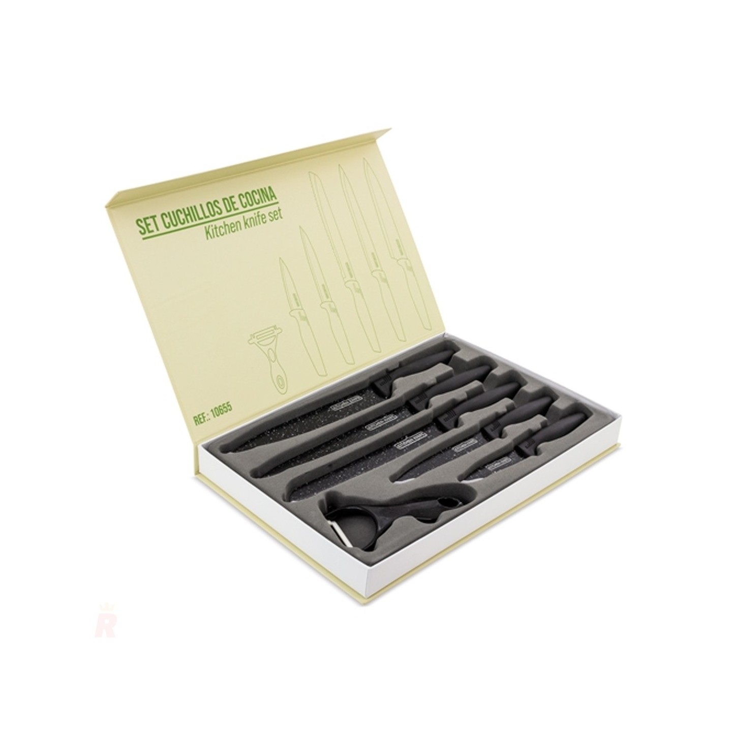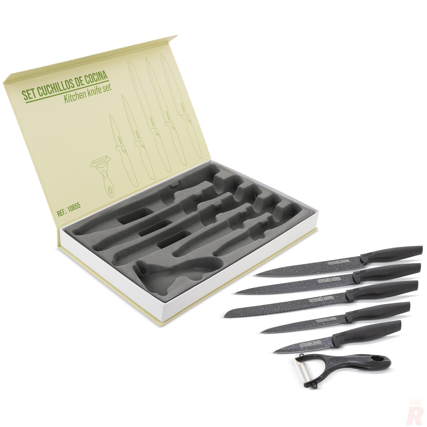 Juego profesional de 6 cuchillos con hoja de acero inoxidable, mango ergonómico y revestimiento antibacteriano. Ideal como regalo empresarial personalizable con logotipo.