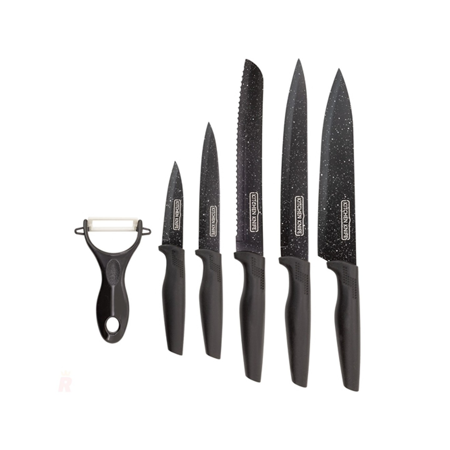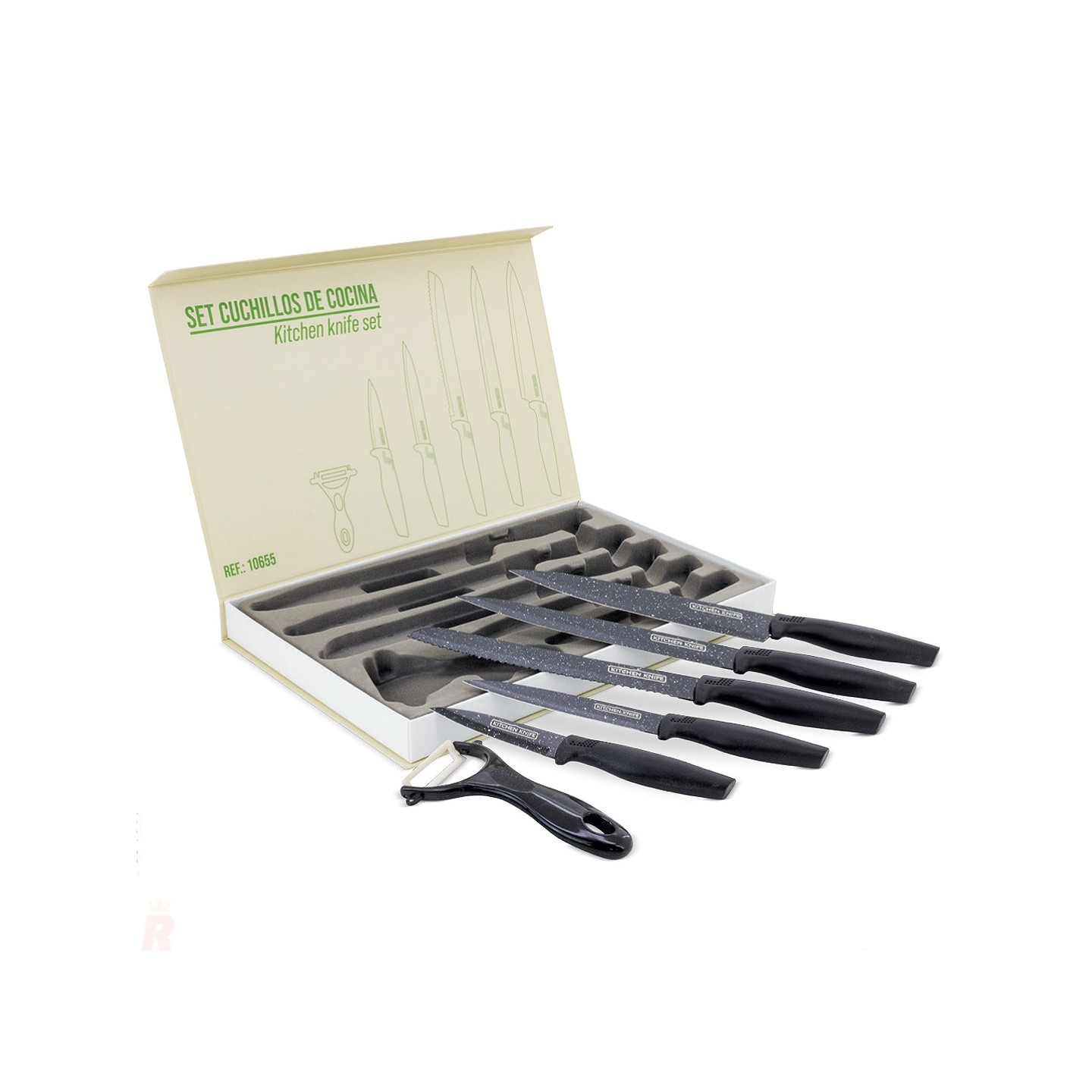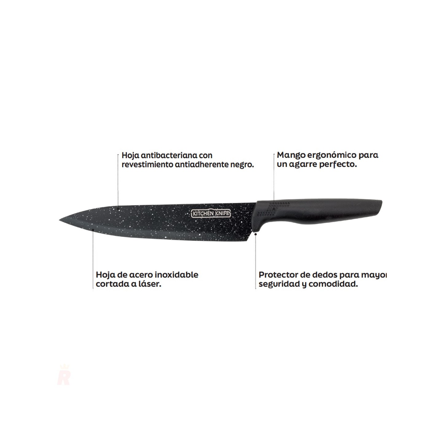 Este excepcional set de cuchillos de cocina está diseñado para quienes buscan calidad profesional y practicidad en su cocina. El juego incluye 5 cuchillos esenciales y un pelador, todo lo que necesitas para afrontar las tareas culinarias con precisión y estilo. Con hojas fabricadas en acero inoxidable cortado a láser, este set garantiza un rendimiento impecable al cortar cualquier tipo de alimento. La tecnología antibacteriana y el revestimiento antiadherente negro no solo ofrecen seguridad alimentaria, sino que también facilitan la limpieza, manteniendo tus cuchillos en excelente estado por más tiempo.