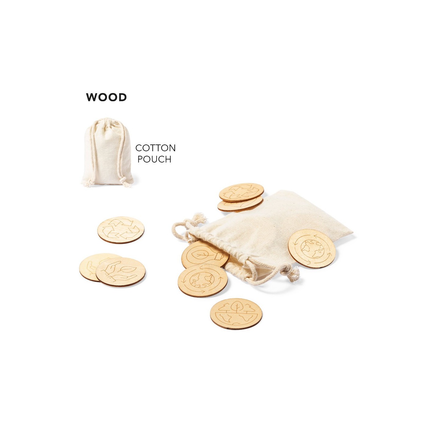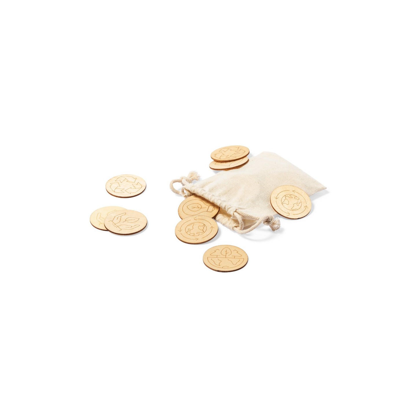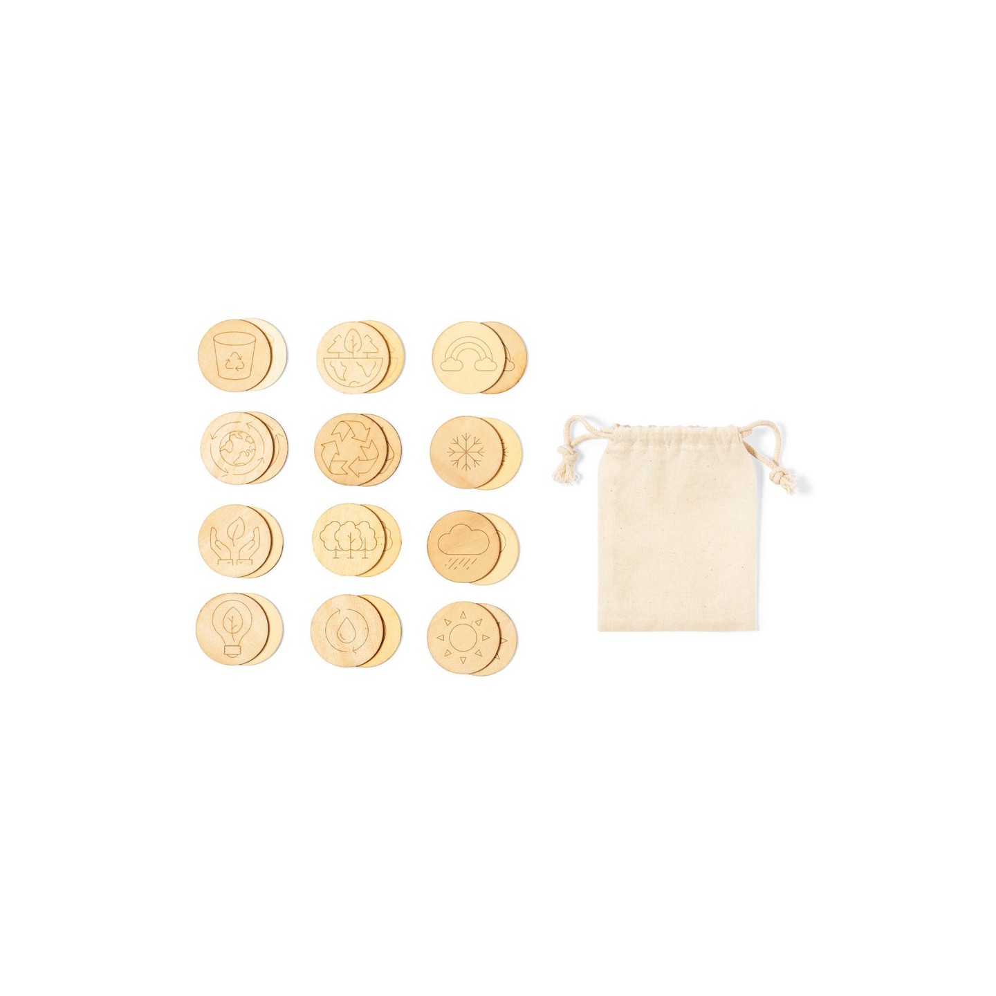 Juego de concienciación ecológica fabricado en madera. Set de 24 piezas en bolsa de transporte 100% algodón con cordones de cierre a juego.