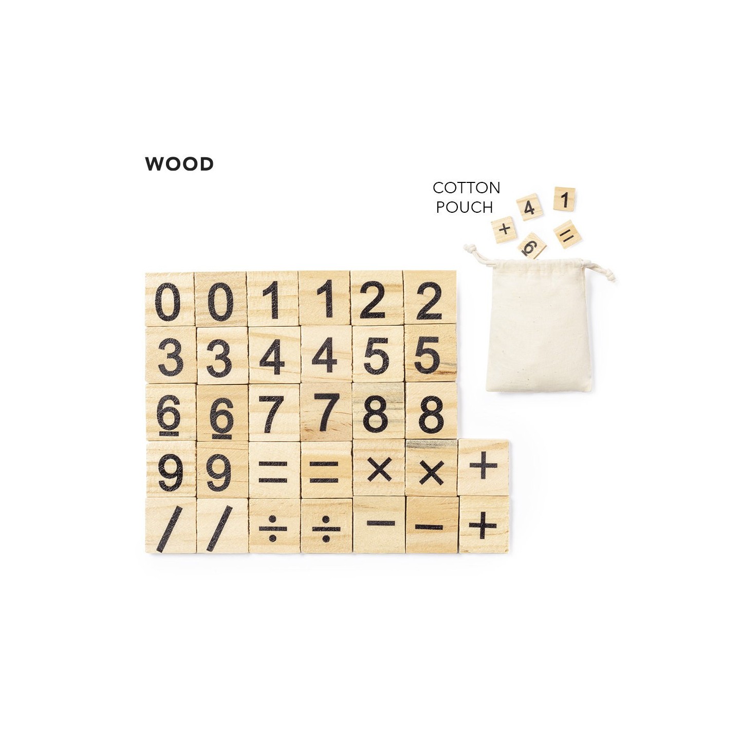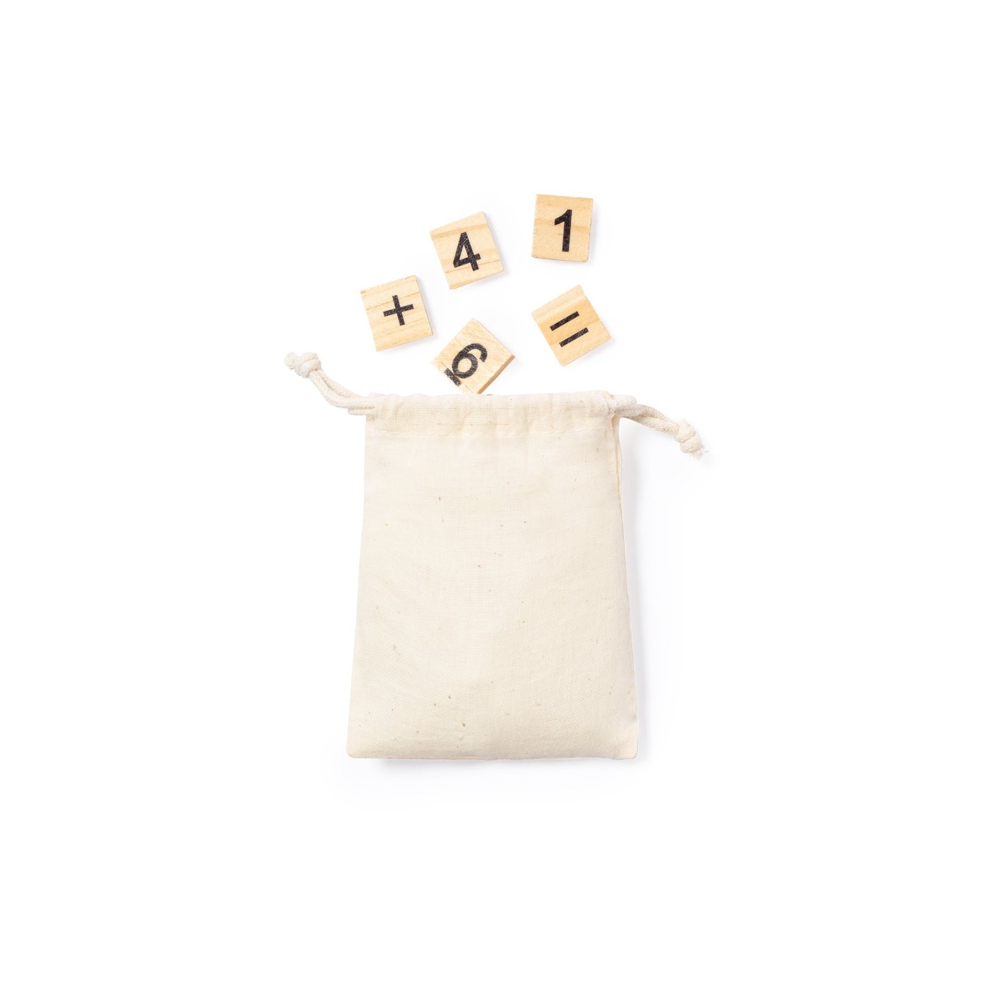 Juego de cálculo fabricado en resistente madera natural de pino. Set de 32 piezas en bolsa de transporte 100% algodón con cordones de cierre a juego.