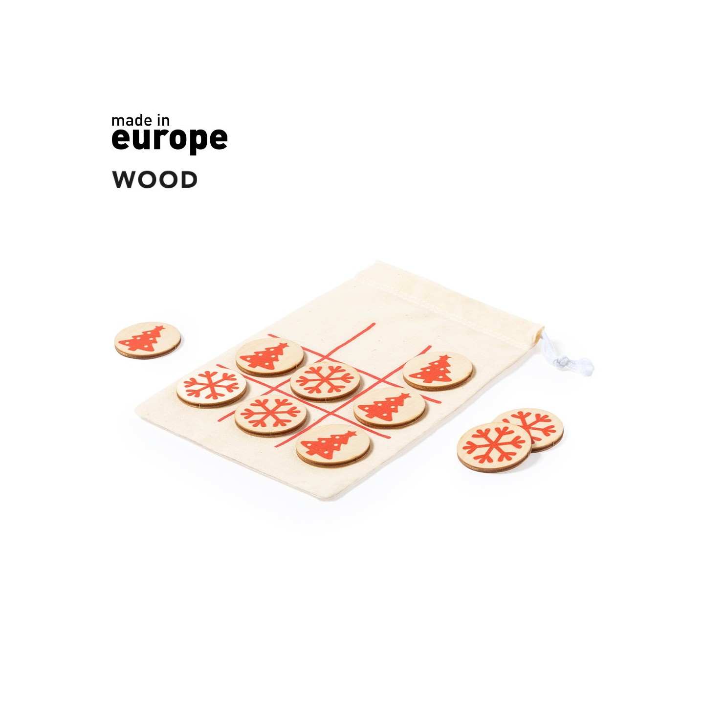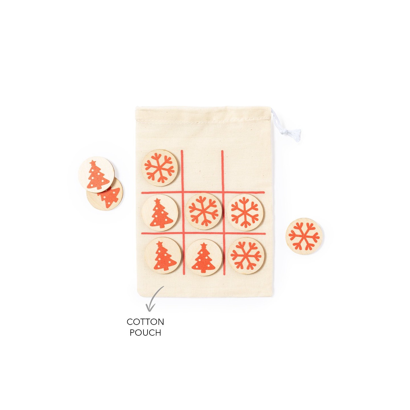 Juego tres en raya de original diseño navideño y fabricado en madera natural. Presentado en bolsa con cierre de cordón, incluidas 5 fichas copo de nieve y 5 fichas árbol de navidad.