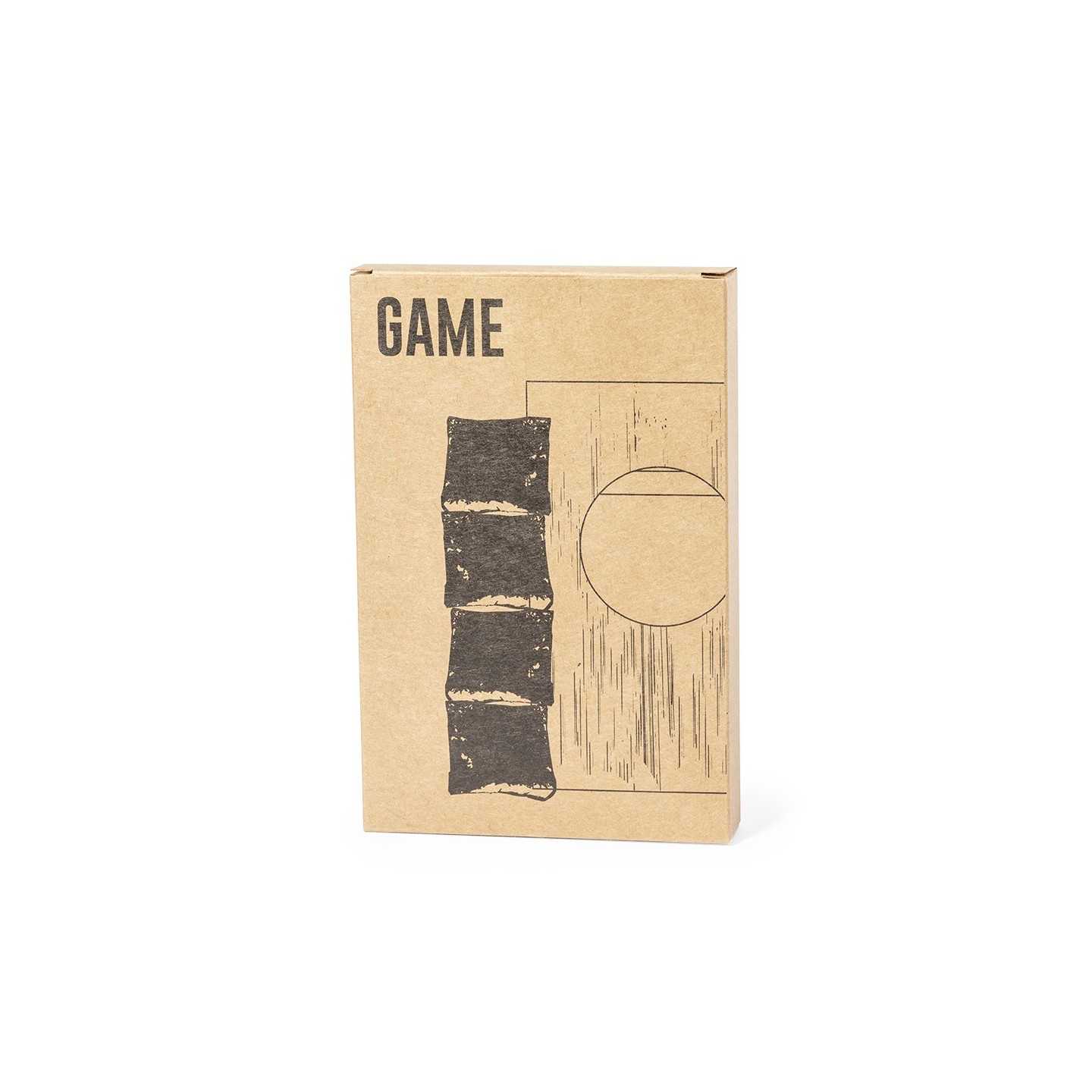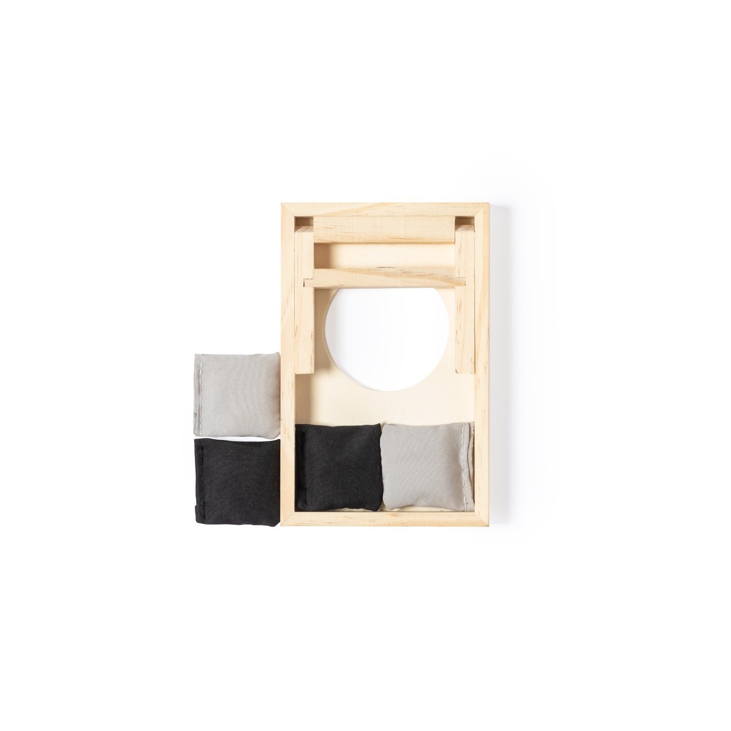 Juego de habilidad fabricado en resistente madera de pino. Base con agujero y 4 saquitos rellenos de arena en 2 colores. Presentación en caja individual de diseño kraft.