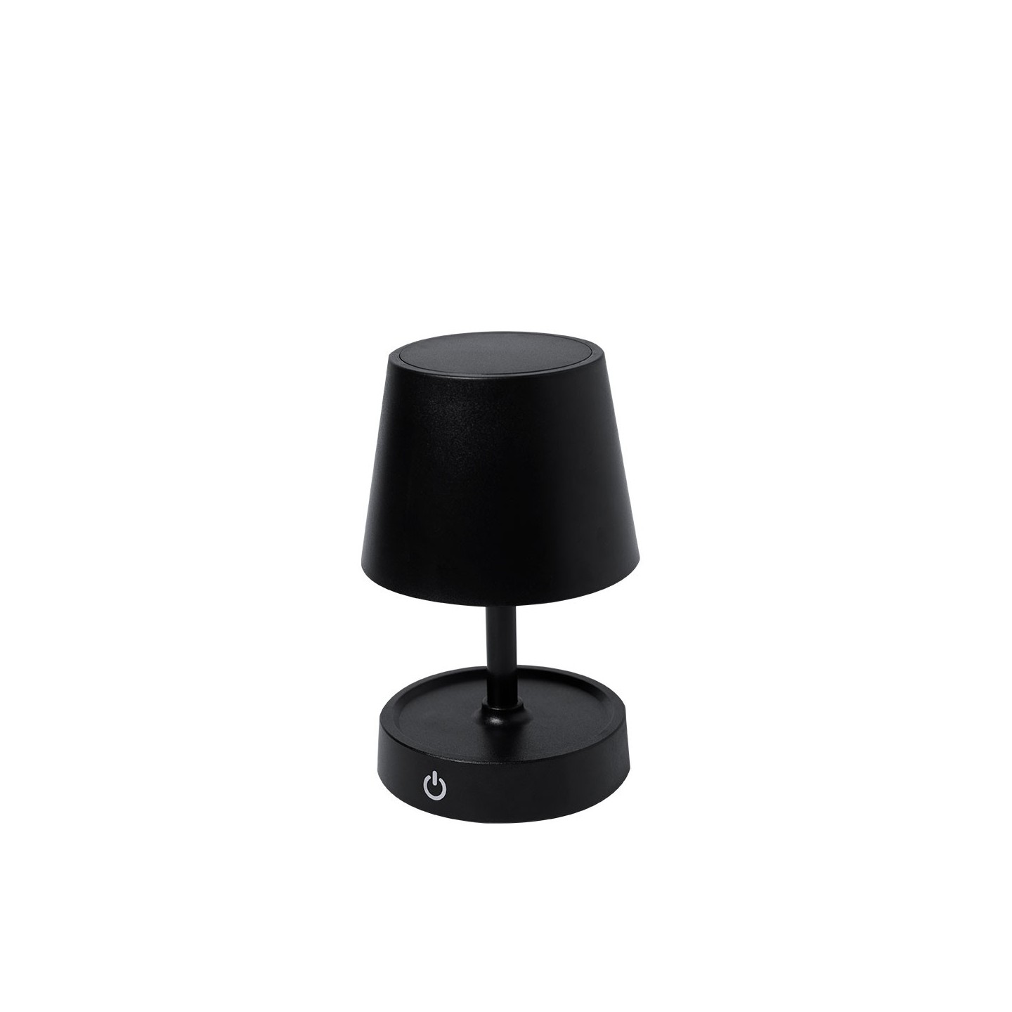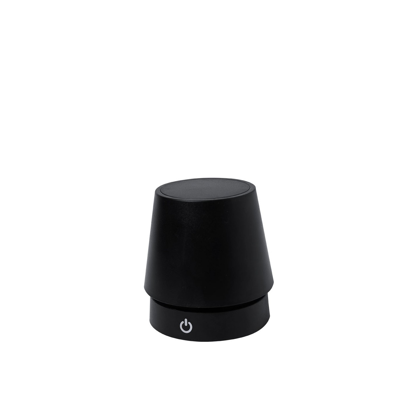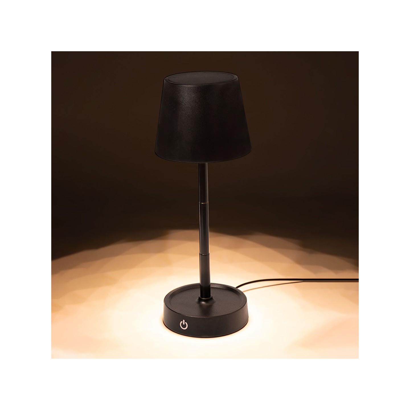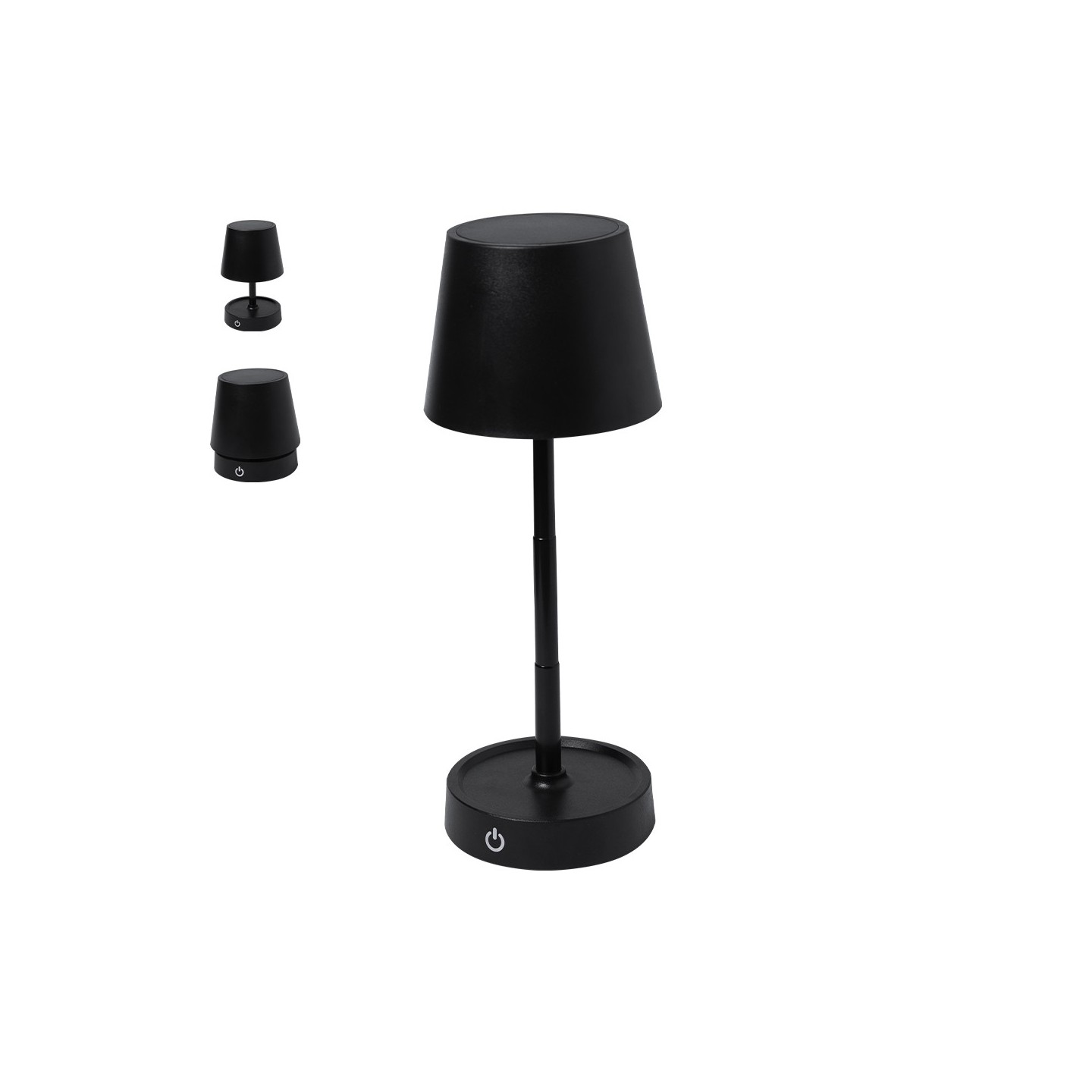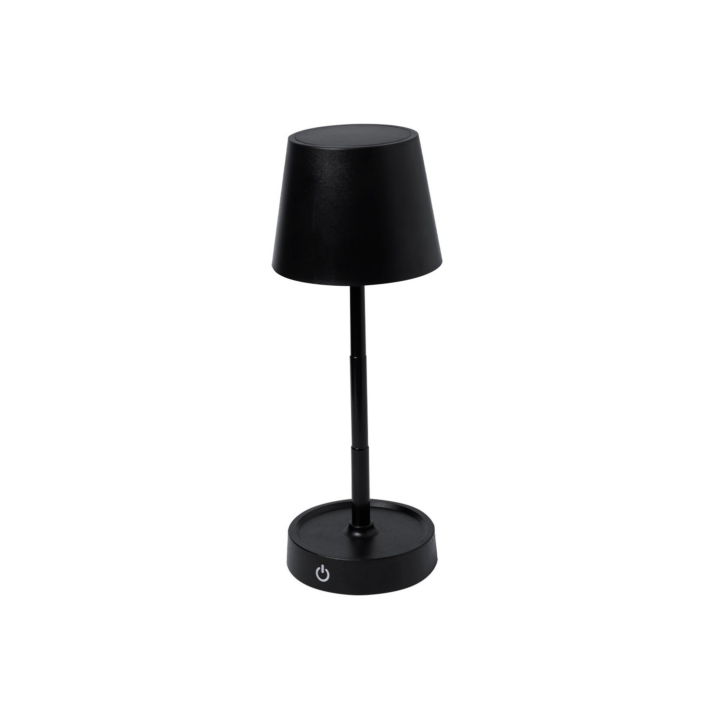 Lámpara de diseño negro mate con luz regulable táctil, cuerpo plegable y batería recargable. Personalizable con logotipo. Ideal para regalar.