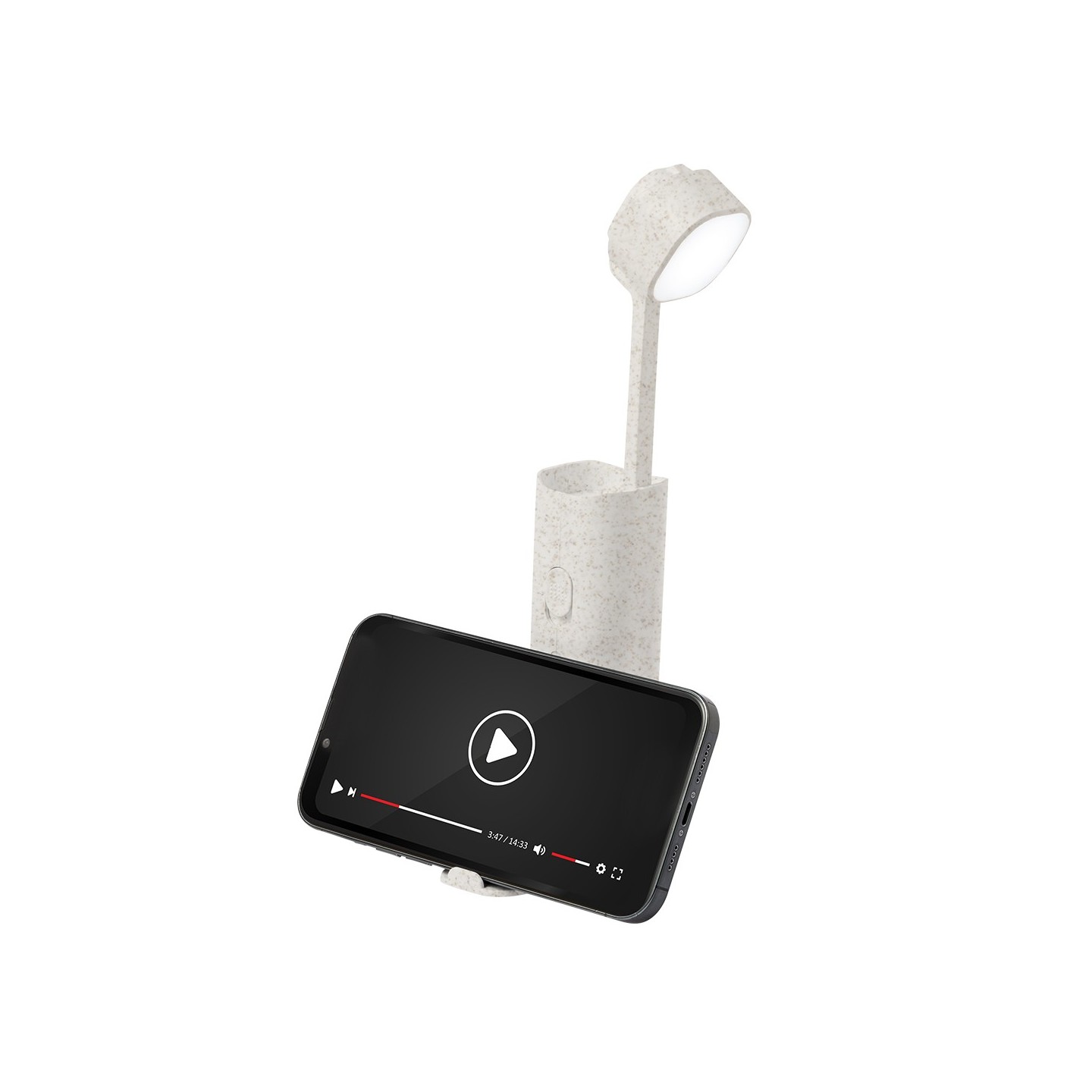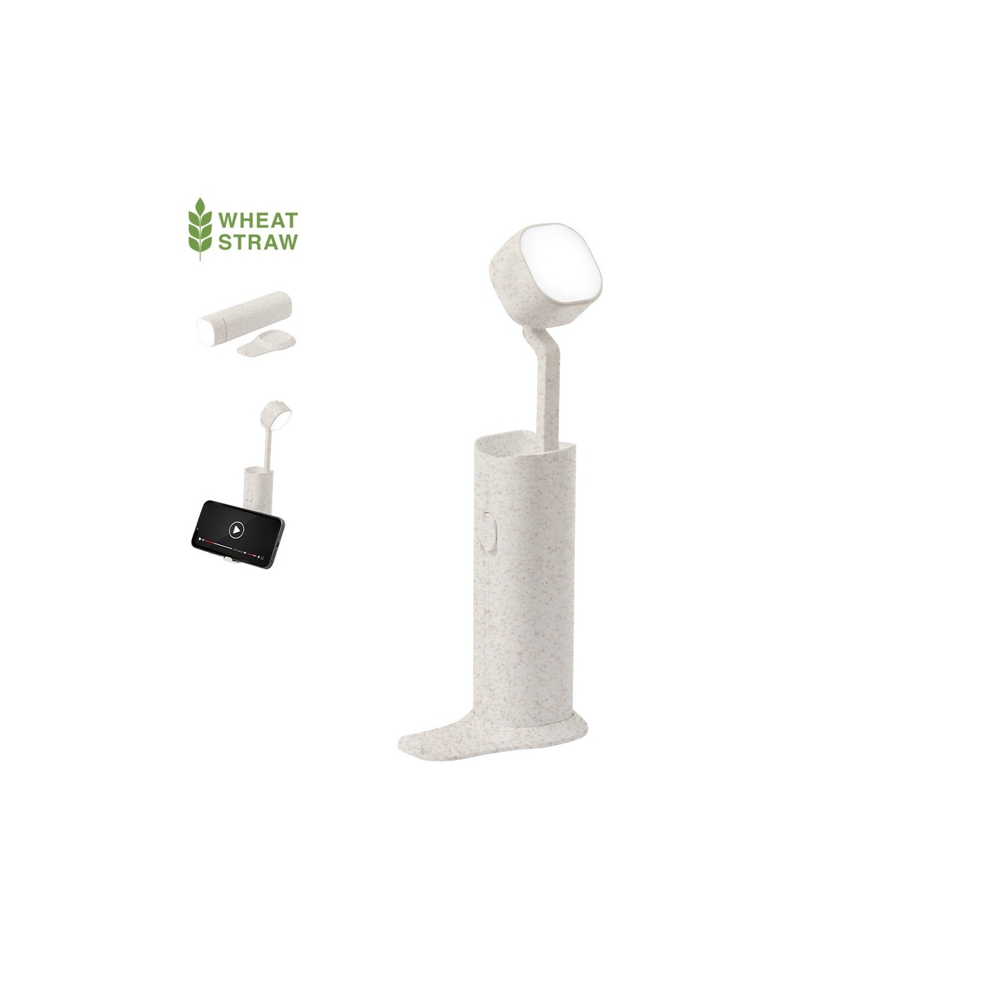 Ilumínate y organiza con estilo. Lámpara Multifunción Olan, fabricada en caña de trigo, ajustable y con soporte para dispositivos móviles. Personalizable.