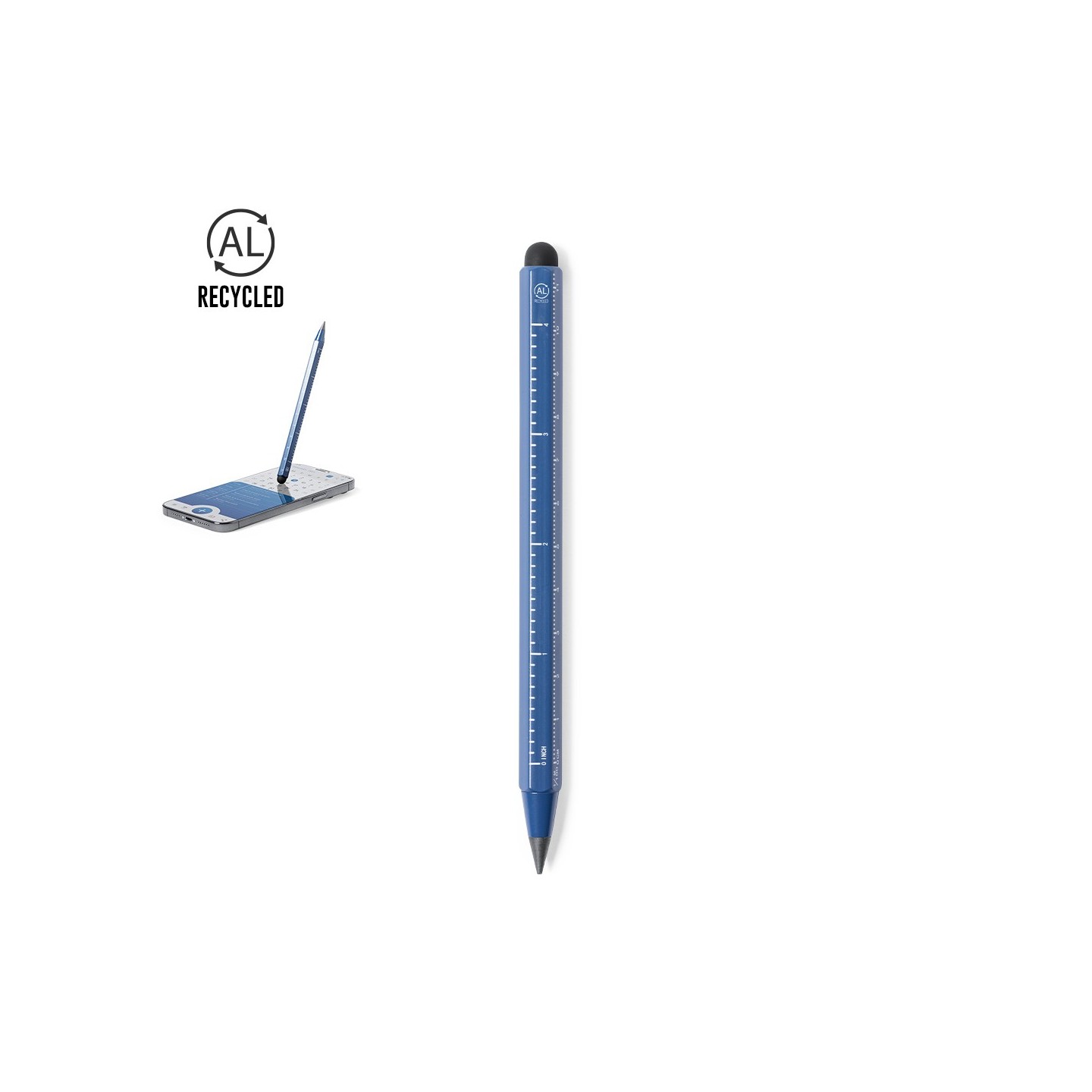 El Lápiz Eterno Multifunción Teluk está fabricado en aluminio reciclado, un material ecoamigable que nos permite reducir el impacto ambiental y promover la economía circular. Este lápiz no solo te ofrece una herramienta de escritura, sino que también cuenta con dos funciones adicionales: un puntero táctil y una regla.