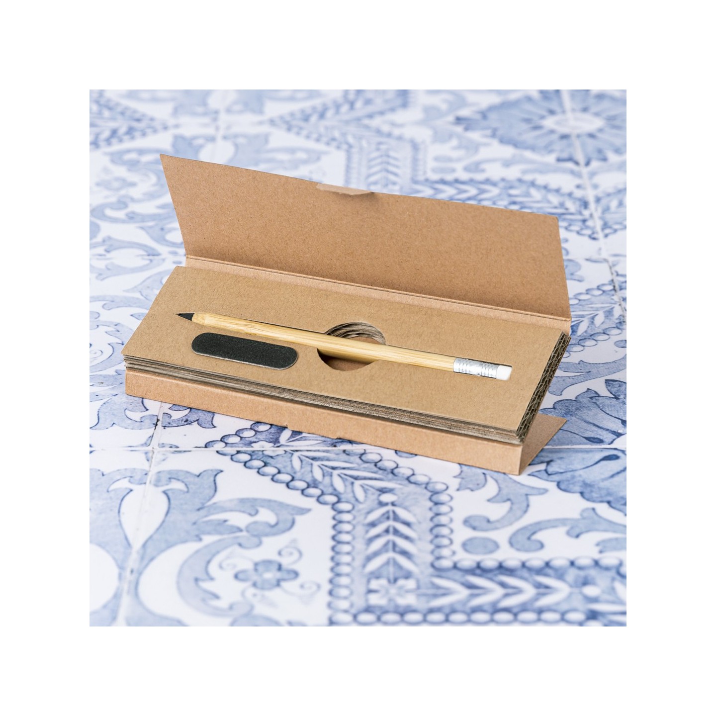 Presentado en un estuche individual troquelado de cartón reciclado que contiene una lima afiladora.