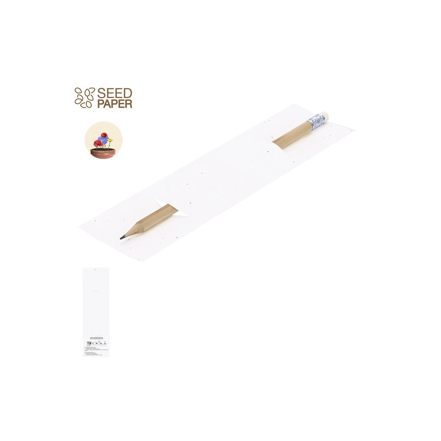 Lápiz ecológico de madera natural con goma, presentado en funda de papel semilla con petunia. Al final de su vida útil, ¡plántalo y crece flores! Personalizable con tu logotipo.