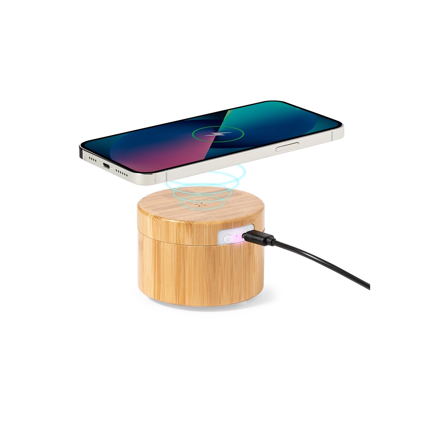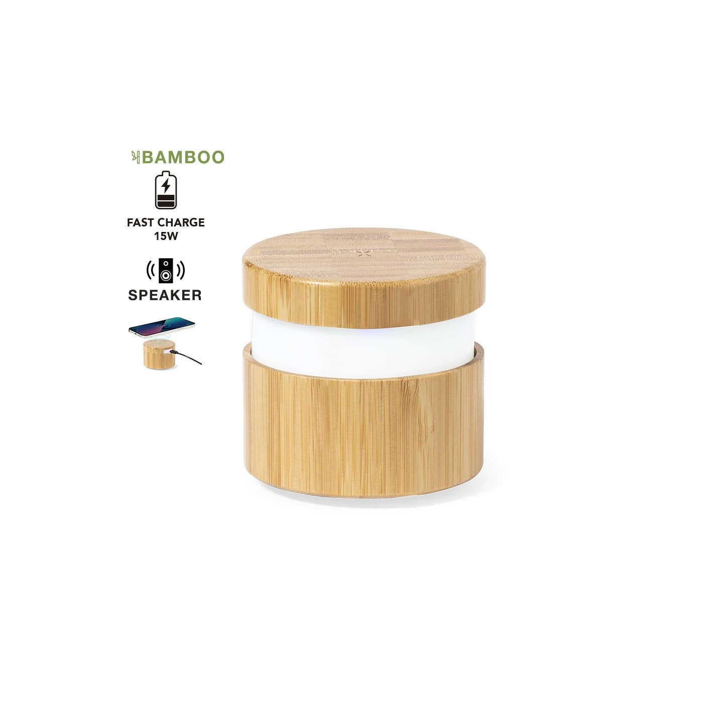 Lámpara Multifunción Sheilax: Bambú, altavoz 3W Bluetooth®, cargador inalámbrico 15W. Versatilidad y diseño en un solo dispositivo.