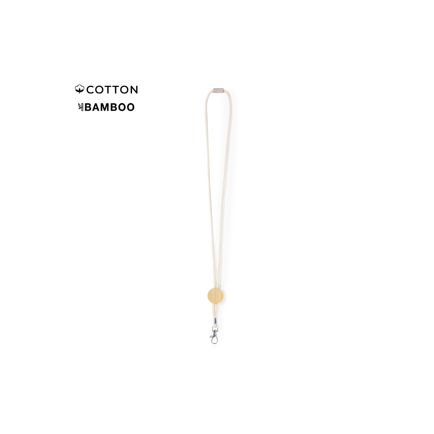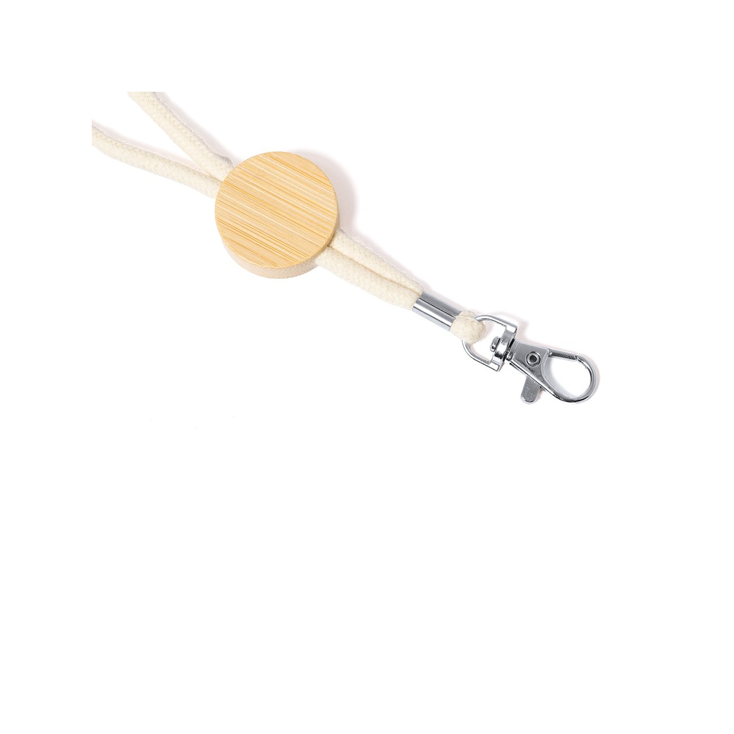 Este lanyard está fabricado con algodón 100% y bambú, lo que lo hace resistente y duradero. Su diseño circular especial permite una fácil personalización con tu logo o mensaje corporativo en bambú, agregando un toque distintivo a tu identidad de marca.