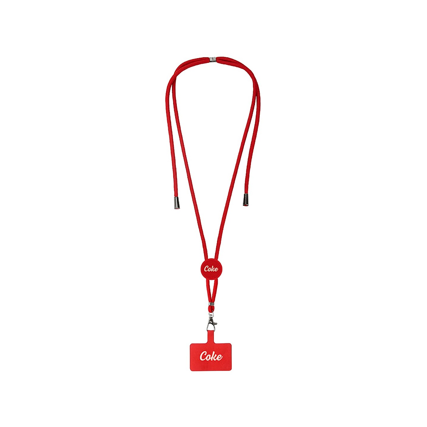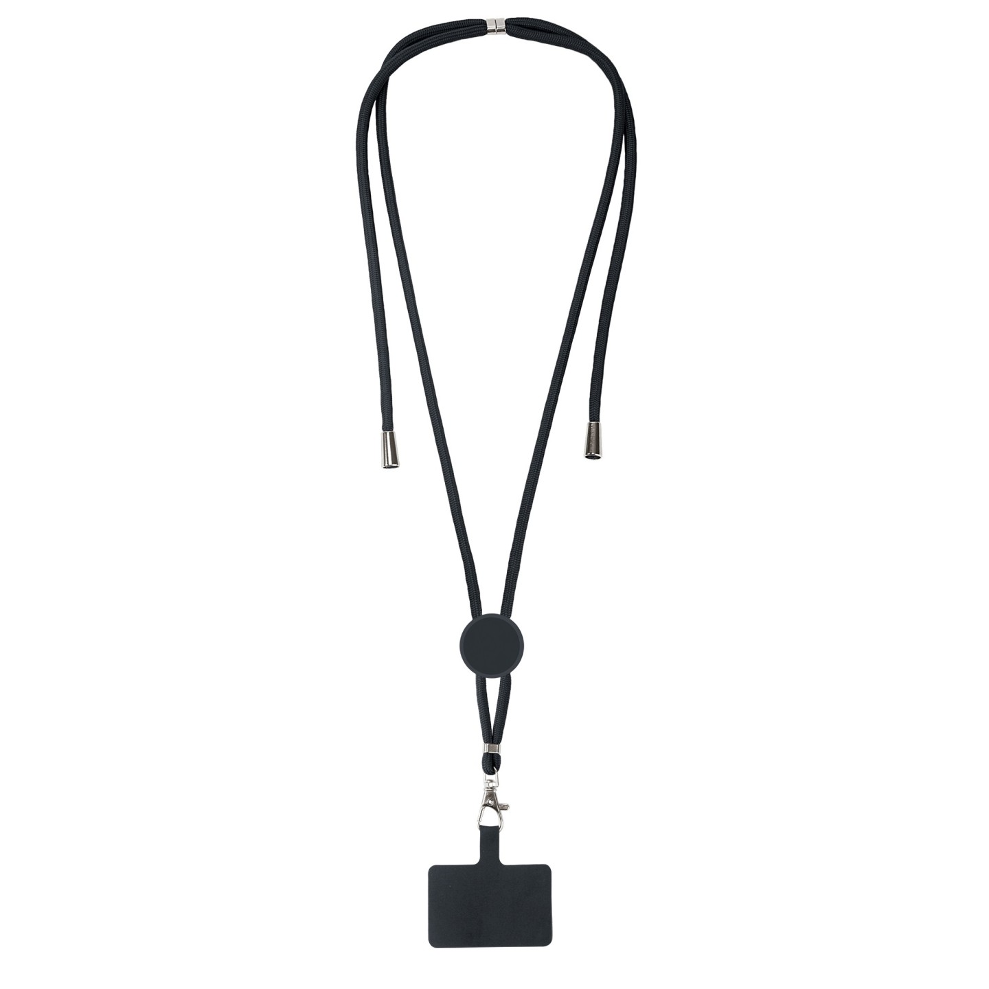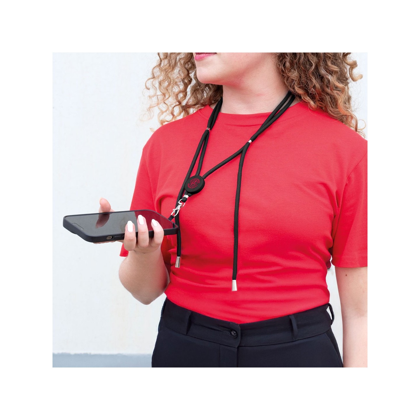 Lanyard ajustable con soporte para teléfono, fabricado en material reciclado. Disponible en varios colores, ideal para eventos, ferias y uso diario.