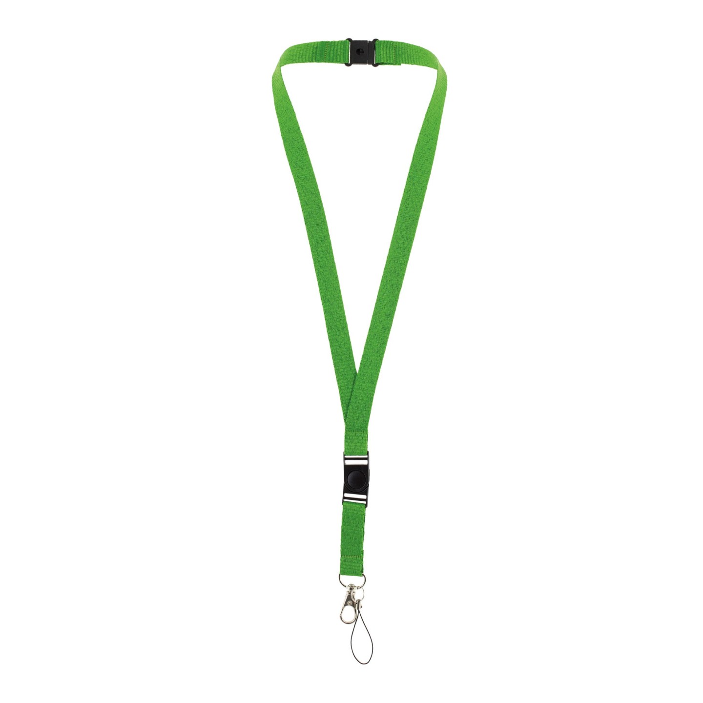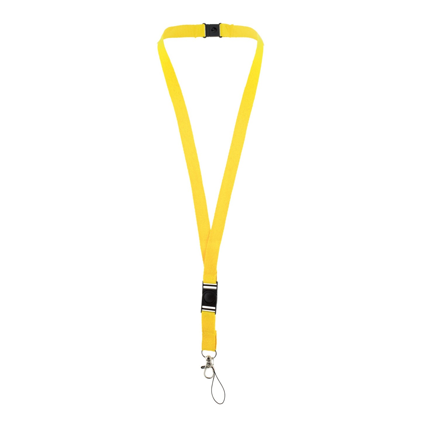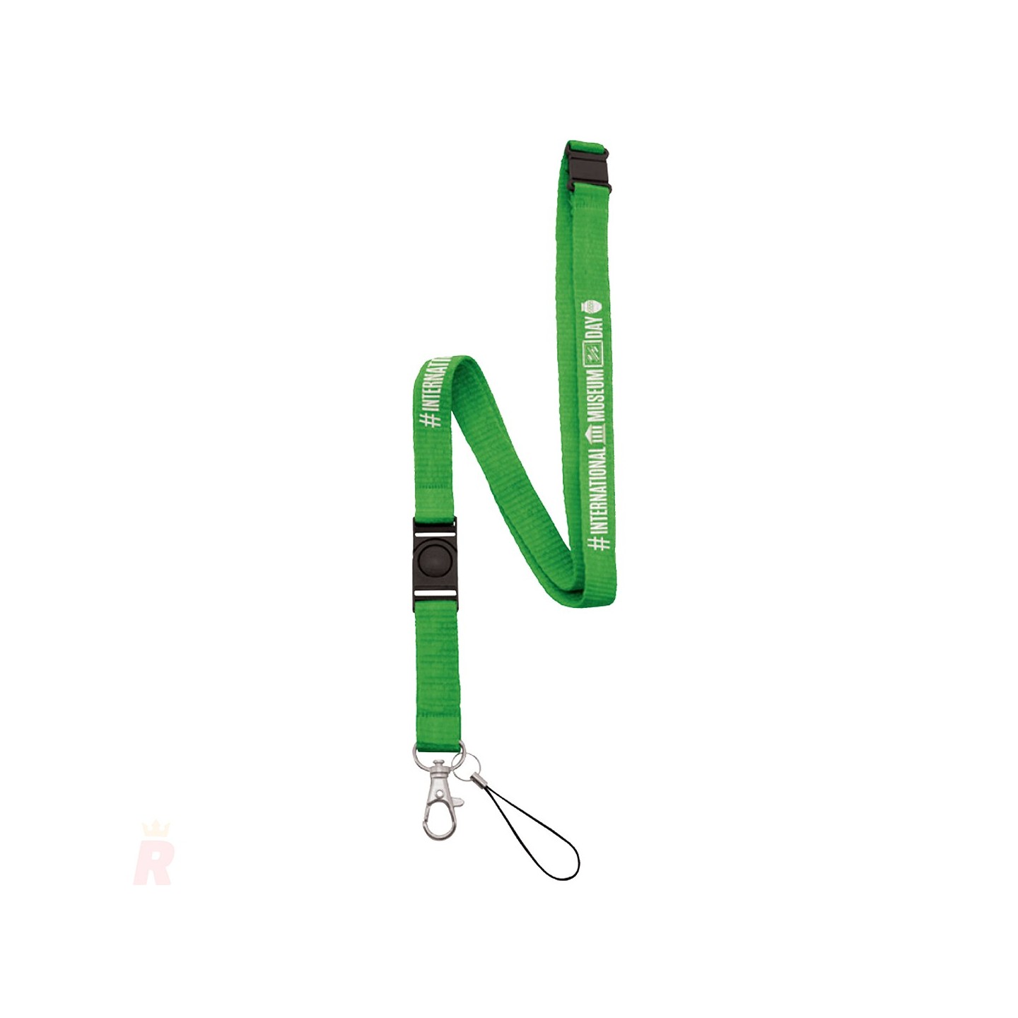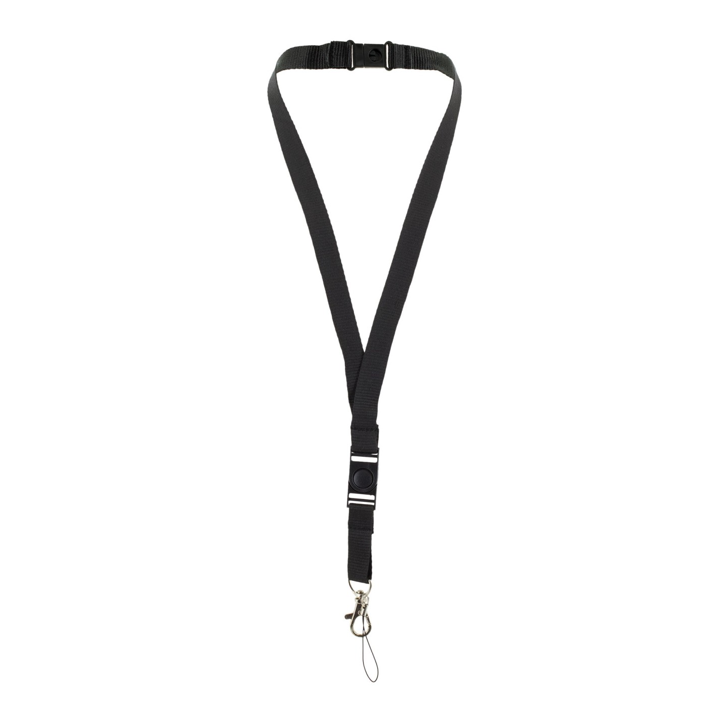 Lanyard doble con cierre de seguridad, fabricado en poliéster con enganches para móvil e identificador. Disponible en varios colores y apto para sublimación en blanco