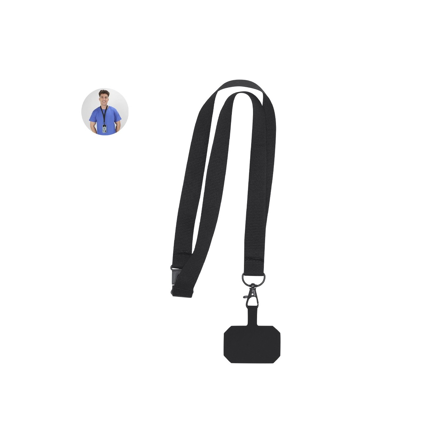 Lanyard soporte de poliéster con mosquetón giratorio, accesorio de seguridad en el cuello y cinta a juego. Personalizable con logotipo, ideal para smartphones.