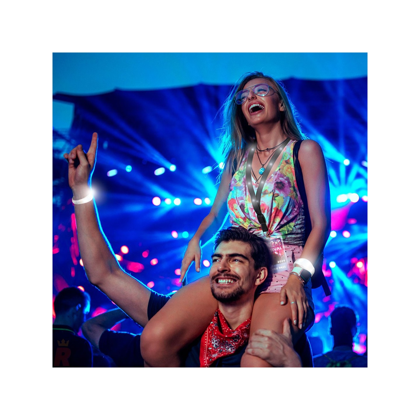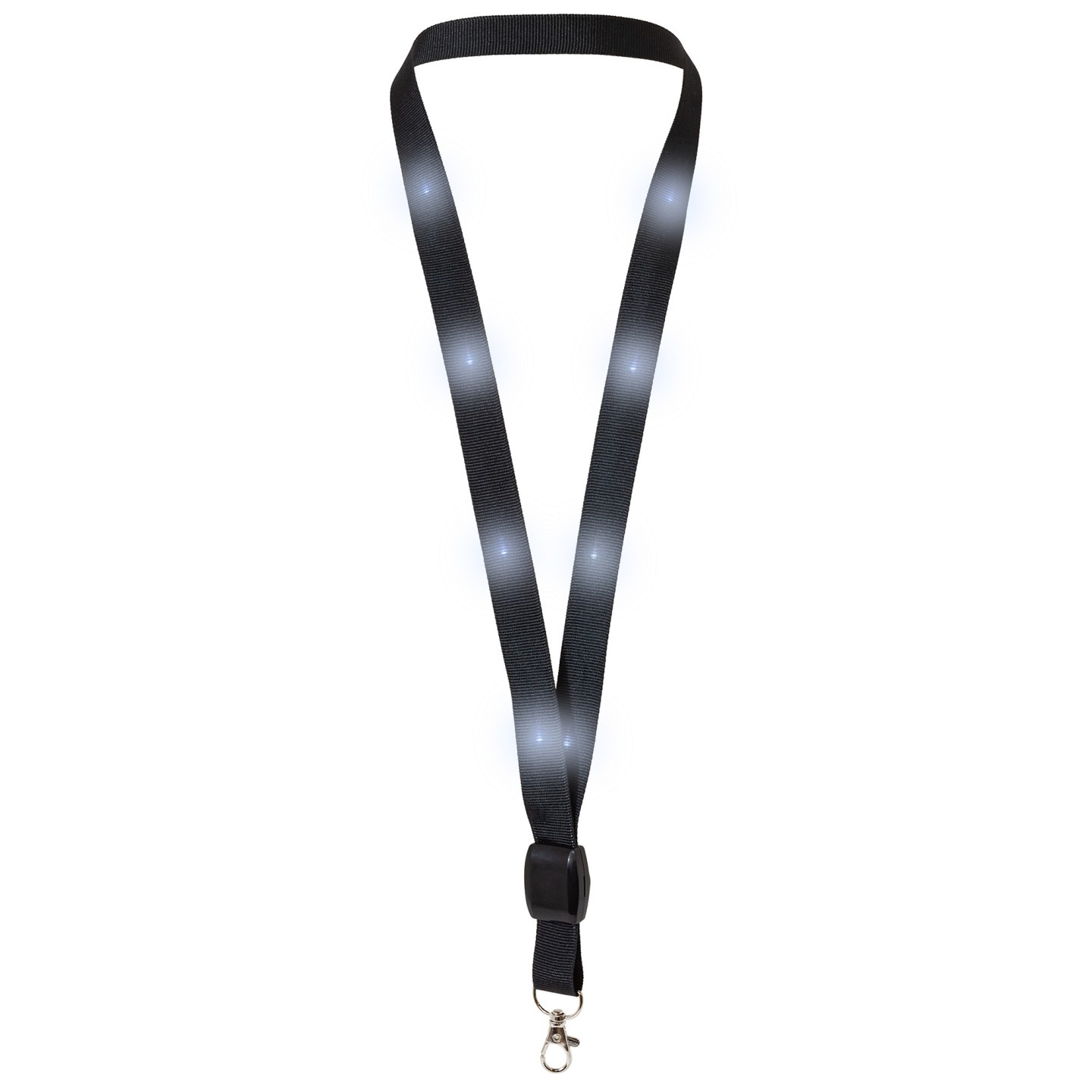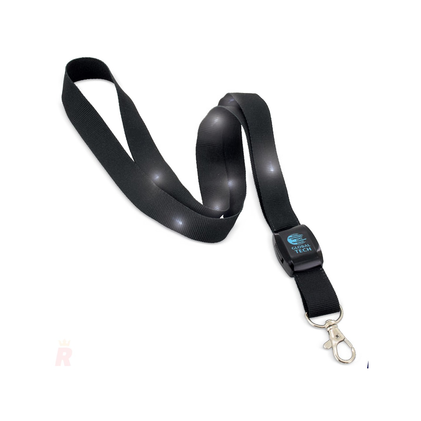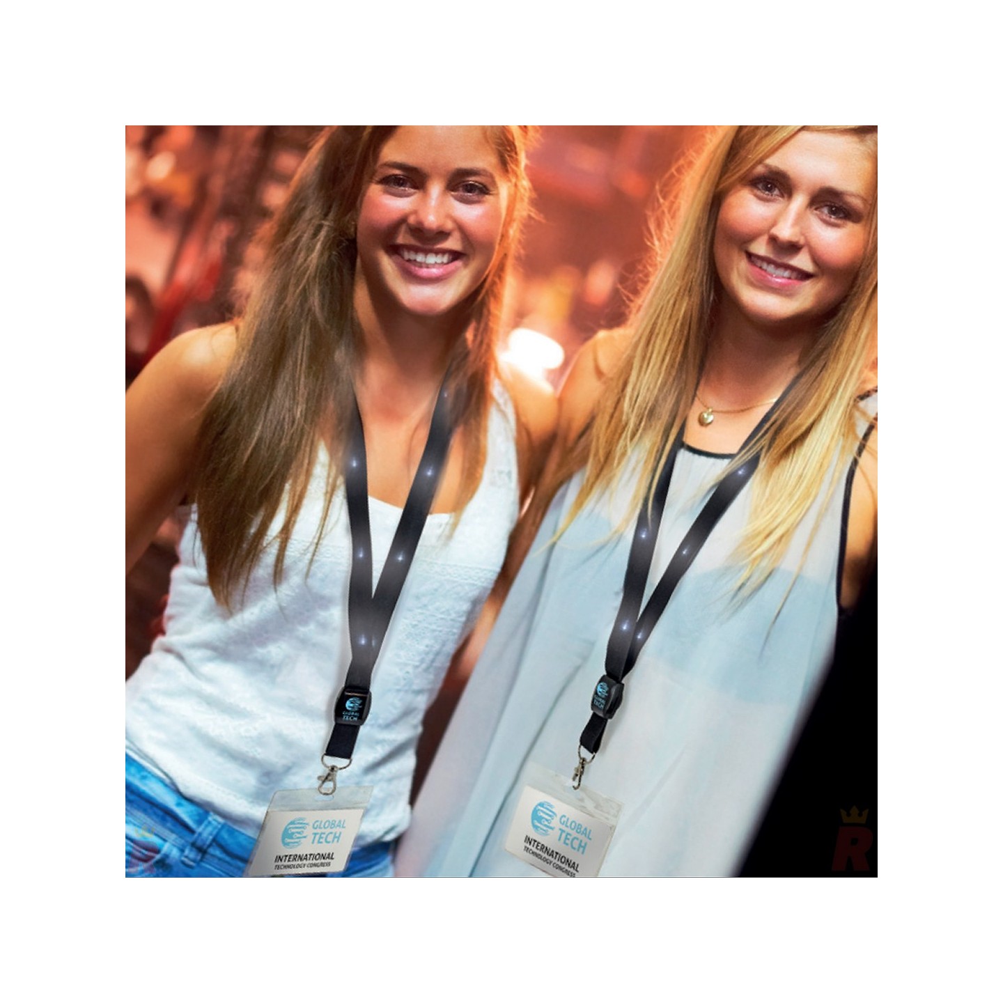 Lanyard VIP luminoso con 8 luces LED y 3 modos de iluminación. Ideal para eventos exclusivos, ferias y conciertos. Disponible en blanco y negro, incluye pilas
