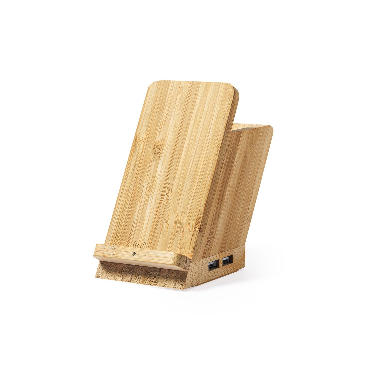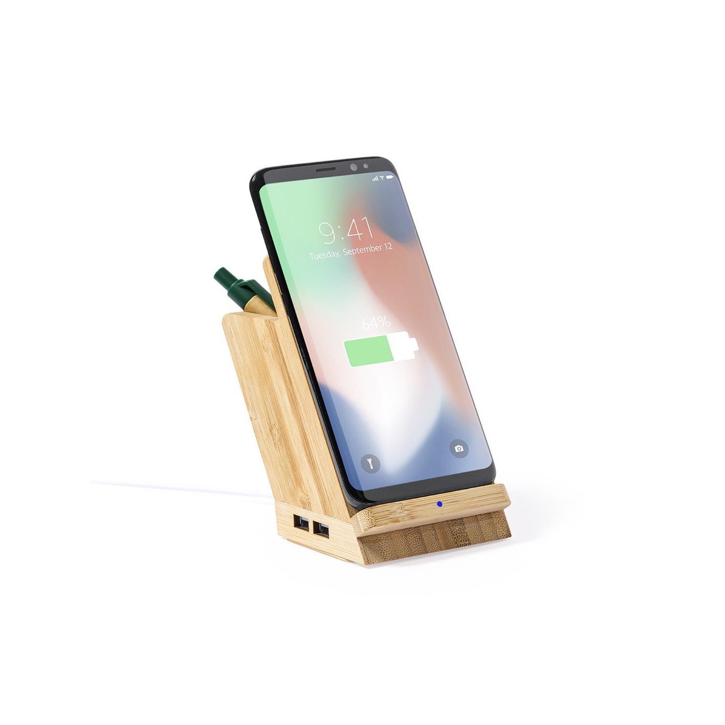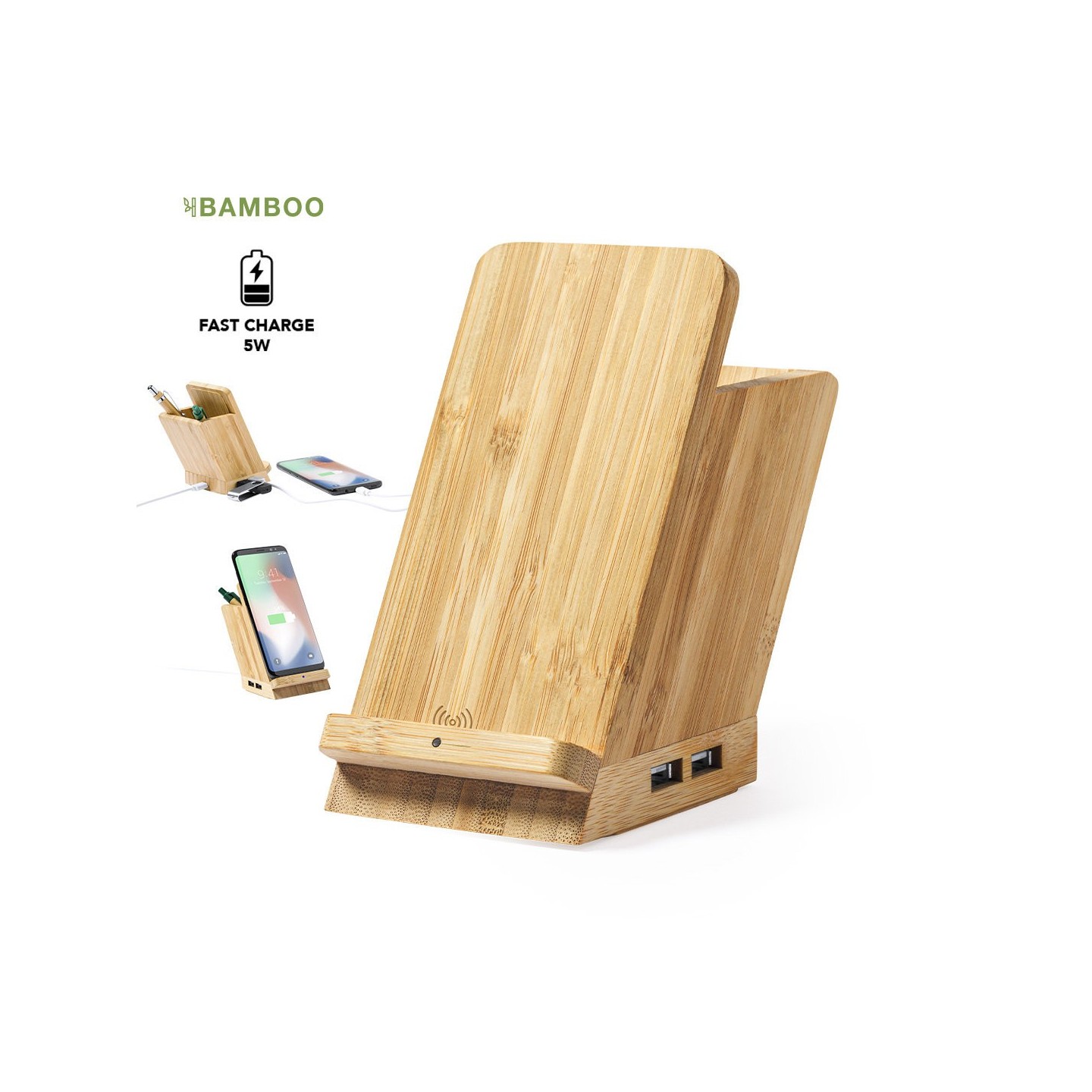 El lapicero multifunción Bloxem está hecho de bambúy además de lapicero, es soporte para smartphone, cargador inalámbrico y puerto USB. ¡Todo en uno para tu comodidad!