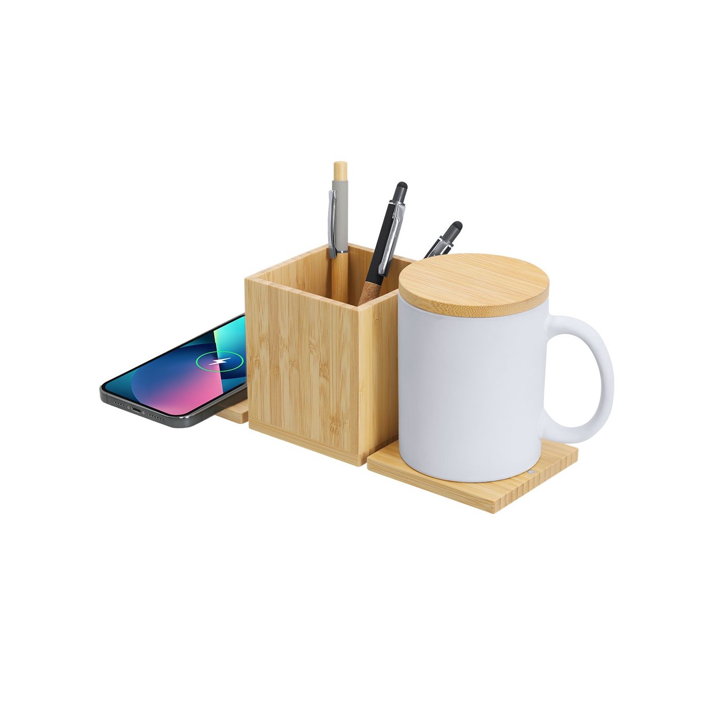 Lapicero multifunción de bambú con calentador de tazas y cargador inalámbrico 15W. Compatible con Qi, incluye cable Tipo C. Personalizable con logotipo.