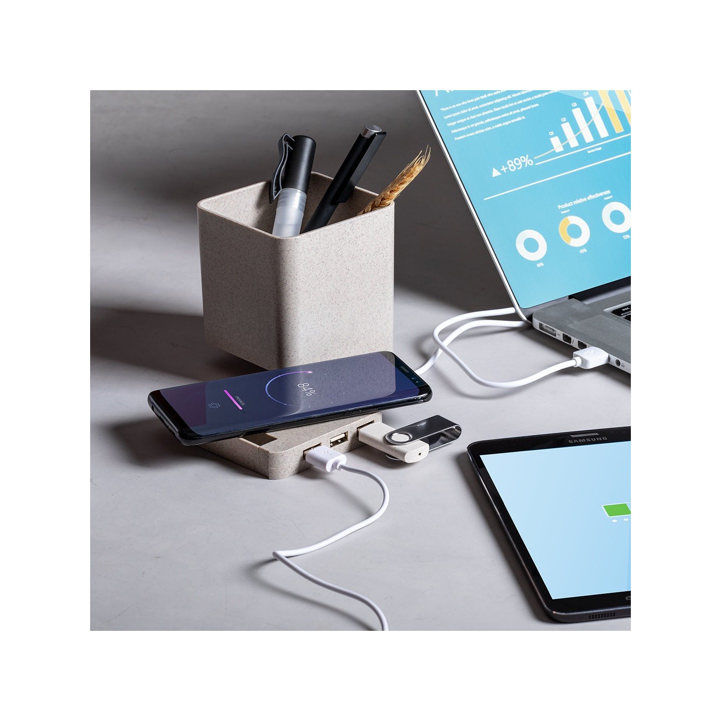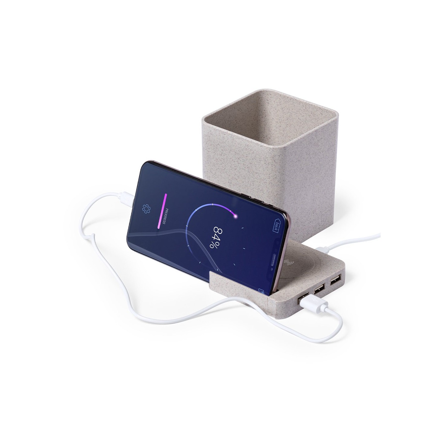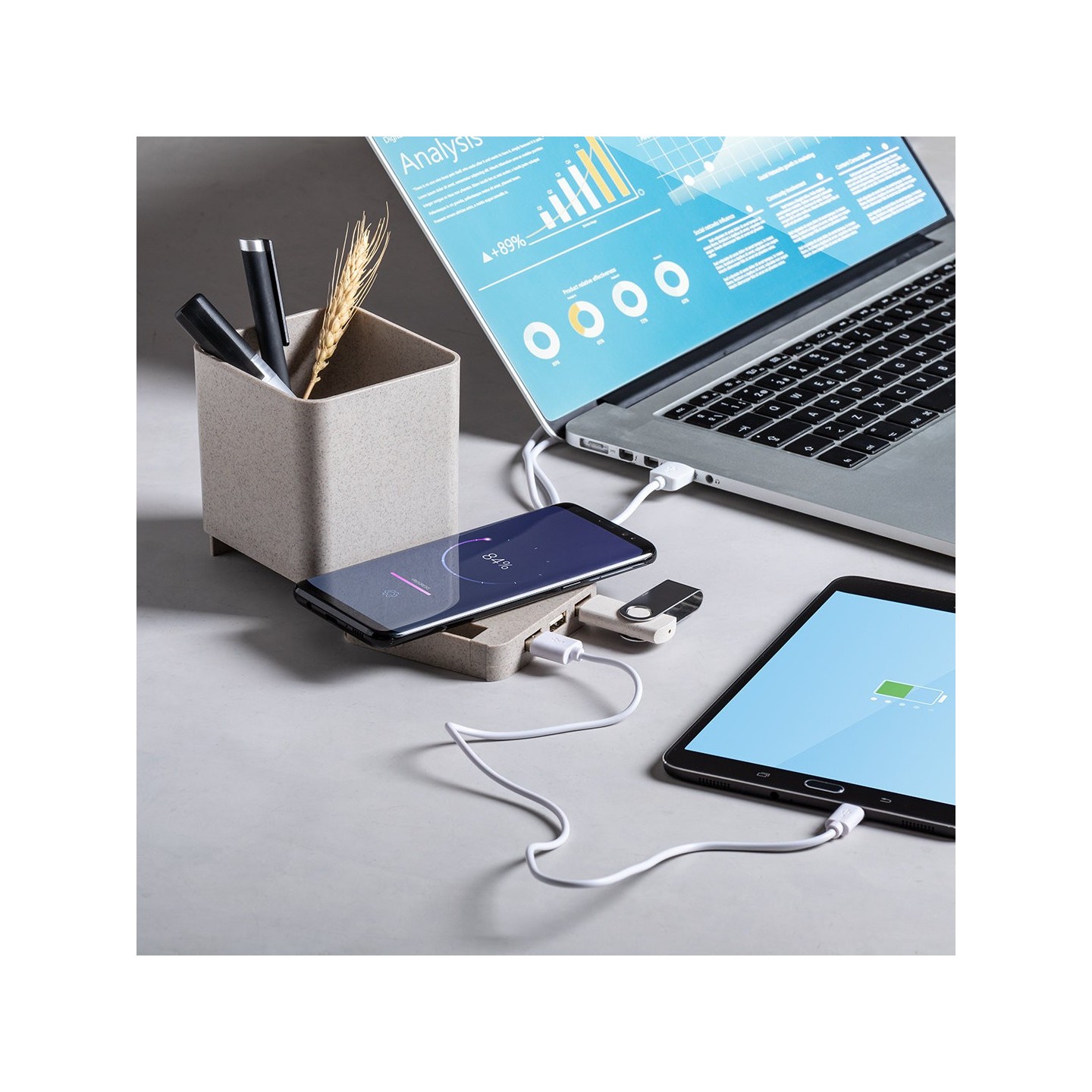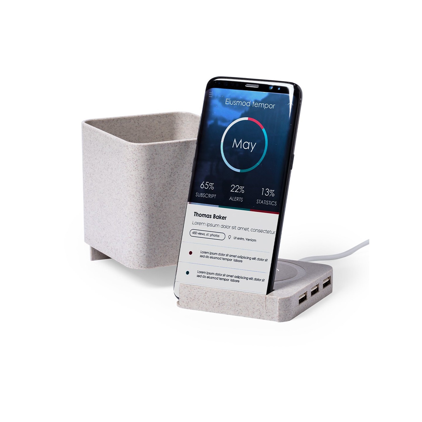 Un lapicero multifunción eco-friendly 4 en 1 de línea nature, fabricado en caña de trigo. Incluye lapicero, soporte para smartphone, cargador inalámbrico y puerto USB.