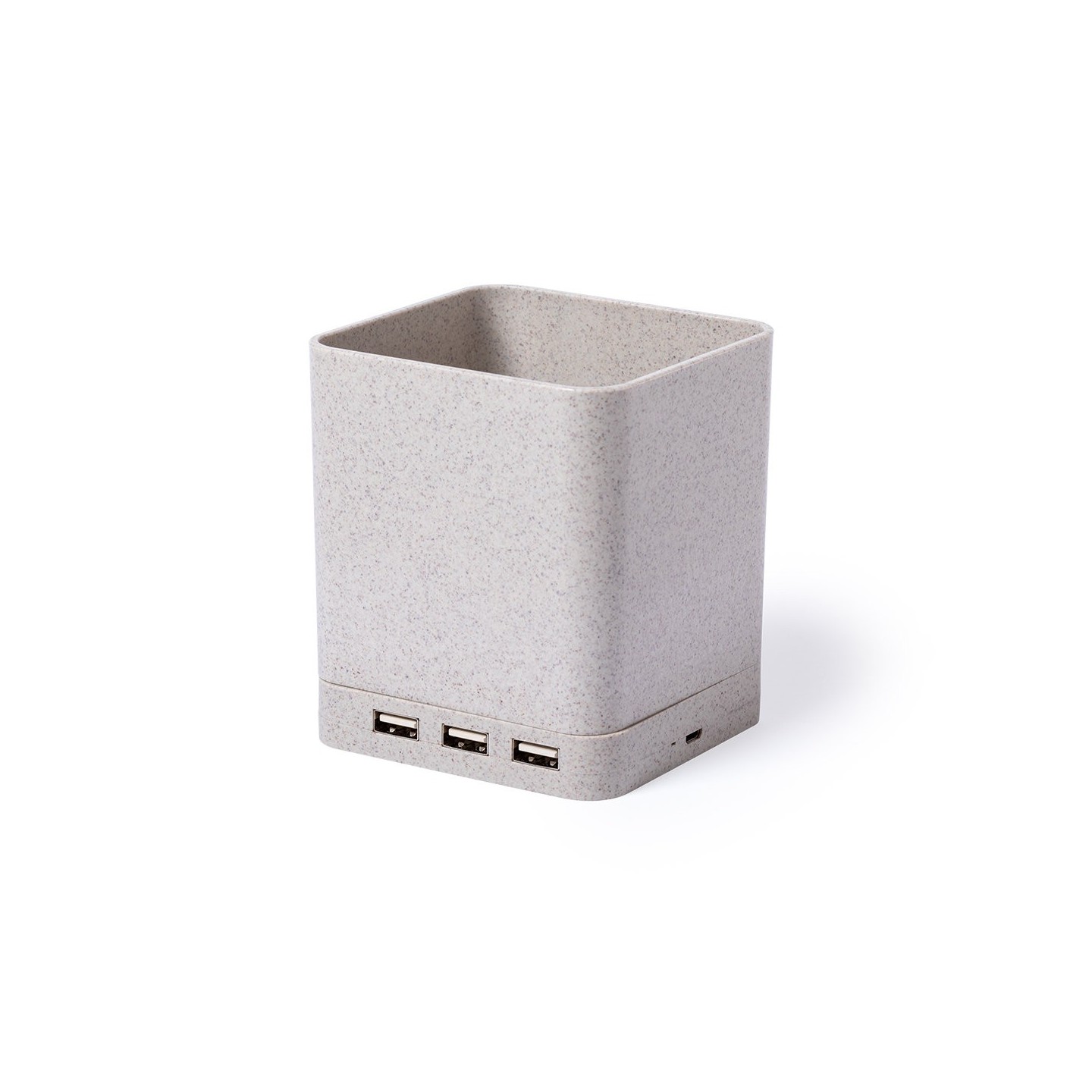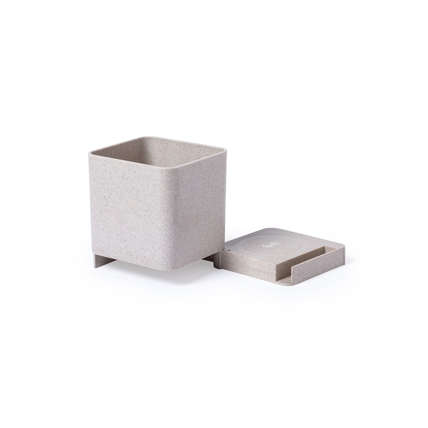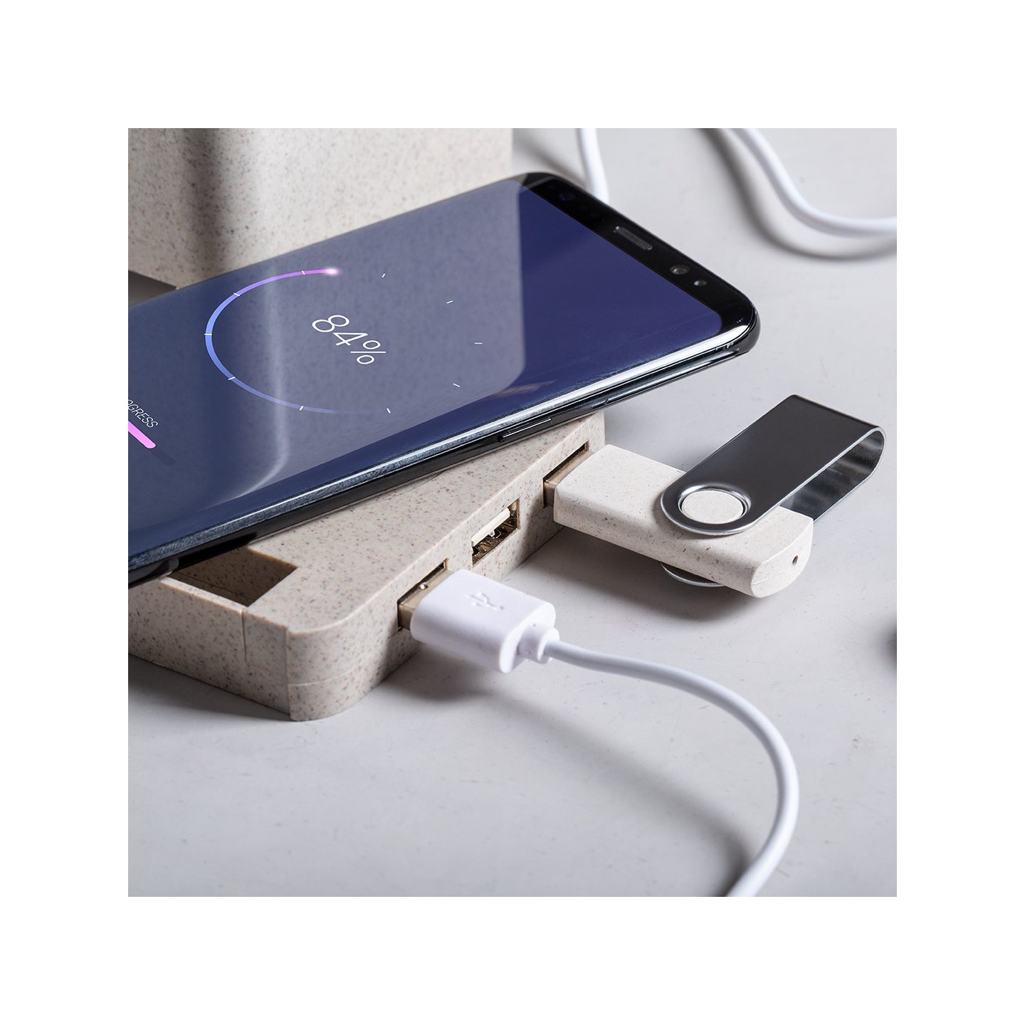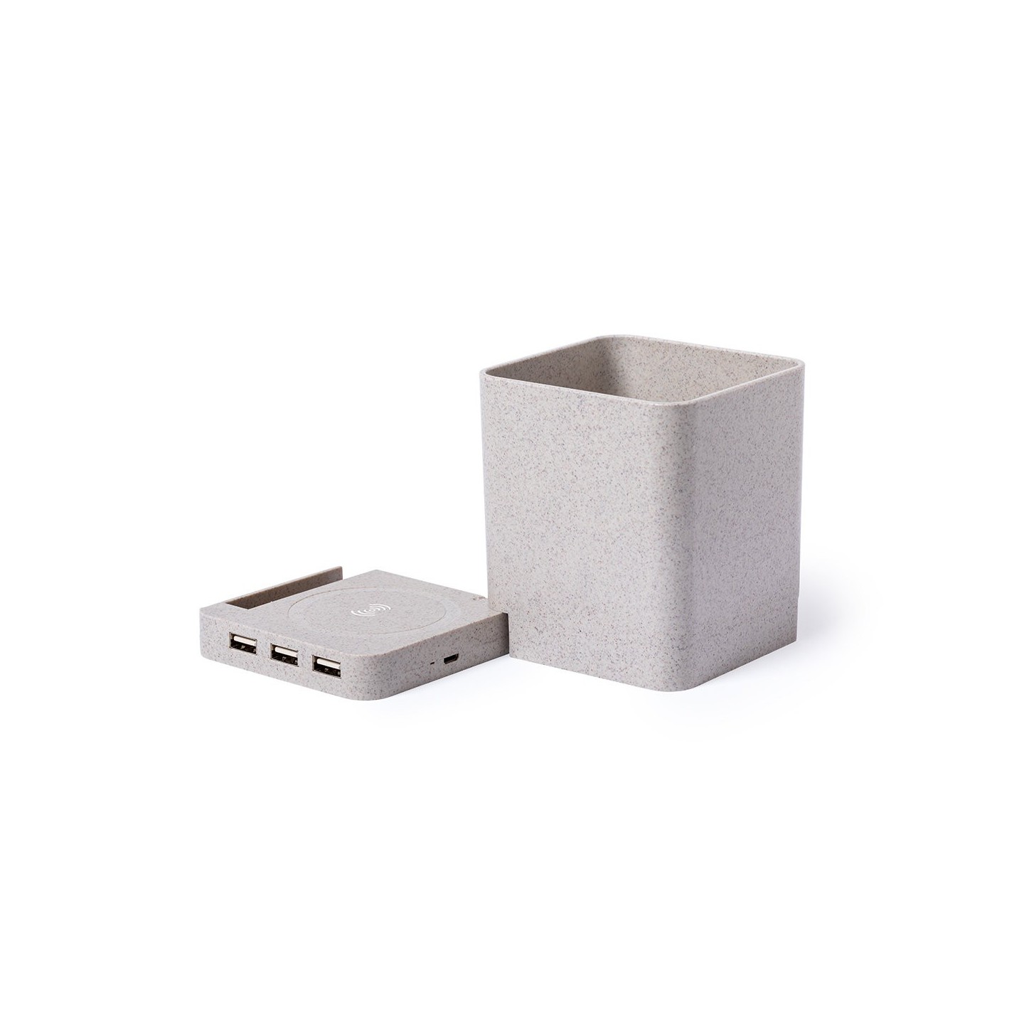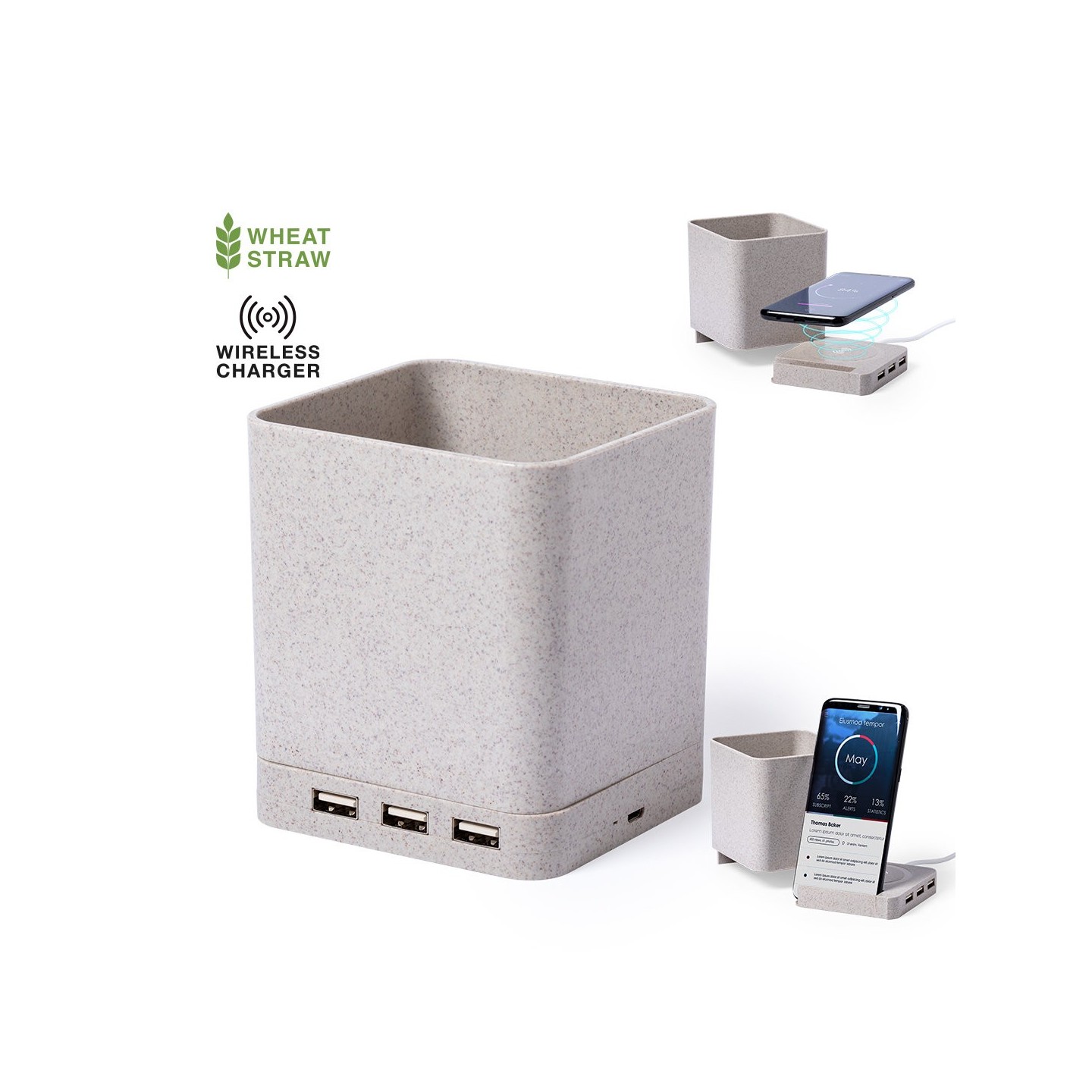 Un lapicero multifunción eco-friendly 4 en 1 de línea nature, fabricado en caña de trigo. Incluye lapicero, soporte para smartphone, cargador inalámbrico y puerto USB.