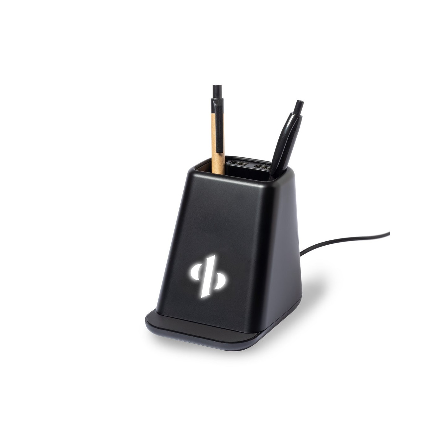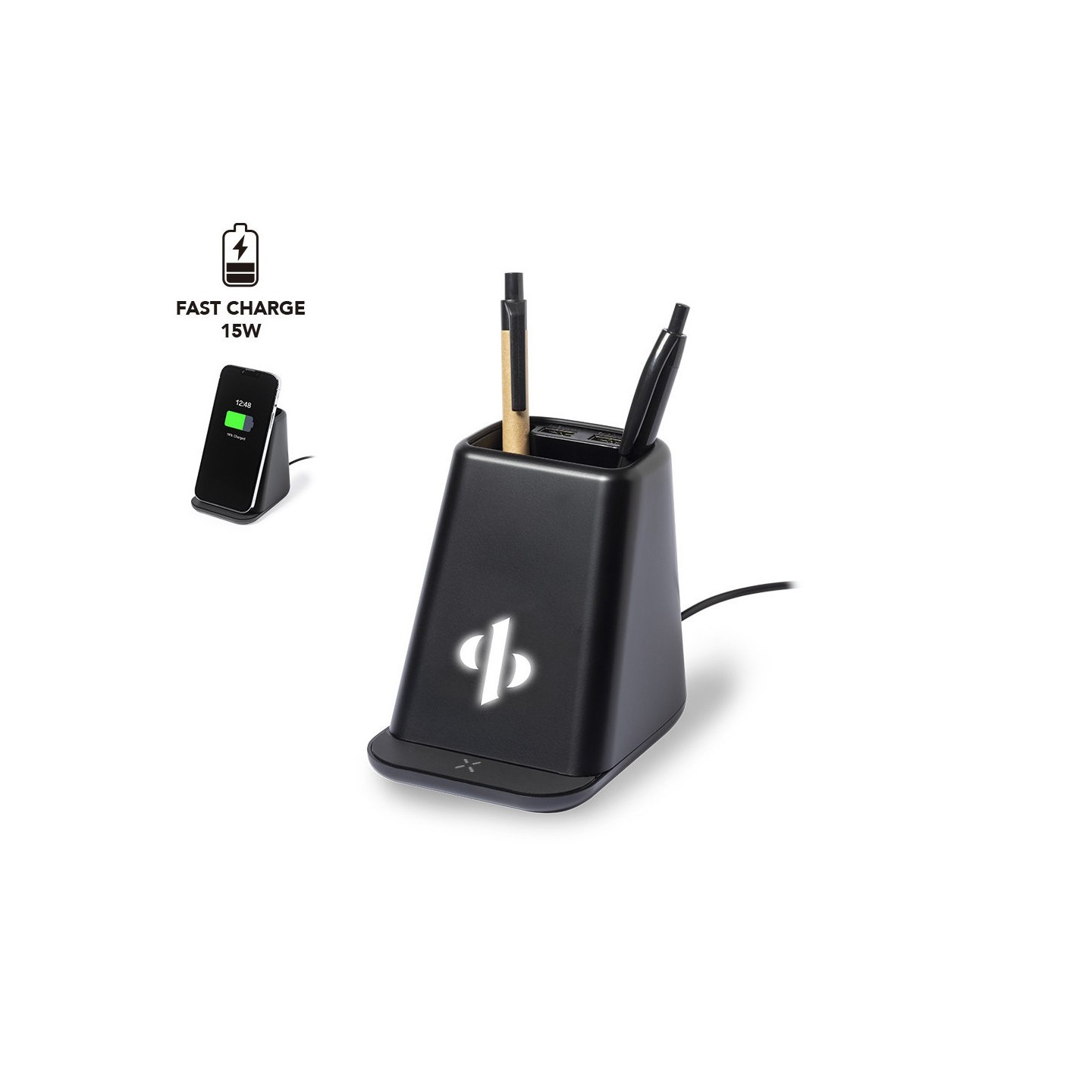 Lapicero multifunción Eddar con luz, carga inalámbrica 15W, soporte para smartphone y 2 salidas USB. Seguro, práctico y elegante para promocionar tu marca.