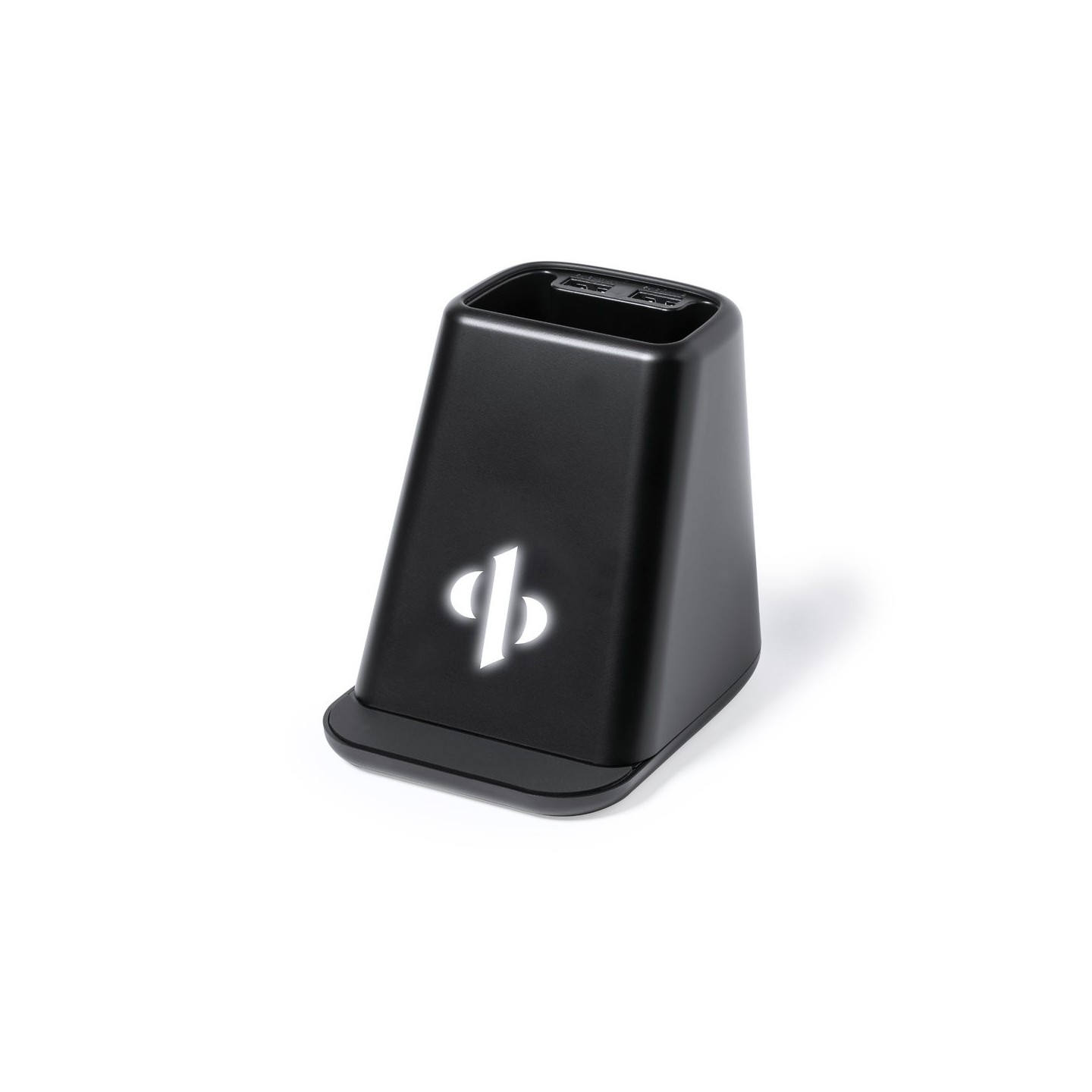 Lapicero multifunción Eddar con luz, carga inalámbrica 15W, soporte para smartphone y 2 salidas USB. Seguro, práctico y elegante para promocionar tu marca.